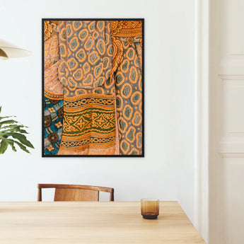 In goldene Eleganz gehüllt, enthüllt dieser gerahmte Leinwand Kunstdruck die prächtige Welt der siamesischen Adeligkeit. Sie blicken auf ein Fragment der thailändischen königlichen Insignien, wo jeder Pinselstrich jahrhundertealte Geheimnisse der vergoldeten Hallen von Ayutthaya flüstert. Die kunstvollen Sabai-Schärpen und Pha-Nung-Röcke faszinieren mit ihren labyrinthartigen Mustern - safranfarbene Ovale tanzen über schiefergraue Seide, während smaragdgrüne Ränder Lotusmotive zur Schau stellen, die in buddhistischer Symbolik verwurzelt sind.