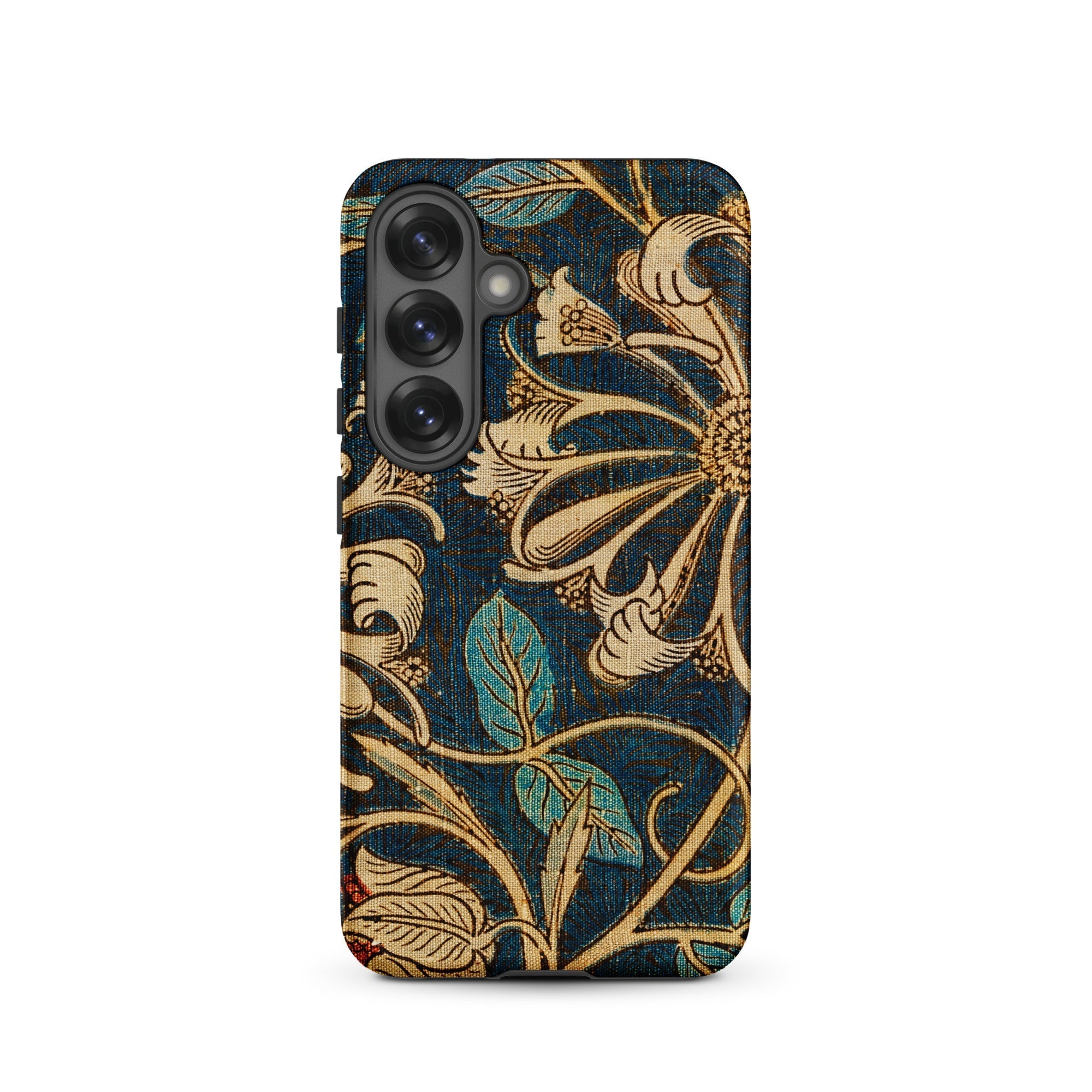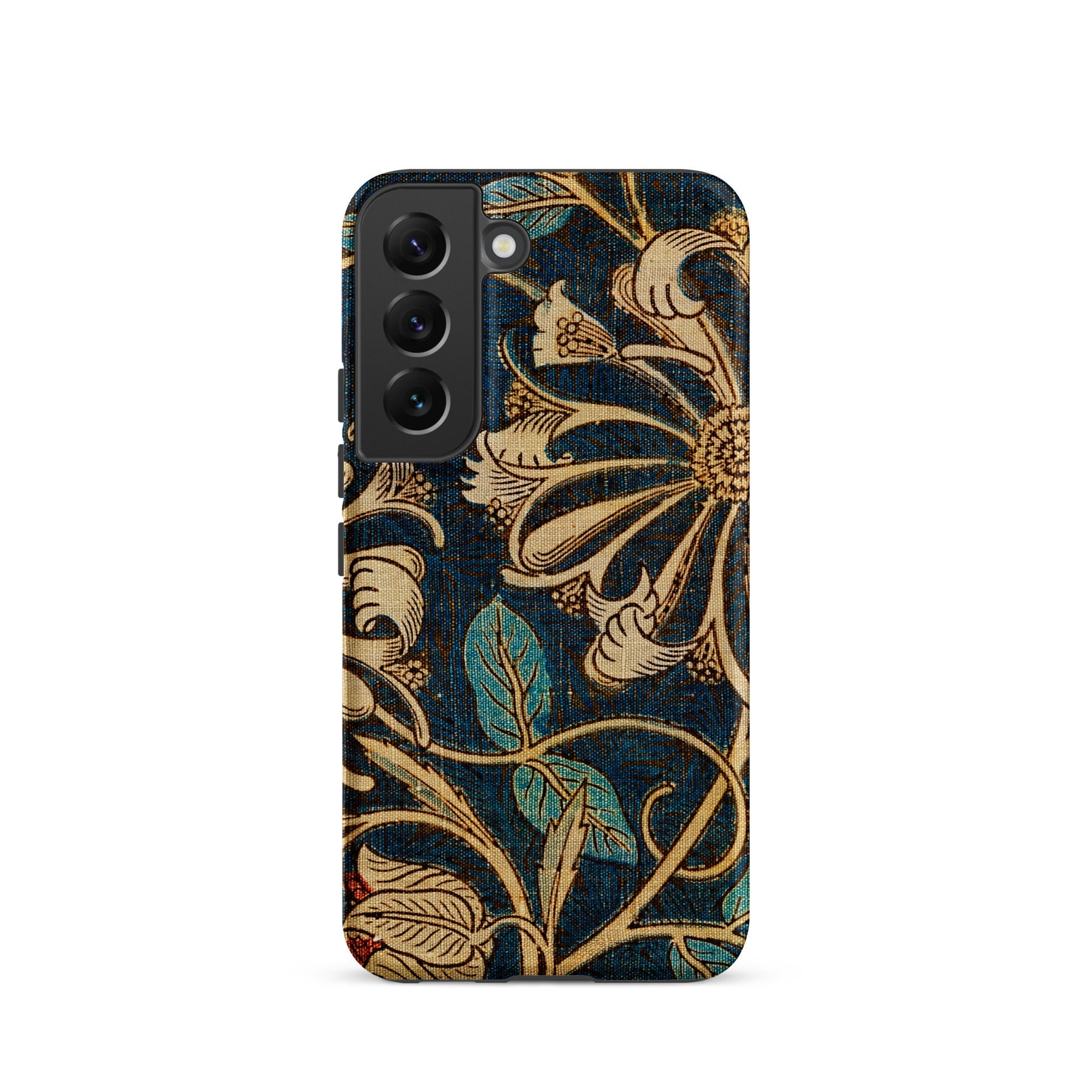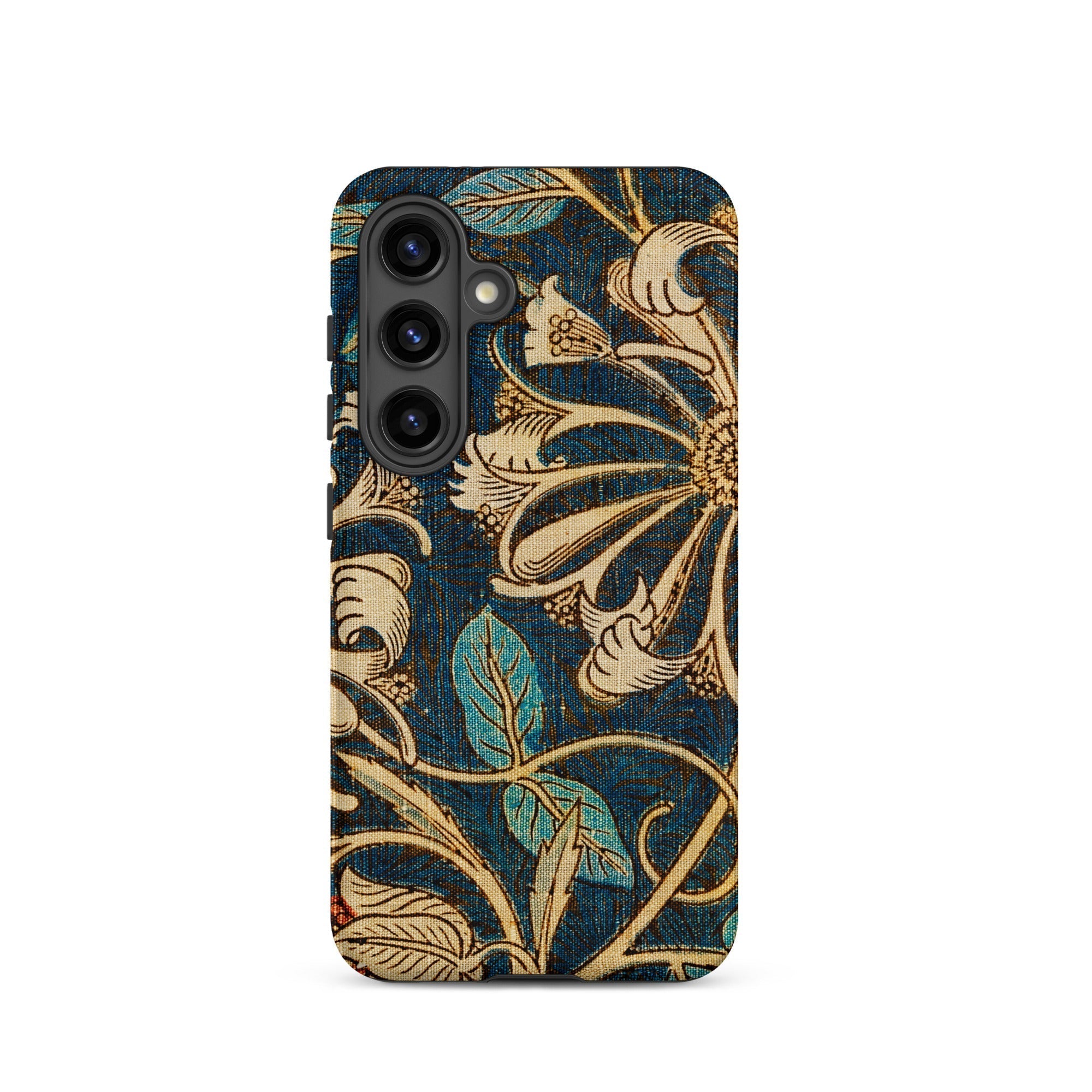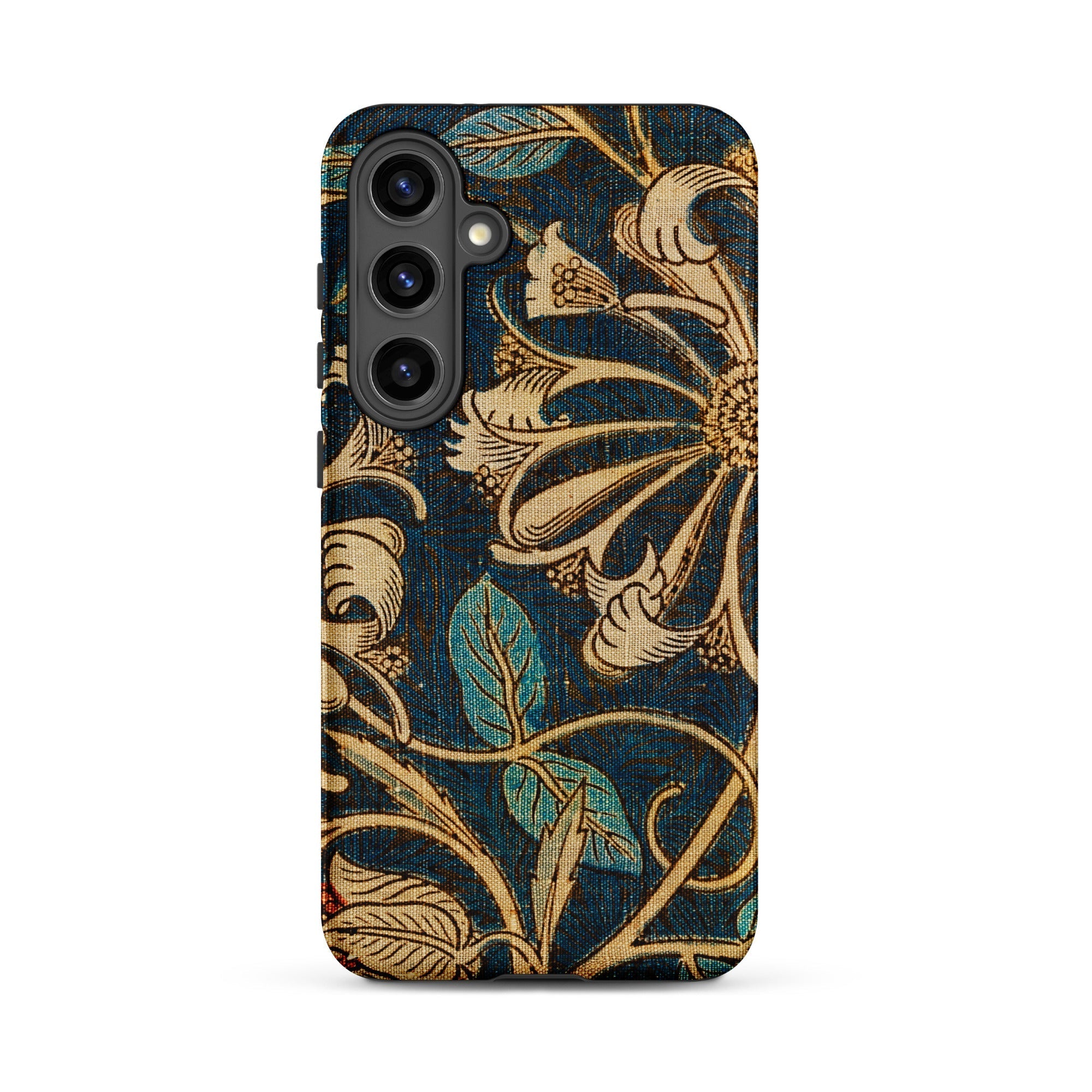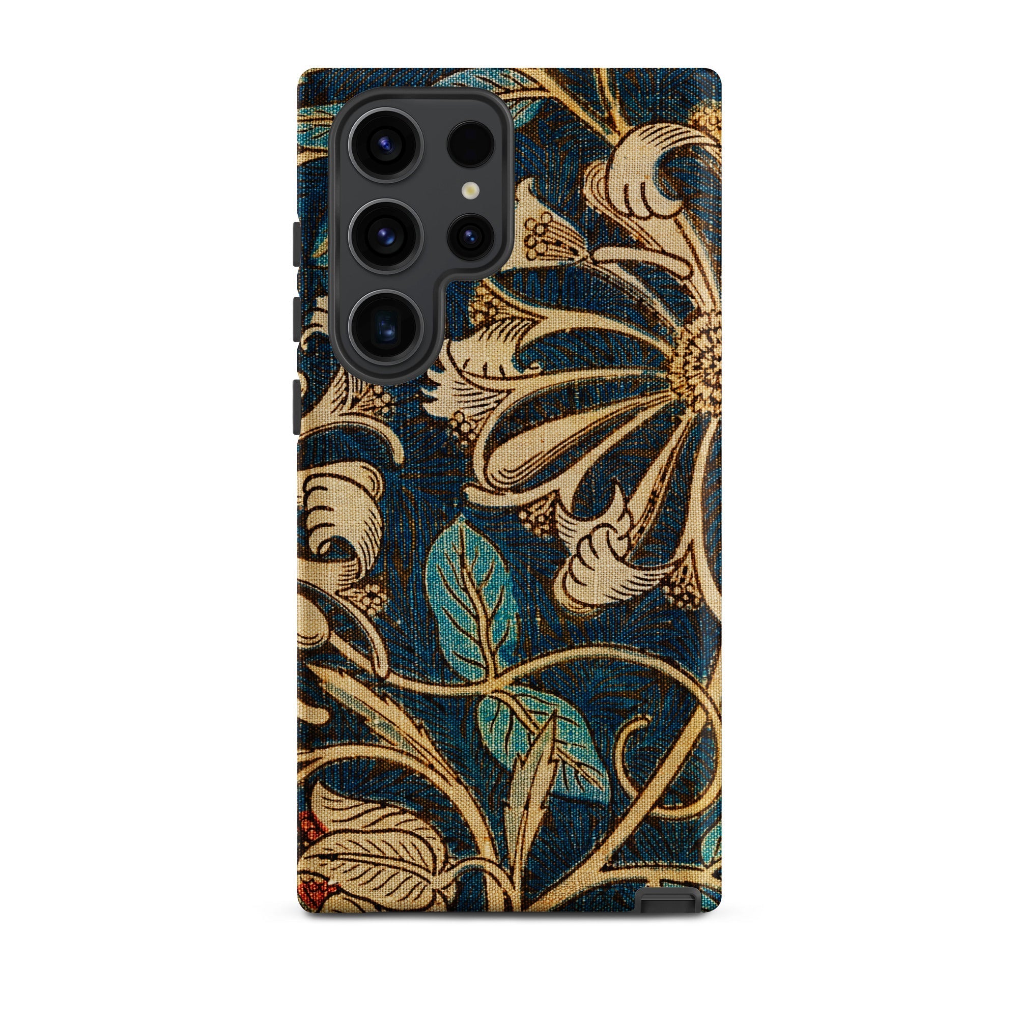 Ein Dämmerungsfeld, das in Stoff gepresst ist, Morris’s Honeysuckle windet sich über das Gehäuse in lockigen ockerfarbenen Stängeln und sonnengebleichten Blüten. Der indigoblaue Grund summt mit Tiefe und trägt bläulich geäderte Blätter wie geheime Karten.