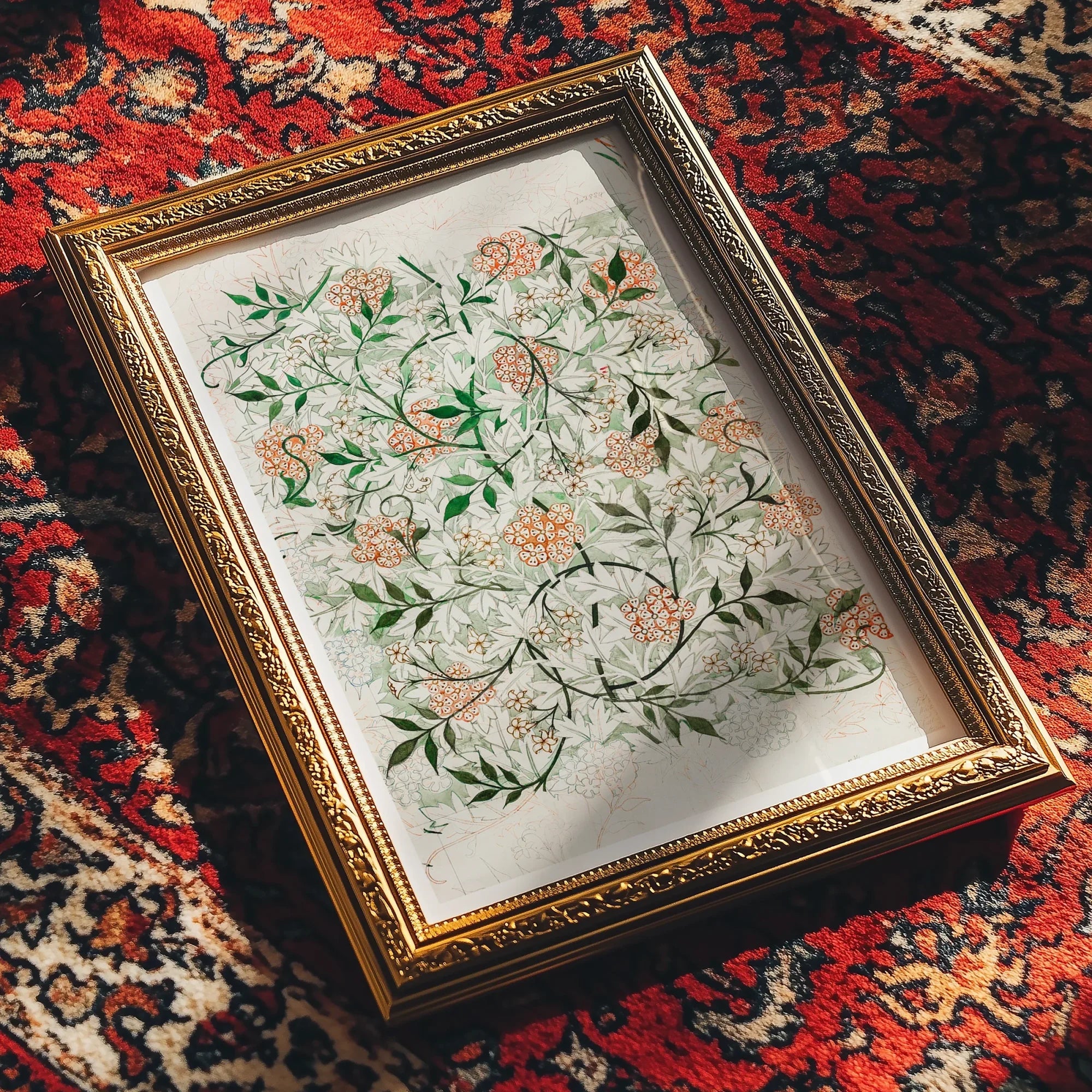 Morris, der florale Zauberer der viktorianischen Ära, beschwört eine gartenbauliche Traumlandschaft, in der korallenfarbene Jasminblüten Pirouette inmitten a Meer von Emerald Laub. Jedes Blütenblatt und Blatt erzählt eine Geschichte über die rhythmische Poesie der Natur, die in der Zeit von Morris 'unvergleichlichem Auge für organische Formen gefroren ist.