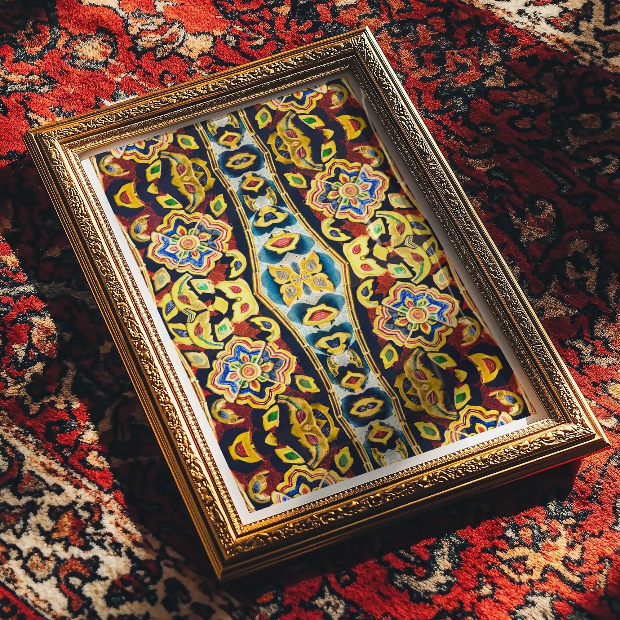 Sie blicken auf eine kaleidoskopische Hommage an die thailändische kulturelle Fusion, wo Sukhothai-Ära-Blumenmotive mit Rattanakosin-Glanz tanzen. Ockerfarbene Mandalas blühen wie Lotusblumen in einem Chao Phraya-Sonnenuntergang, während kobaltblaue Akzente die glasierten Fliesen von Wat Pho widerspiegeln. Erfreuen Sie sich an der symmetrischen Opulenz—es ist reines Theravada-Augenschmaus.