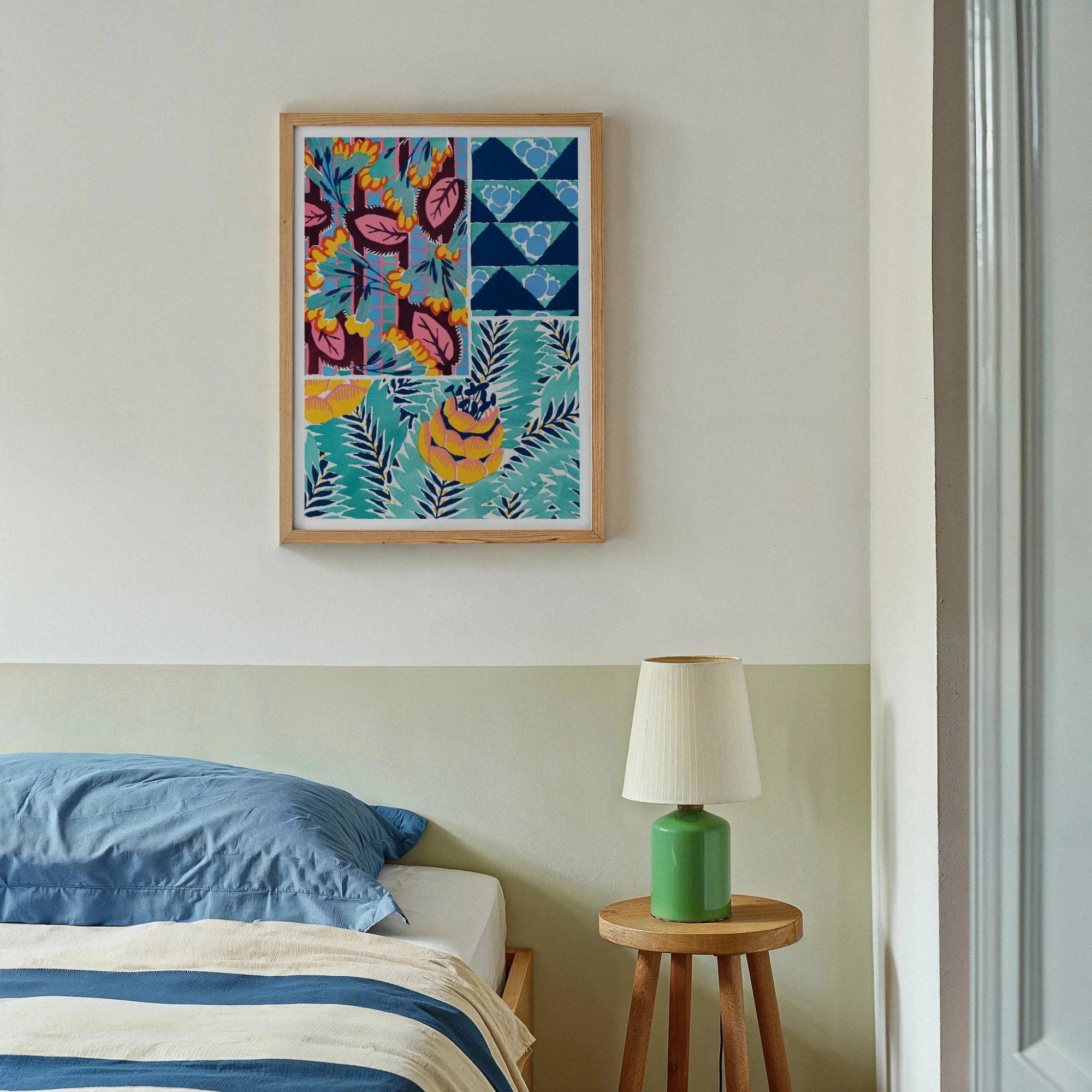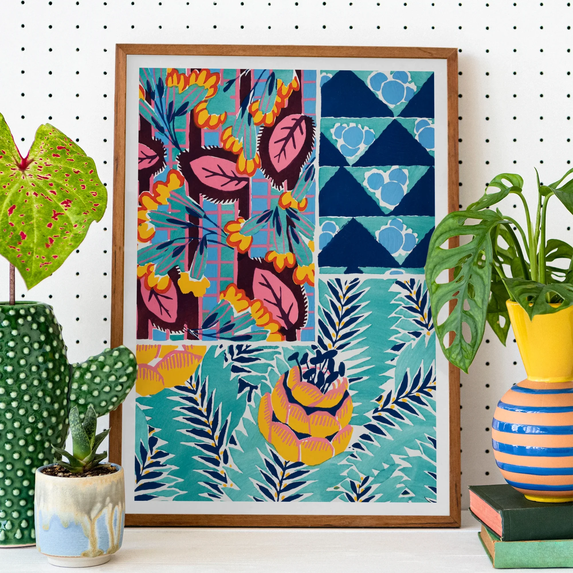 Dieser Druck wird nicht nur dekorieren. Es wird erziehen und inspirieren. Der Hintergrund von Séguy in Entomology verleiht jedes stilisierte Blatt und jede Blume mit wissenschaftlicher Genauigkeit und verwandelt Ihren Raum in eine kuratierte Galerie natürlicher Wunder. Die kühne Farbpalette - von elektrischem Türkis bis hin zu lodernden Orangen - fängt den Zeitgeist einer Gesellschaft ein, die chromatische Innovation umfasst.