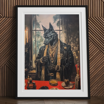 Dies ist kein Wandkunst; es ist eine Beschwörung. Ein leises Donnern des Mythos, das zum Leben erweckt wird. Du bist nicht länger ein Beobachter - Anubis ruft dich näher, in den Schoß seiner rätselhaften Welt, wo Leben und Tod im sanften Kerzenschein verschmelzen, wo ein Gott, gekleidet wie ein Gentleman, darauf wartet, seine Geheimnisse bei einem anderenweltlichen Fest zu erzählen... wenn du nur zuhörst.