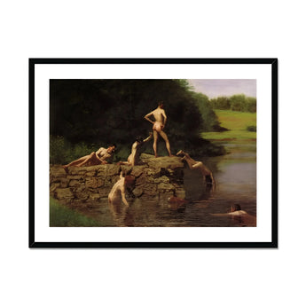 Thomas Eakins' "The Swimming Hole" fängt einen Moment der ruhigen, aber dennoch robusten Männlichkeit ein. Dieses bahnbrechende Werk wird oft als Eakins' Höhepunkt in der Aktfigur-Malerei gepriesen. Ein Meisterwerk der Öl-auf-Leinwand-Kunst des schwulen Verlangens, zeigt es sechs Männer, darunter der Künstler selbst, die in der natürlichen Intimität eines abgelegenen Sees versunken sind. Die Komposition ist eine Feier der männlichen Form, dargestellt mit exquisiter Aufmerksamkeit für anatomische Präzision und Flüssigkeit. Die erdigen Töne der Figuren kontrastieren lebhaft mit der üppigen Landschaft, wodurch ein dynamisches Zusammenspiel von Licht und Schatten entsteht.