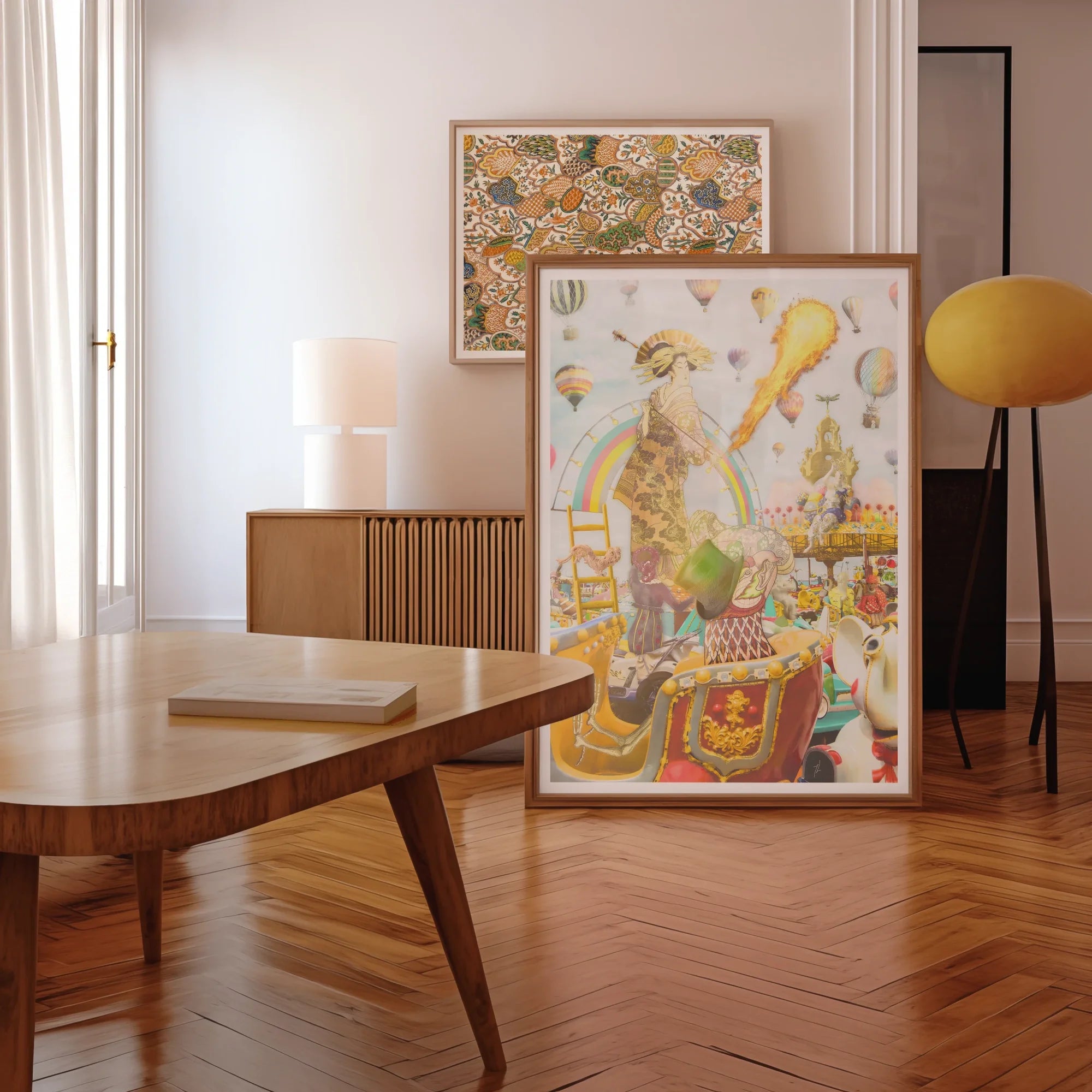 Diese neo-surrealistische Collage zerschmettert den vergoldeten Käfig von Orientalist Fantasie. Ein feuriger Komet fließt über den Pastellhimmel und symbolisiert Madame Fireflys triumphale Neuerfindung. Lassen Sie diese Reproduktion in Museumsqualität Ihre Mauern in ein Portal verwandeln, in dem East in einer aufrührerischen Feier der Selbstbestimmung nach Westen trifft.