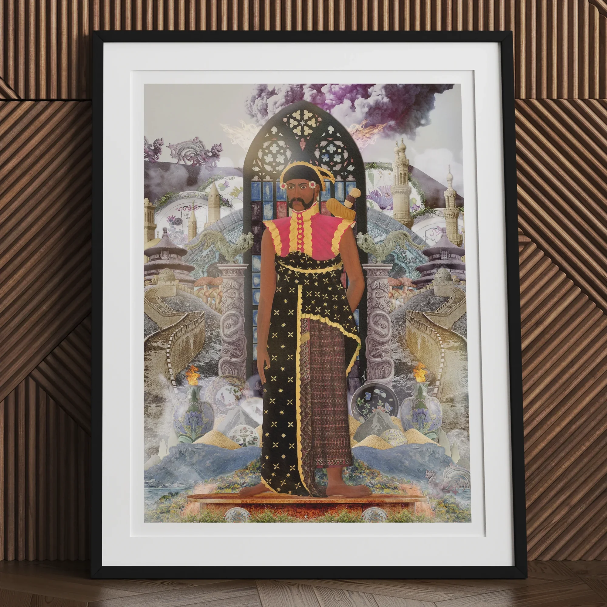 Begib dich auf eine phantasmagorische Reise mit diesem Silk Rodeo Kunstdruck. Du wirst in ein Reich versetzt, in dem javanische Eleganz auf globales Chaos und Konfektion trifft. Eine königliche Gestalt, gekleidet in lebendiger Pracht, steht Wache inmitten eines wirbelnden Strudels kultureller Kollisionen in Regenbogentönen.