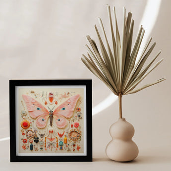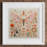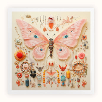 Das Herzstück - ein majestätisches Rosa Schmetterling Mit Azure -Augenflecken - Aufmerksamkeit der Aufmerksamkeit, umgeben von einer taxonomischen Reihe von fantastischen Insekten und Flora. Jedes Element, vom lebendigen orangefarbenen Sonnenburst bis zu den zarten blauen Spiralen, wird mit sorgfältigem Detail gerendert, wodurch eine visuelle Symphonie erzeugt wird, die traditionelle Vorstellungen von biologischer Klassifizierung in Frage stellt.