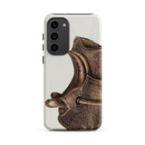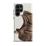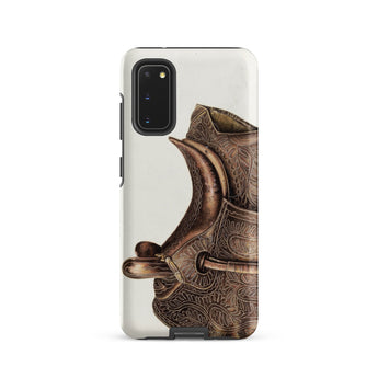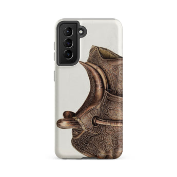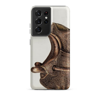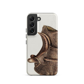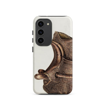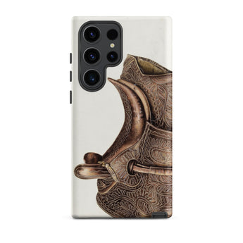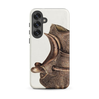 Dieses Samsung-Case rahmt Semples Illustration mit archivarischer Präzision, der gedämpfte Creme-Hintergrund hält das Design wie Pergament, das einst in einer Meisterwerkstatt für Sattler ausgerollt wurde. Die Form fühlt sich schwer an mit viktorianischer Reitkultur, evoziert Eleganz im Damensattel, Damenjagden und die Pracht von Zaumzeug und Steigbügel.