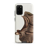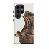 Ein taktiles Fest für Liebhaber antiken Zaumzeugs, historischer Reitkunst und tragbarer Kunst. Dieser alltägliche Schatz schützt Ihr Telefon mit der gleichen stillen Gelassenheit, die einst einen Reiter auf einem galoppierenden Pferd beruhigte.