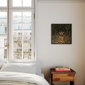 Dies ist mehr als ein Porträt—es ist ein Hymnus auf die Transformation. Hyperreale Pinselstriche dunkler Haut leuchten gegen einen Abgrund aus tiefem Grün, während botanischer Surrealismus durch jedes Blatt und jede Blüte pulsiert. Hier schmückt die Natur nicht; sie spricht, sie beansprucht, sie krönt. Die Symmetrie der Zwillingshaftigkeit biegt die Realität, ein Echo einer vergessenen Magie, wo Identität sich wie eine ungezähmte Blume entfaltet.