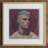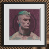 Dieser auffällige Porträt-Druck fängt die Essenz der schwulen Cyberpunk-Ästhetik ein und verbindet traditionelle Porträtkunst mit futuristischen Elementen.