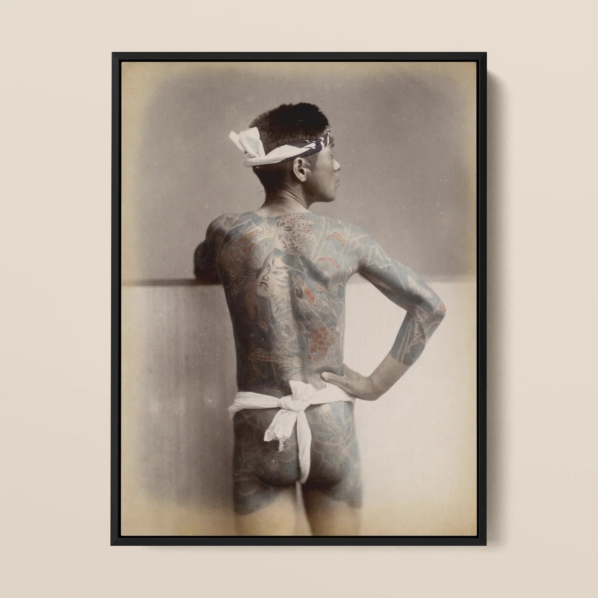 Die Oberfläche des Körpers wird zu einer epischen Schriftrolle, eingraviert mit Drachen und sich windenden Schlangen - jede Schuppe ein Fragment der ewigen schwebenden Welt. Der Mann steht, eine Hand auf die Kurve seiner Hüfte gelegt, die andere greift den Rand der unsichtbaren Mauer der Geschichte. Blaue, rote und ockerfarbene Tinten kollidieren über die Haut wie das Kräuseln des Wassers in Edos Vergnügungsvierteln, wo tätowierte Körper einst im rauchgetränkten Flackern des Laternenlichts miteinander vermischten.