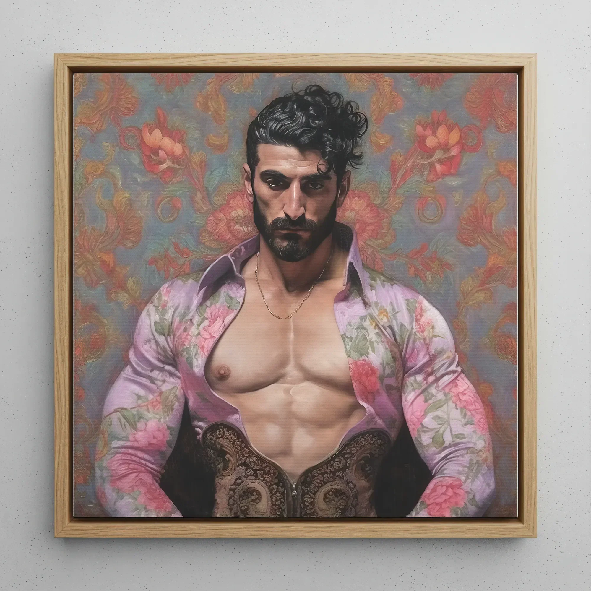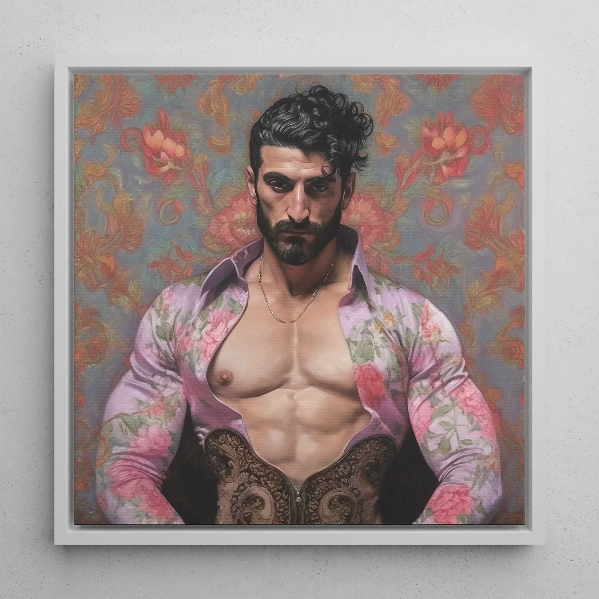 Der spanische Matador atmet mit Widerspruch. Sein offenes Blumenshirt-Kunstwerk mildert das verhärtete Archetypus, während das aufwendig bestickte Korsettgemälde die zeremonielle Pracht der Stierkampfarena in Erinnerung ruft. Dies ist kein gewöhnlicher männlicher Kunstdruck—es ist Rebellion in Seide gewebt, Verwundbarkeit in Stahl gesäumt.