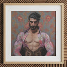 Alonso ist ein robust gutaussehender Mann mit zerzaustem dunklem Haar und durchdringenden Augen. Er blickt intensiv durch den Rahmen, sein gemeißelter Oberkörper teilweise unter einem offenen Blumenhemd in sanften Lavendeltönen freigelegt. Der Kontrast zwischen zarten Blüten und seinem muskulösen Körper schafft eine fesselnde Spannung zwischen Stärke und Verletzlichkeit.