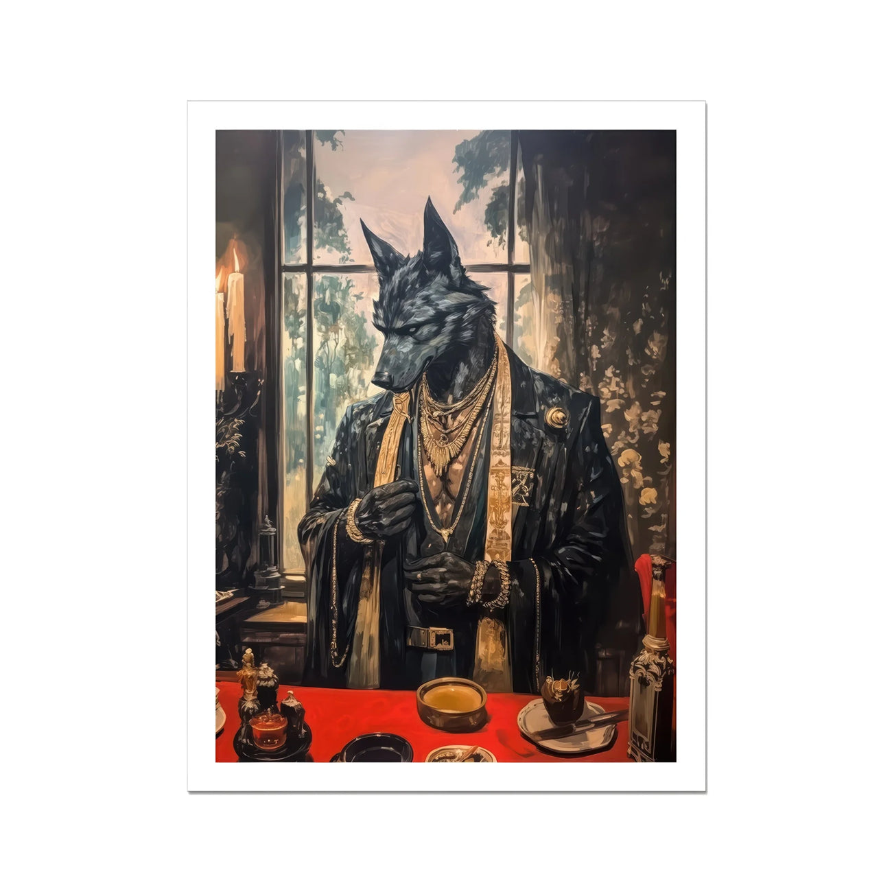 Dies ist kein Wandkunst; es ist eine Beschwörung. Ein leises Donnern des Mythos, das zum Leben erweckt wird. Du bist nicht länger ein Beobachter - Anubis ruft dich näher, in den Schoß seiner rätselhaften Welt, wo Leben und Tod im sanften Kerzenschein verschmelzen, wo ein Gott, gekleidet wie ein Gentleman, darauf wartet, seine Geheimnisse bei einem anderenweltlichen Fest zu erzählen... wenn du nur zuhörst.