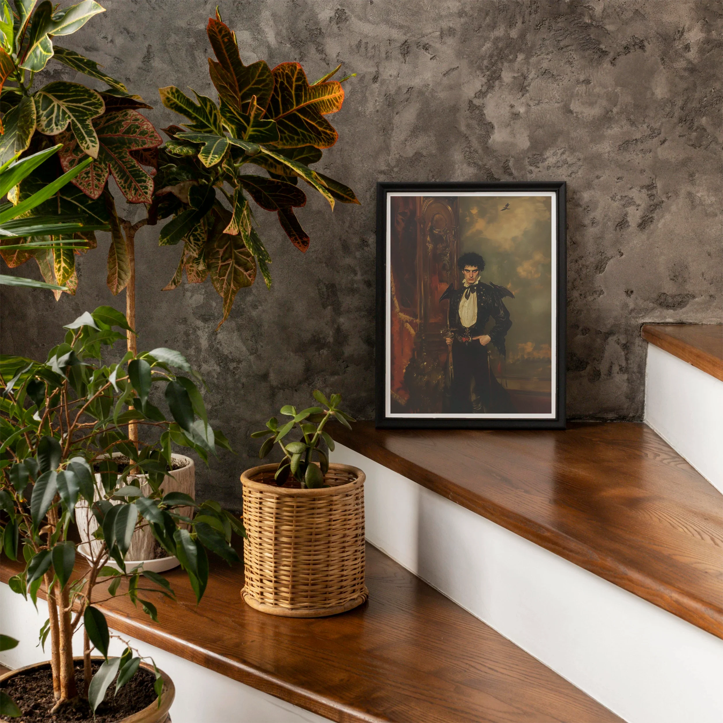 Armands fledermausartige Flügel ruhen an seinen Schultern wie stille Vorboten des Untergangs. Sie strahlen eine Spannung zwischen Macht und Verletzlichkeit aus, unterstrichen von seinem hispanischen Vampir-Erbe. Die gotische Vampir-Mythologie atmet durch jeden Schatten, jede Falte in seiner Kleidung und jeden gequälten Ausdruck in seinem durchdringenden Blick.