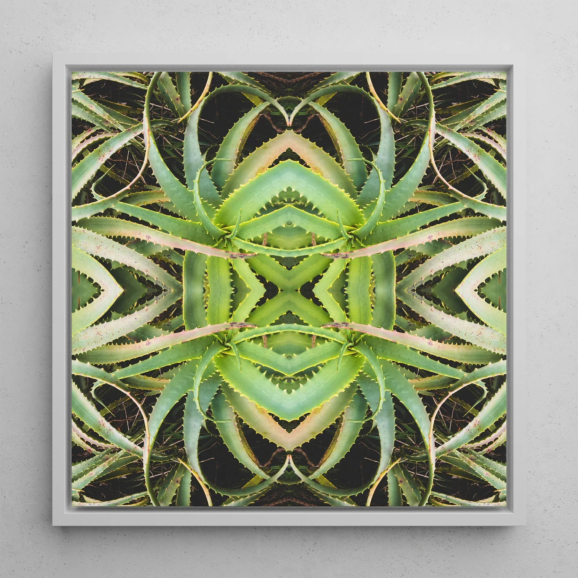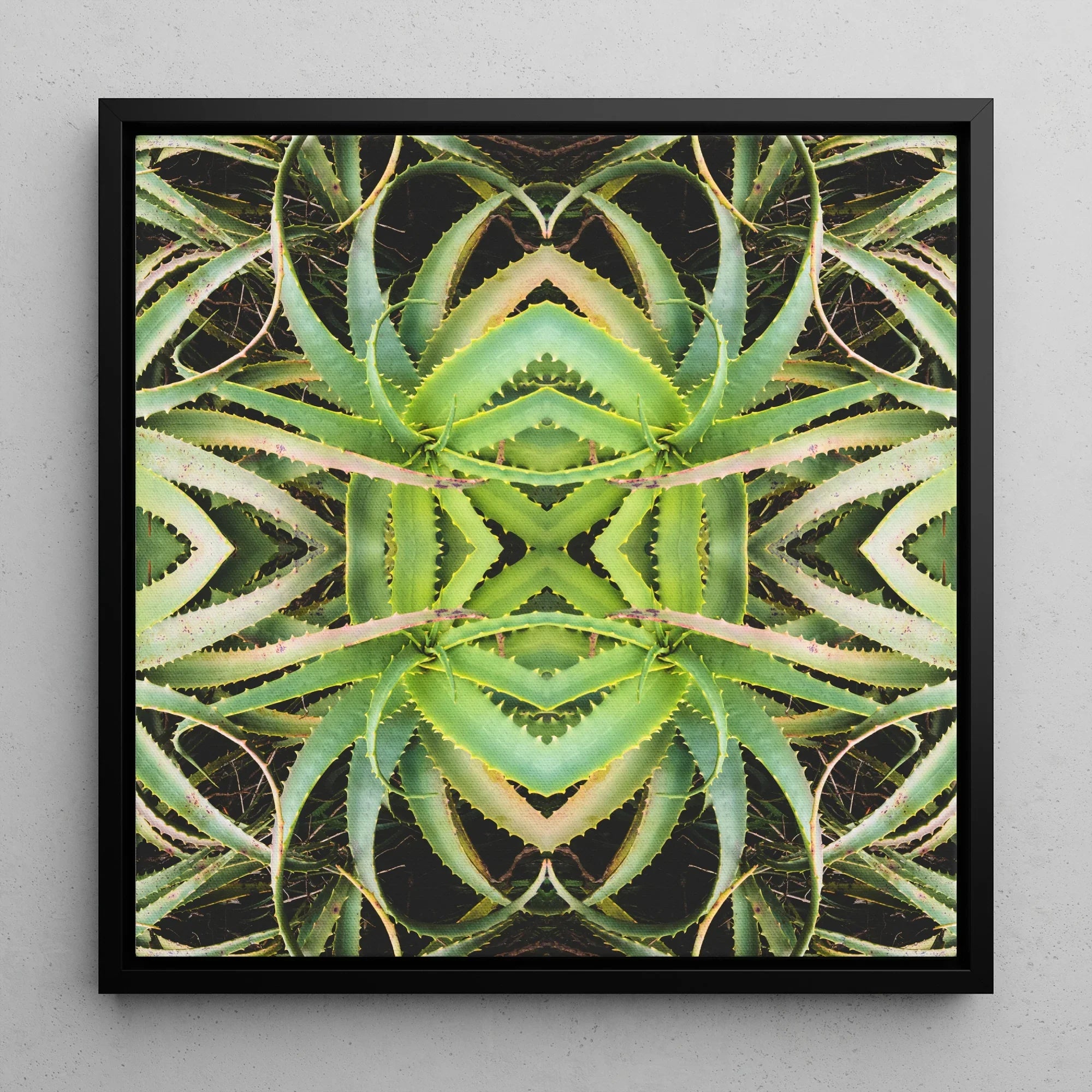 Sie werden von diesem Kunstdruck gefesselt sein, einer botanischen Halluzination, die Aloe Vera in einen üppigen Rorschach-Test verwandelt. Die Sukkulente mit ihren stacheligen Blättern dreht sich in perfekter Symmetrie und schafft eine andereweltliche Schmetterlings-Silhouette vor einem tintenschwarzen Hintergrund. Chartreusefarbene Klingen verhaken sich in einem schwindelerregenden Tanz, ihre gezackten Ränder bilden ein organisches Labyrinth.