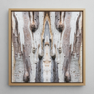 Die gespiegelte Komposition zeigt ein zentrales Speerspitzenmotiv, das von komplizierten Rindenmustern flankiert wird, die zwischen organischen Chaos und geometrischer Präzision tanzen. Erdige Töne von verwitterten grauen, gedämpften Umbers, Purpur und sonnenblattem Beige dominieren, unterbrochen von tieferen Knoten und Rissen, die auf die verborgenen Erzählungen der Natur hinweisen.