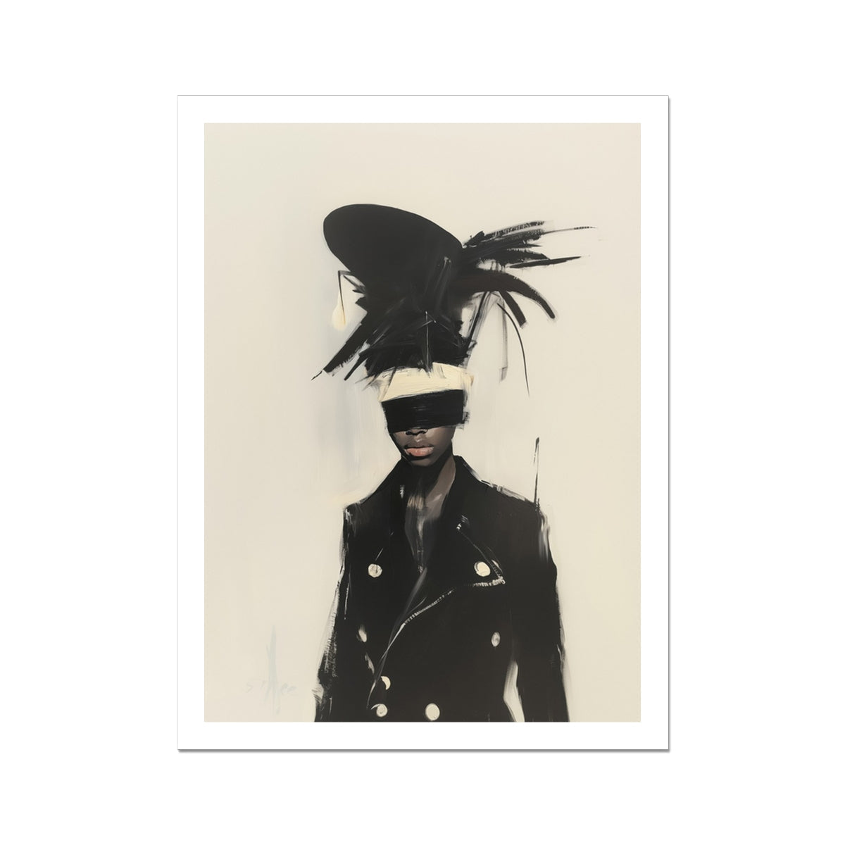 In expressionistischen Schwüngen dargestellt, die sich eher wie Zauberei als wie Pinselstriche anfühlen, umwirbt dieser Kunstdruck Ungehorsam mit Eleganz. Jedes Element führt die Gewalt und Poesie der Sichtbarkeit auf—eine messerscharfe Lederjacke, die unmöglichen Federn eines surrealistischen Zweispitzhutes, Haut wie Onyx, beleuchtet von Mondmilch. Die strenge cremefarbene Augenbinde schneidet über ihre Augen wie eine heilige Narbe. Man schaut sie nicht an. Man bezeugt sie.