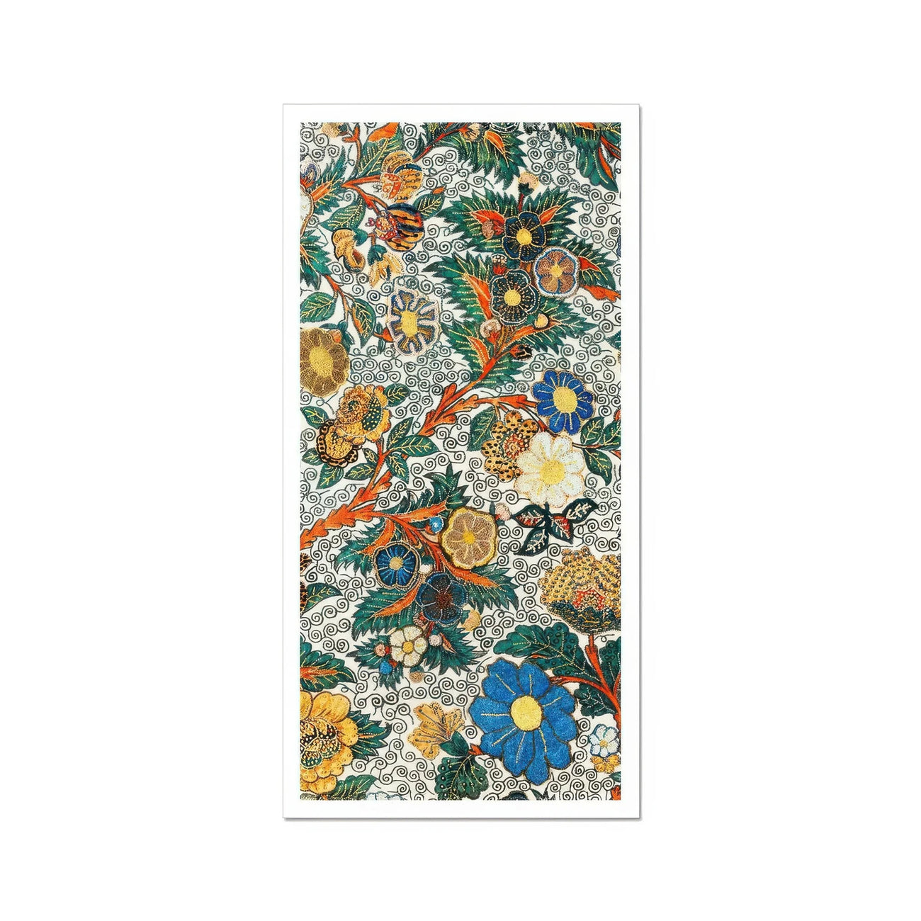 Die Blüte wo Kunstdruck zeigt einen hypnotisierenden edo-period (1615-1868) japanischen Wandteppich und erfasst die textile Meisterschaft der Ära in lebendigen Details. Die wimmelnde Blumen und das Laub vor dem Hintergrund zarter Spiralen wimmeln und die Raffinesse des japanischen Designs verkörpern.