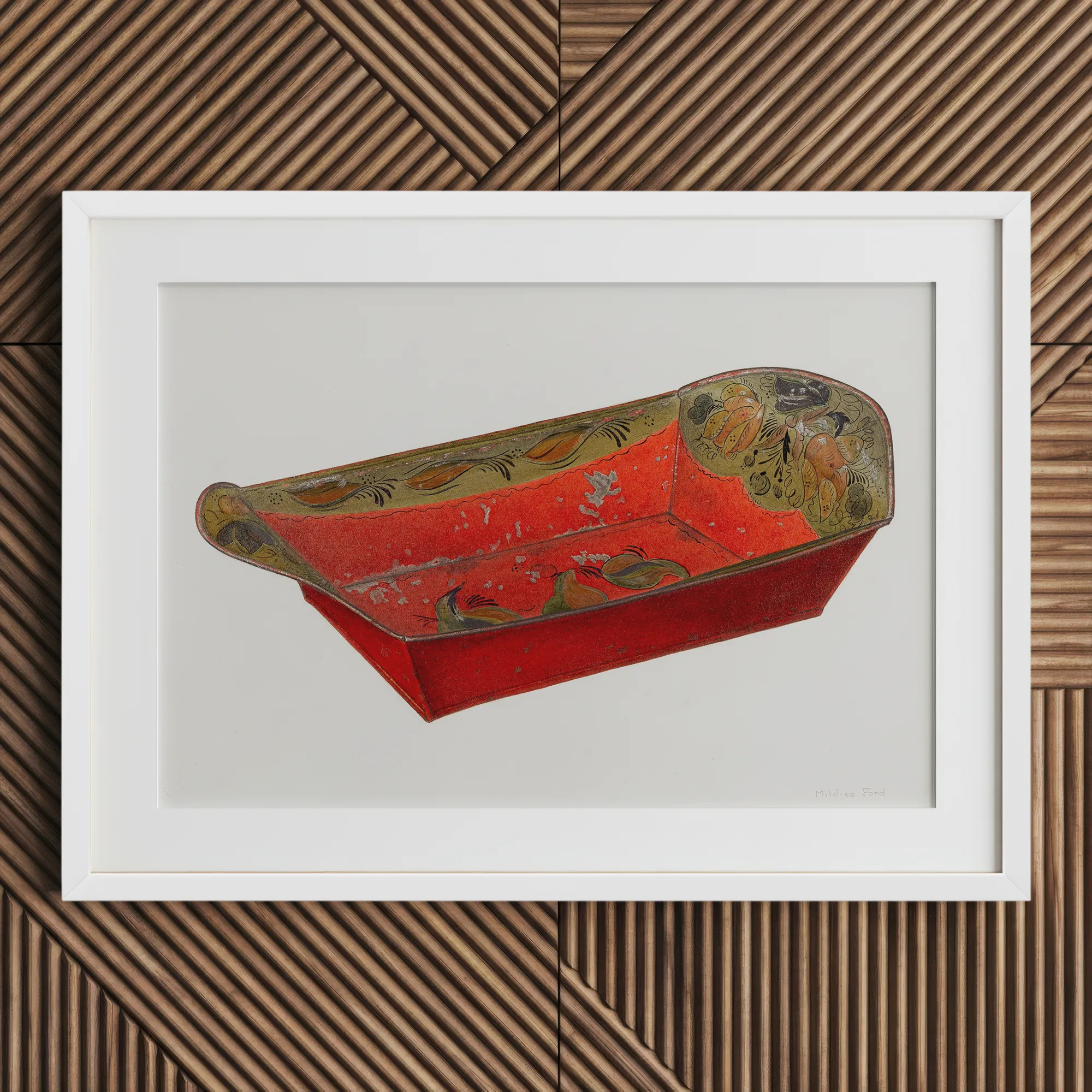 Erfreuen Sie sich an Mildred Fords lebhaftem Brottablett aus den 1930er Jahren, Kunstdruck, eine Feier des nostalgischen Küchenscharmes. Dieser scharlachrote Hingucker, in lebendigem Karmesinrot gehalten, lädt dazu ein, seine verwitterte Schönheit zu erkunden.