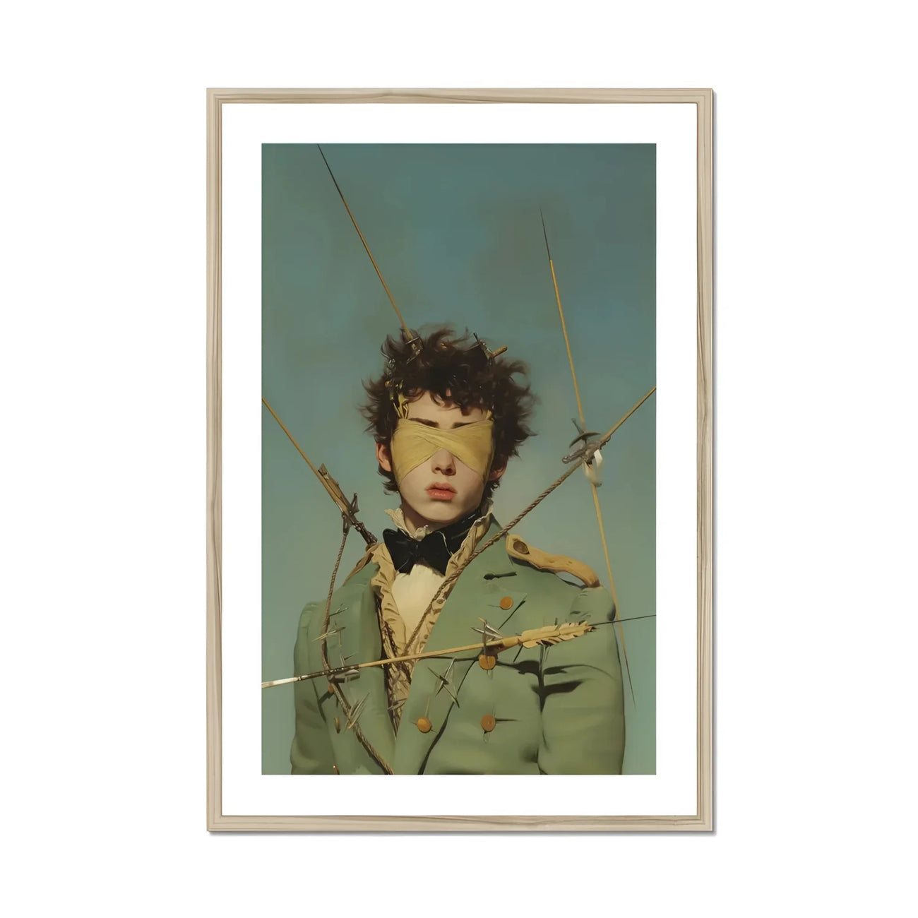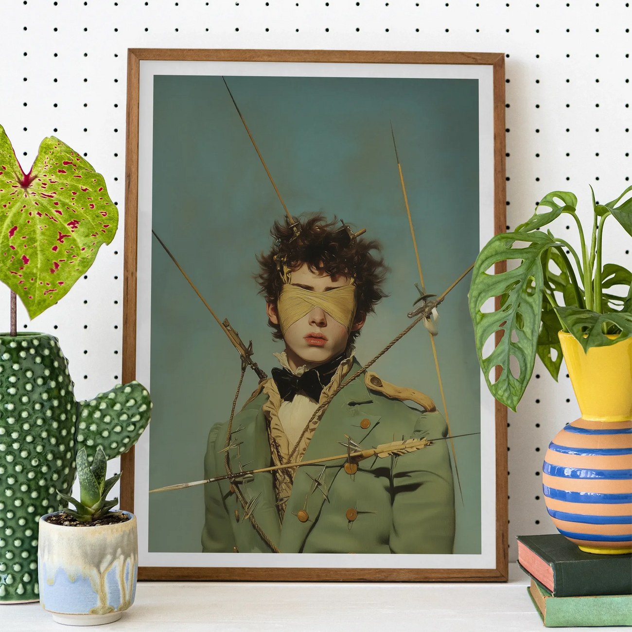Bullseye ist eine surrealistische Ikone. Ein geschmeidiger schwuler Militärmann, der mitten in einer Metapher verhaftet wurde. Mit einer Ockerbinde verbunden und von goldenen Speeren gehalten, die nicht verwunden, sondern orchestrieren. Gehüllt in einen oxidierten Kupfer-Militärmantel. Ihre Epauletten aus dem 18. Jahrhundert glänzen wie Relikte aus einem in Träumen geführten Krieg. Schwebend in einem türkisfarbenen Himmel, wo die Schwerkraft keine Zuständigkeit hat und das Urteil Samthandschuhe trägt.