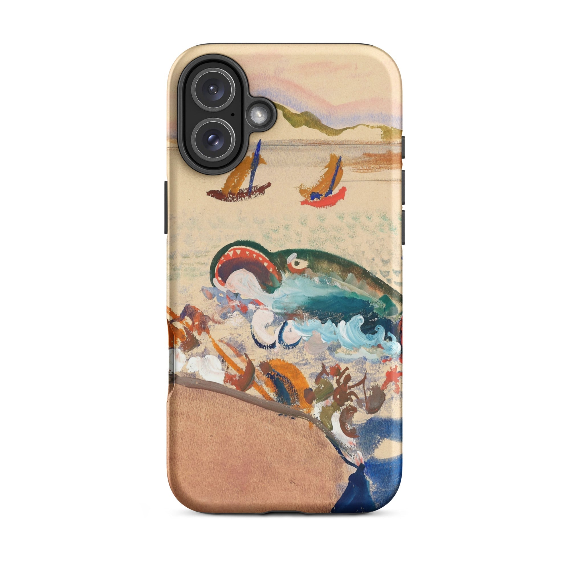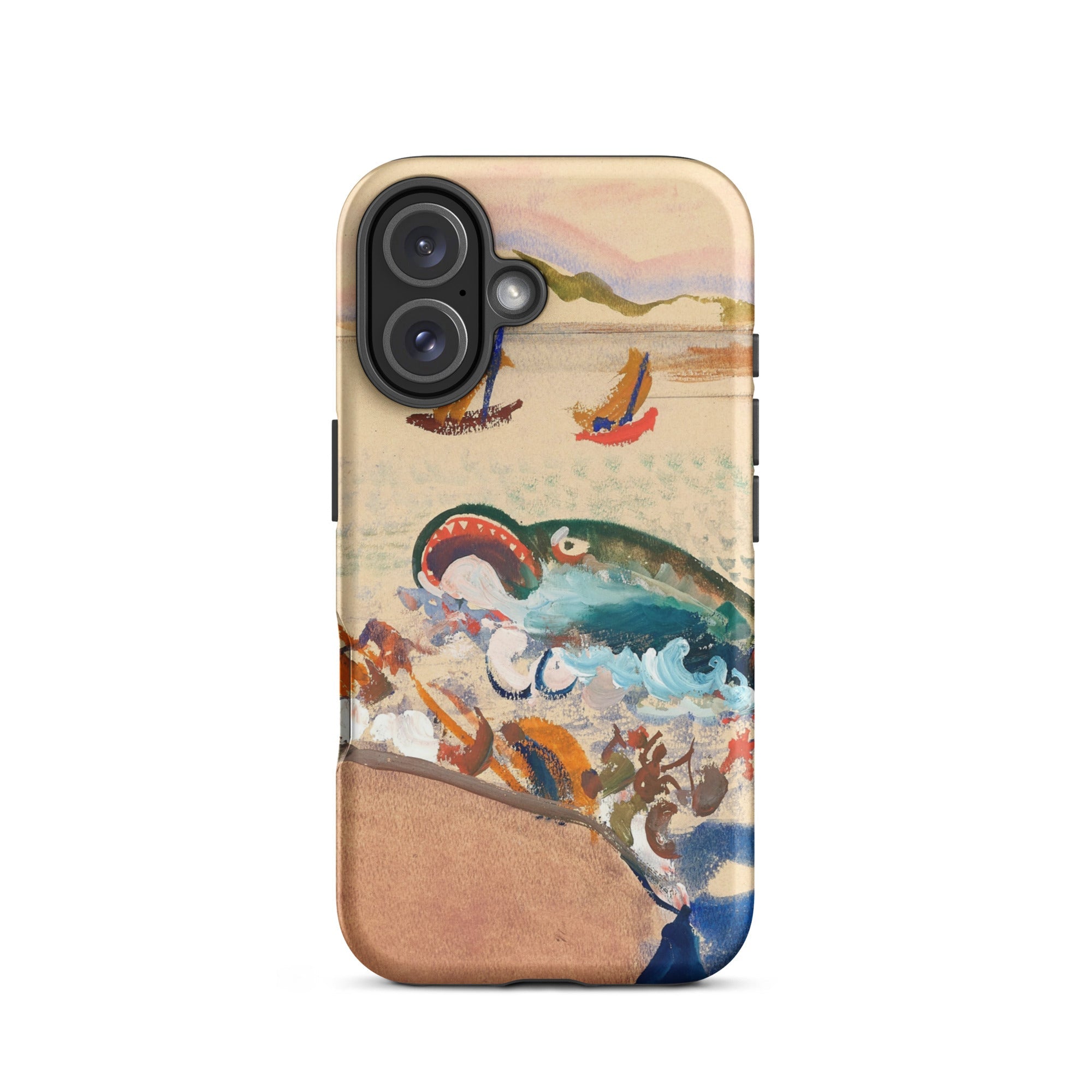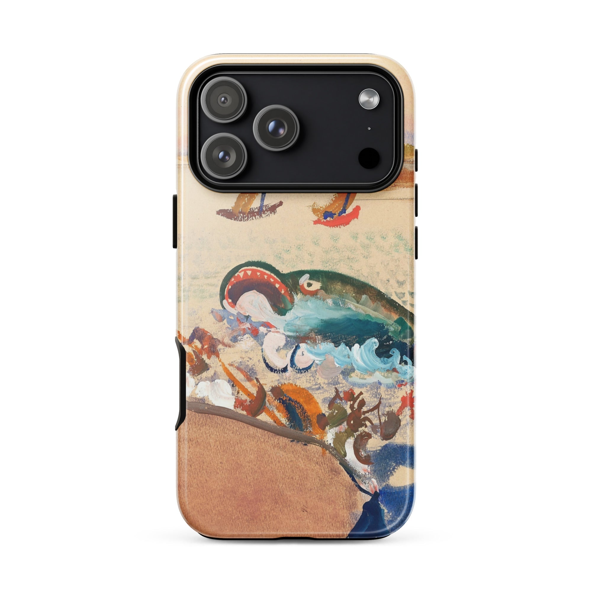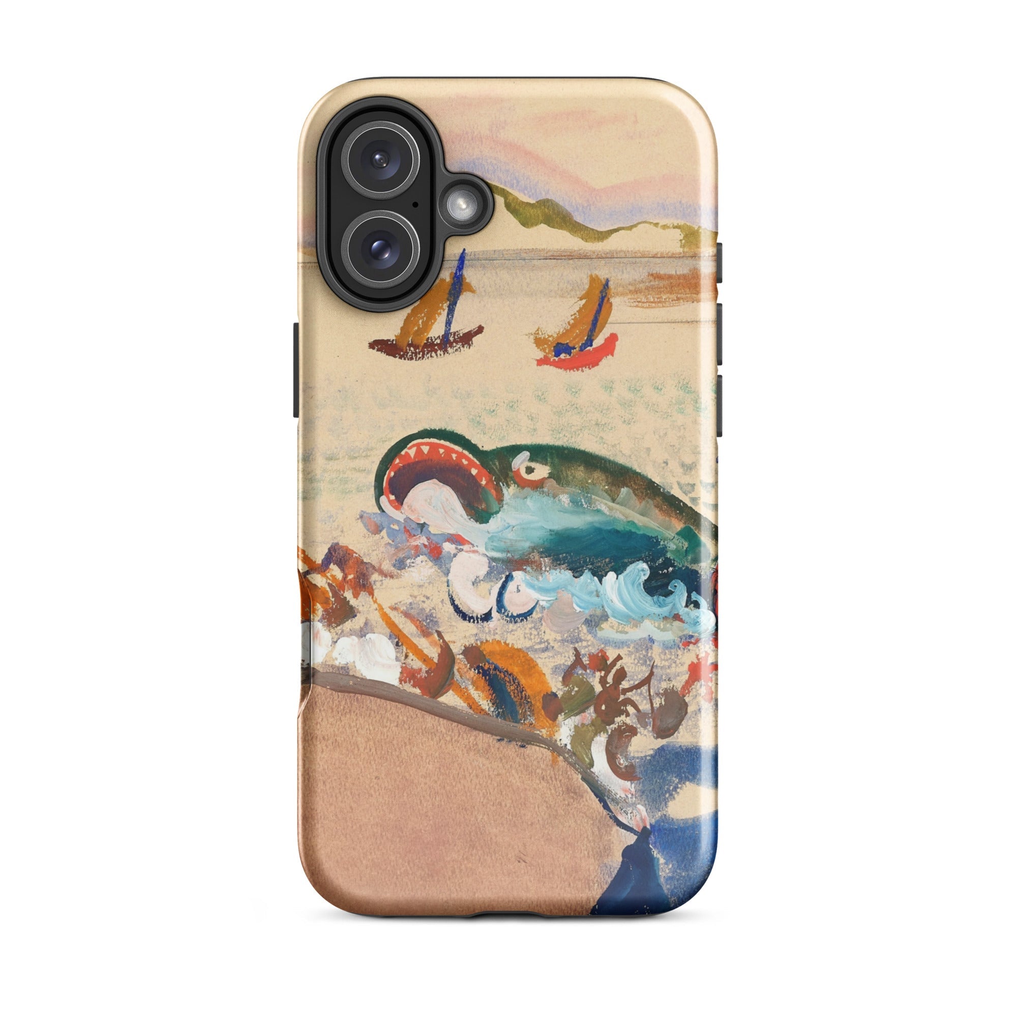 Der Wal ist ein türkisfarbener Koloss, der die bufffarbene Stille durchbricht, seine scharlachroten Kiefer weit genug aufgesperrt, um Segelboote, Seeleute, die Gewissheit selbst zu verschlingen. Oskar Laske malt Der Wal als Parabel, die sich zum Spektakel entwickelt: Bernsteinbesetzte Schiffe rasen auf das klaffende rote Innere zu, während sich azurblauer Schaum um zersplittertes Holz dreht.