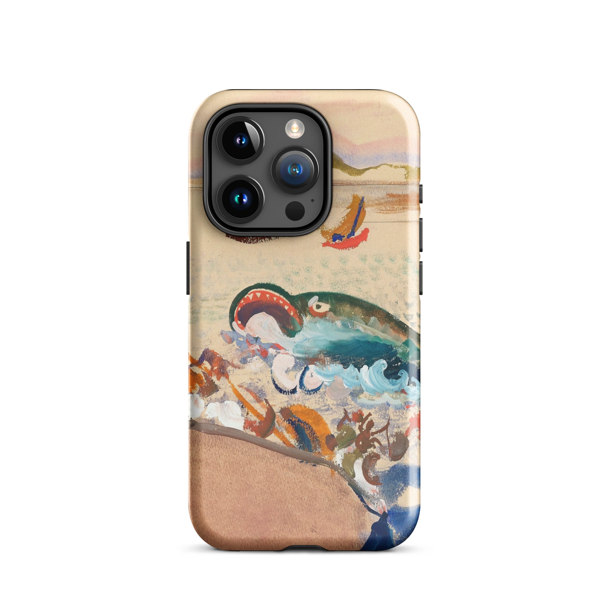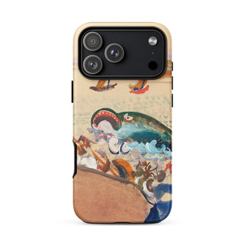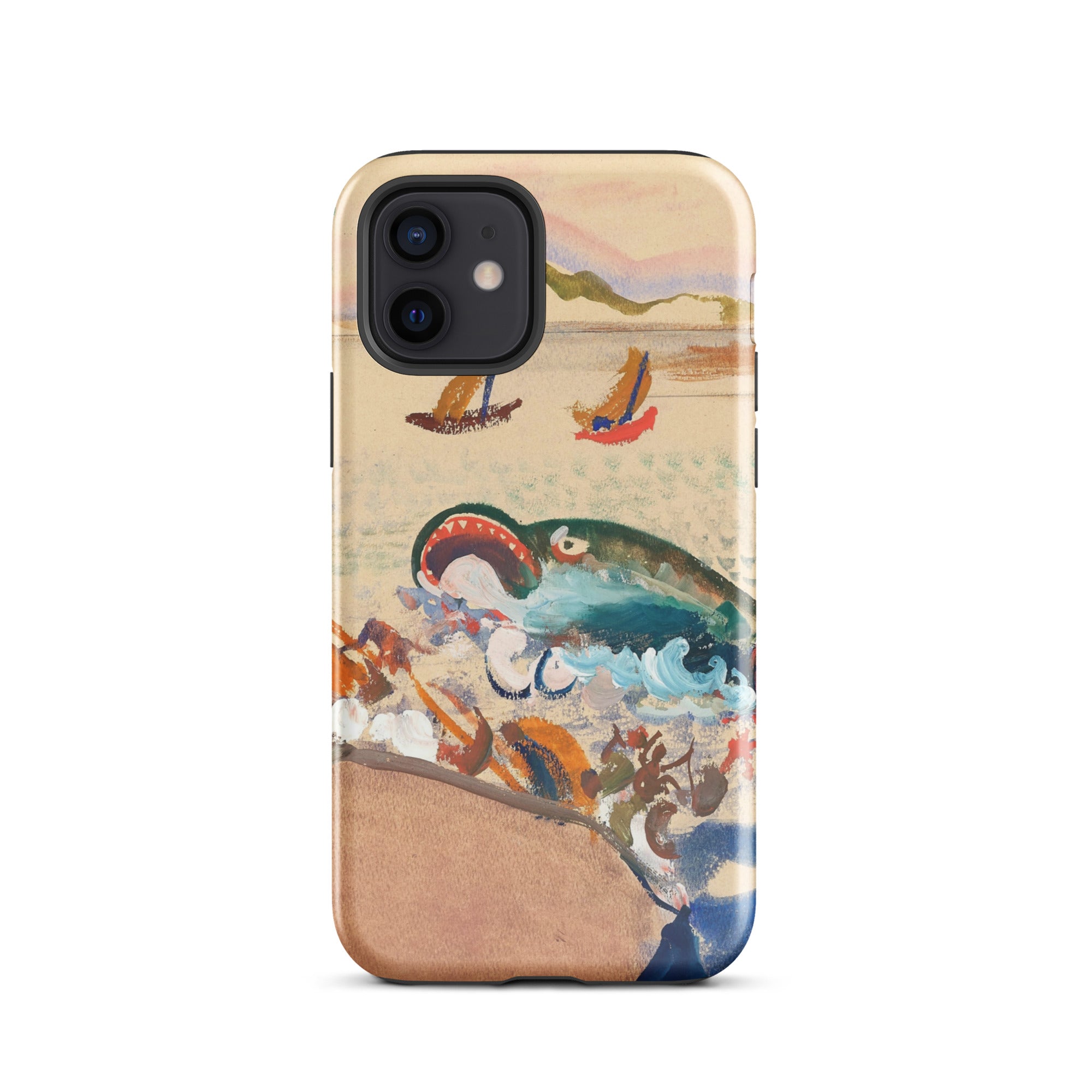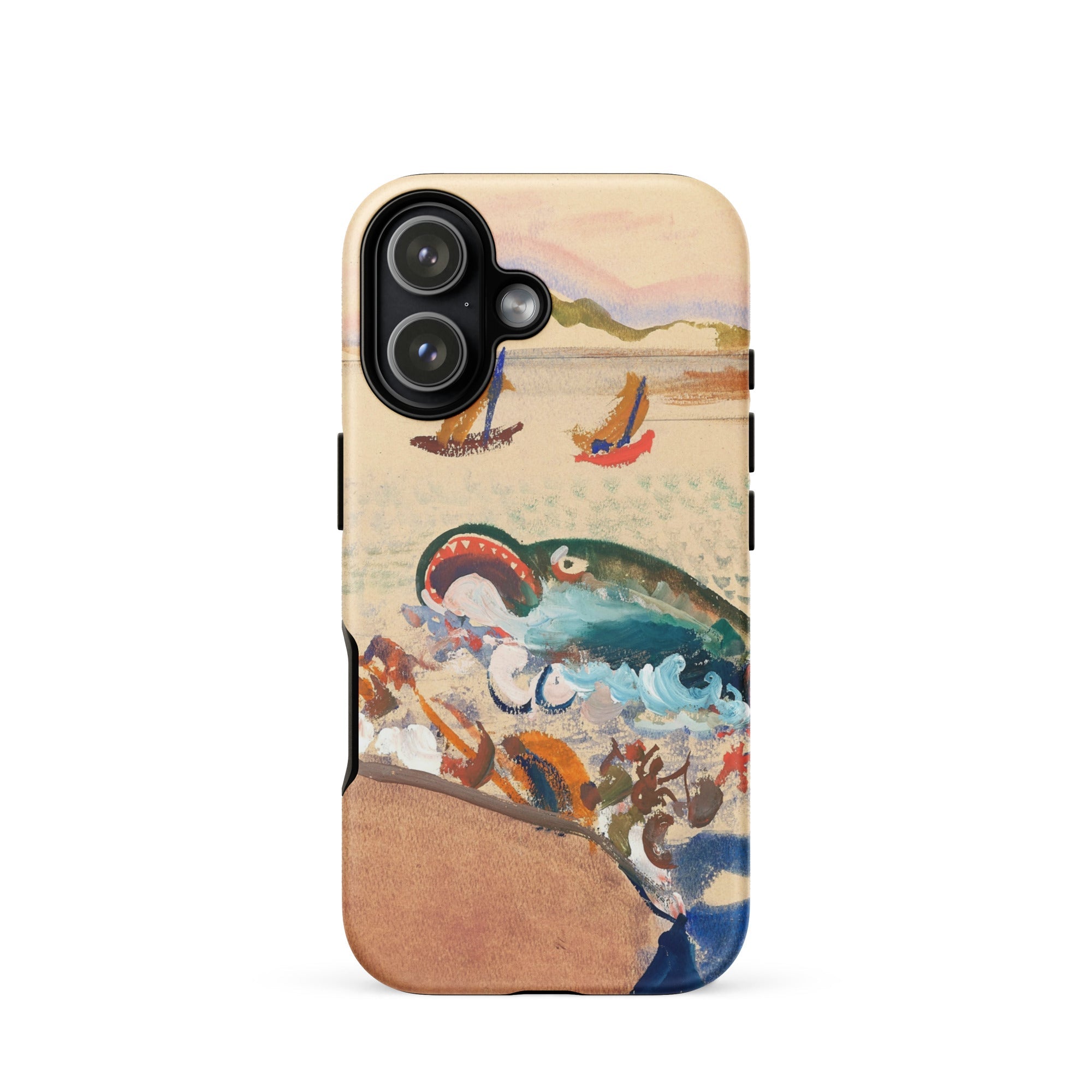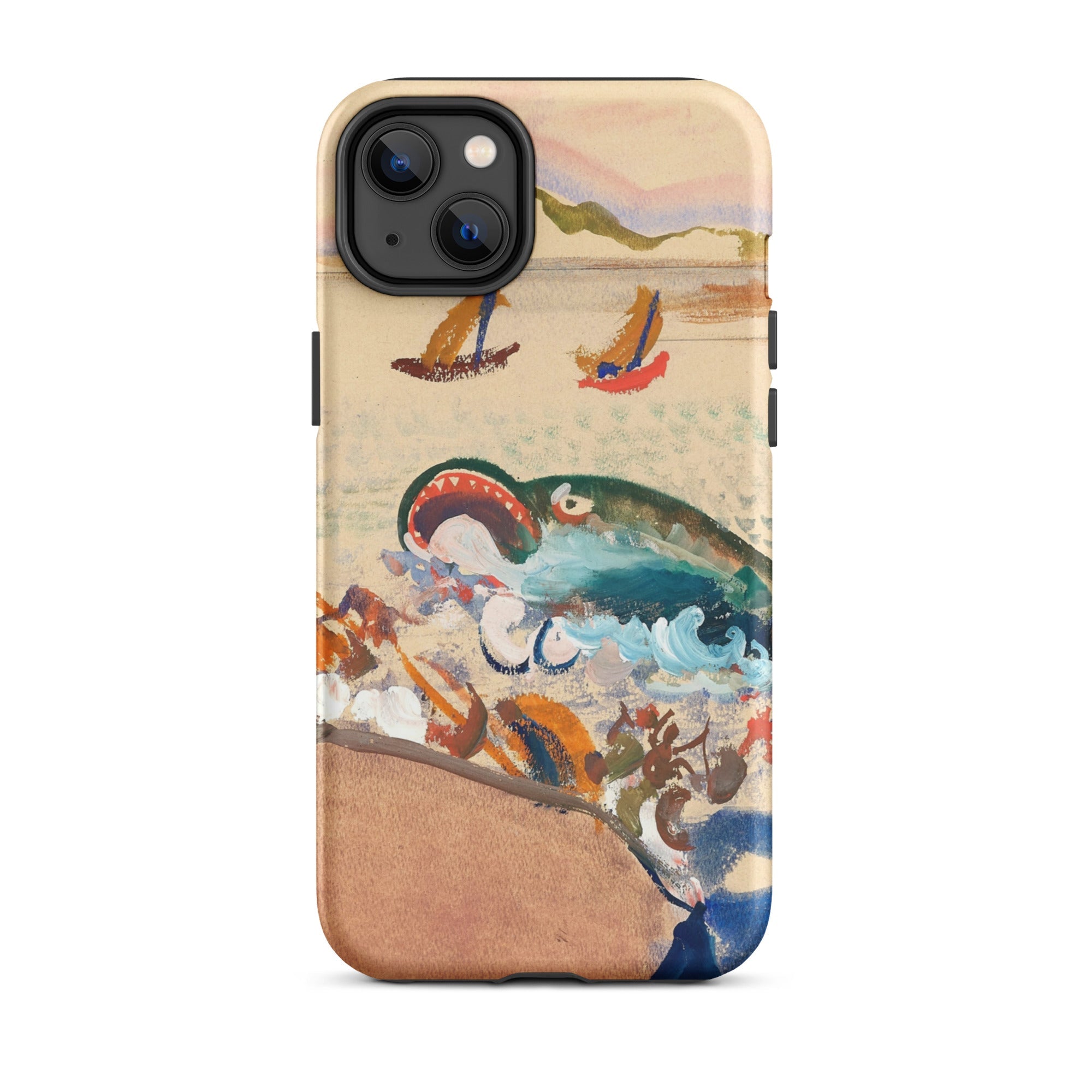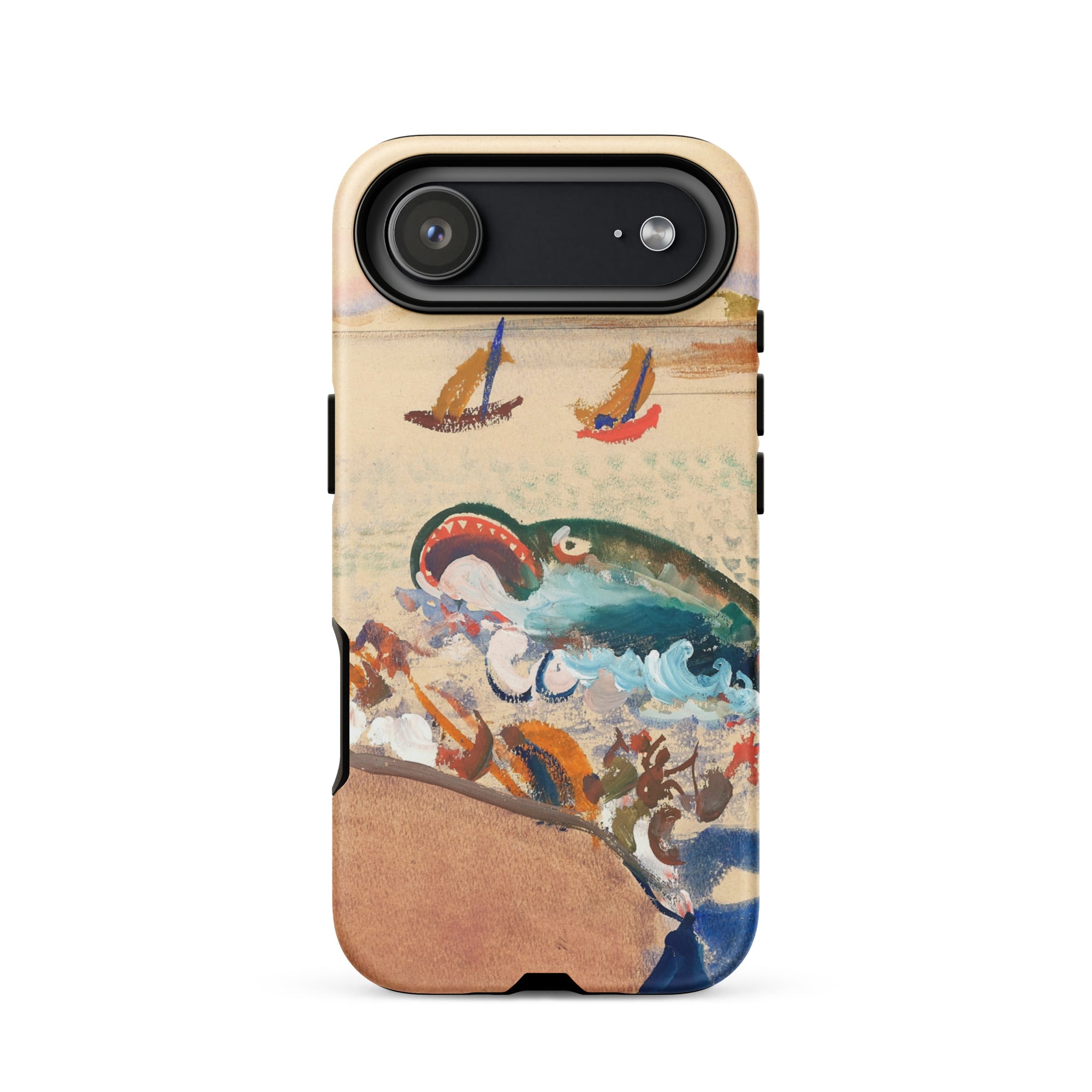 Der Wal ist ein türkisfarbener Koloss, der die bufffarbene Stille durchbricht, seine scharlachroten Kiefer weit genug aufgesperrt, um Segelboote, Seeleute, die Gewissheit selbst zu verschlingen. Oskar Laske malt Der Wal als Parabel, die sich zum Spektakel entwickelt: Bernsteinbesetzte Schiffe rasen auf das klaffende rote Innere zu, während sich azurblauer Schaum um zersplittertes Holz dreht.