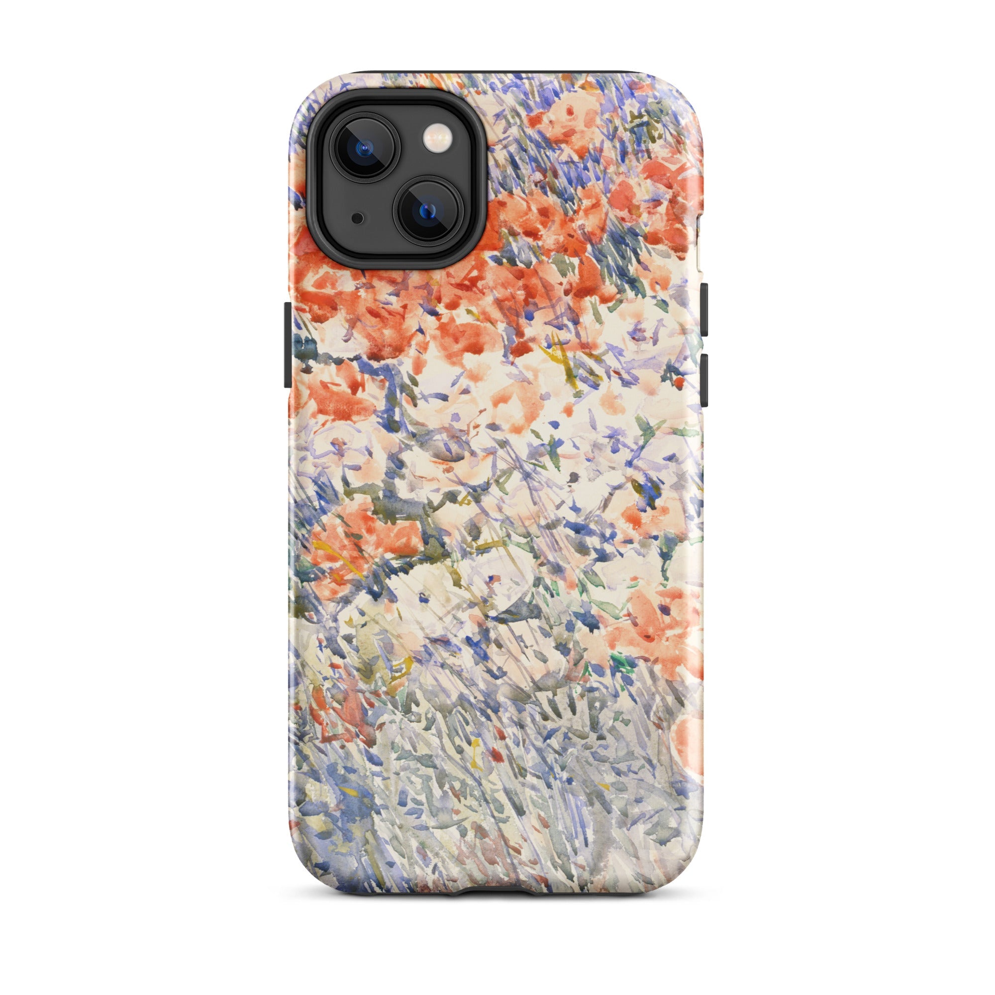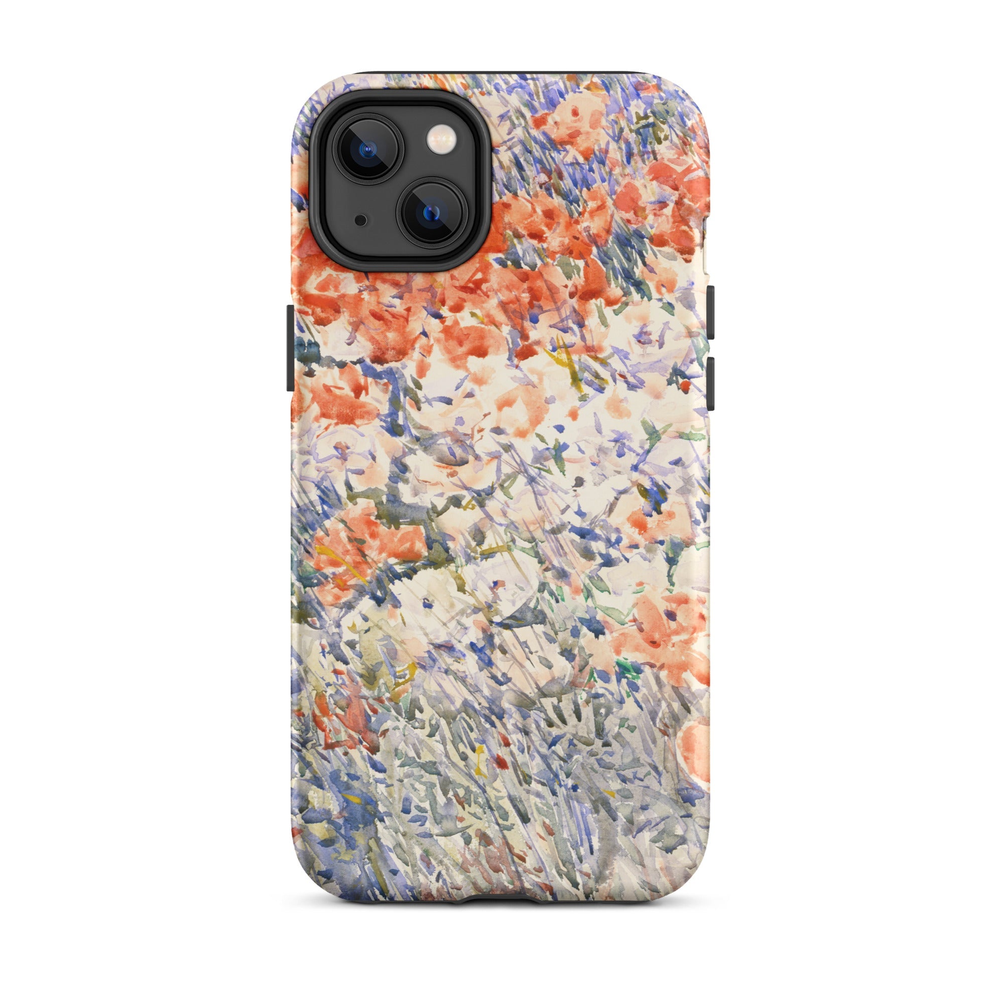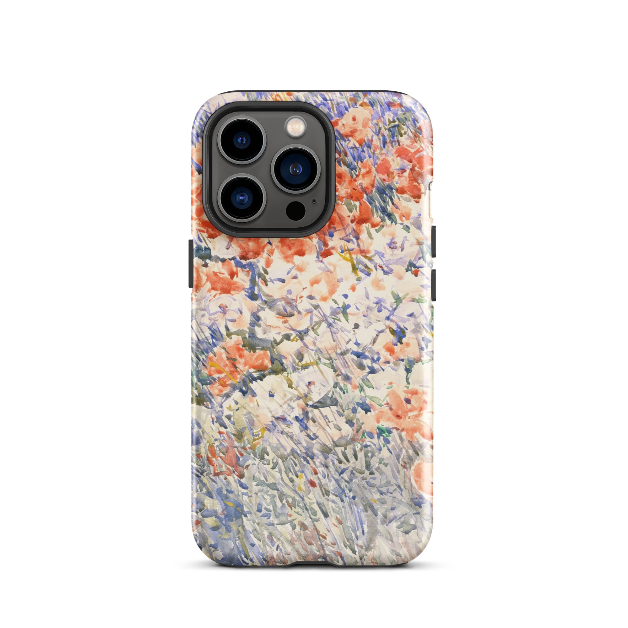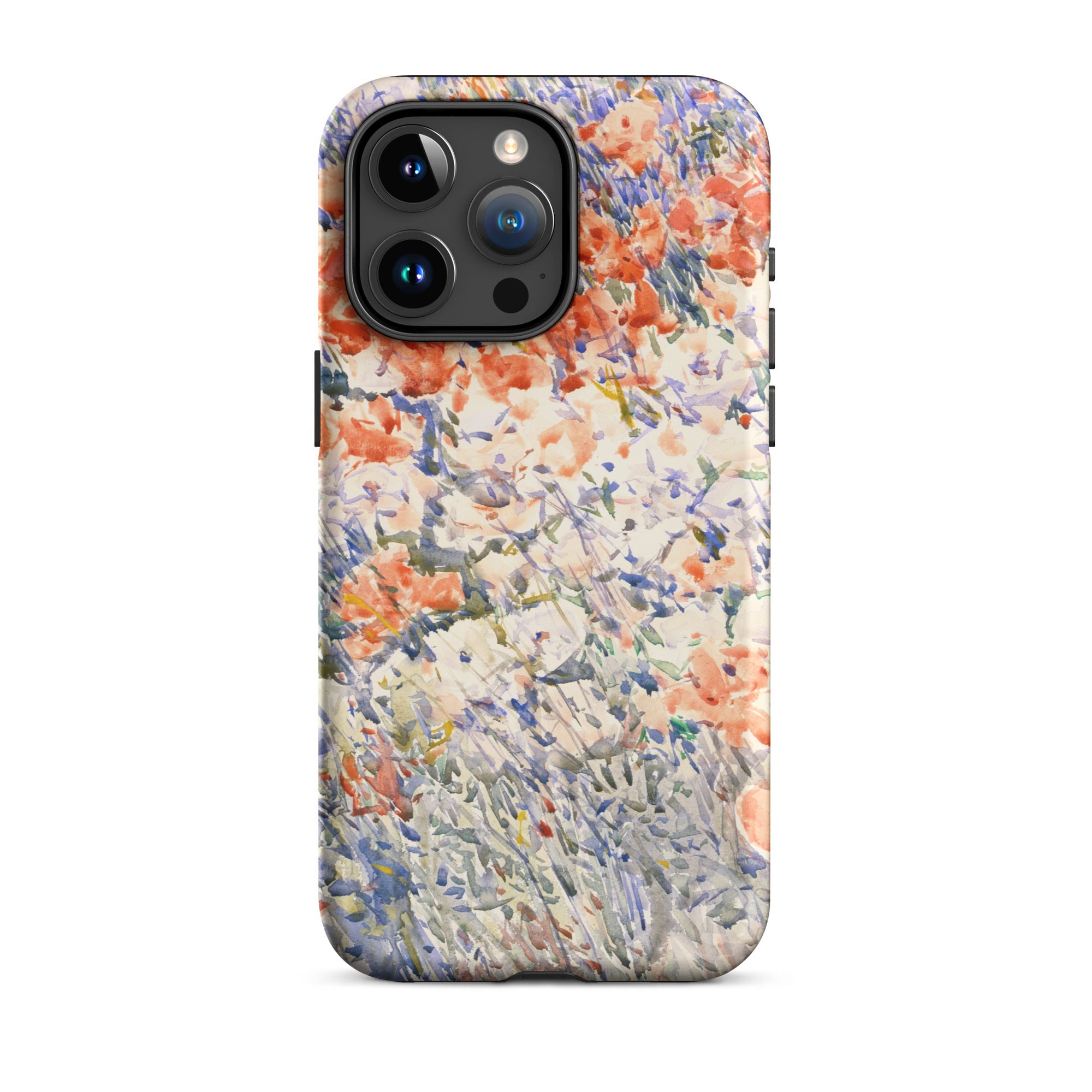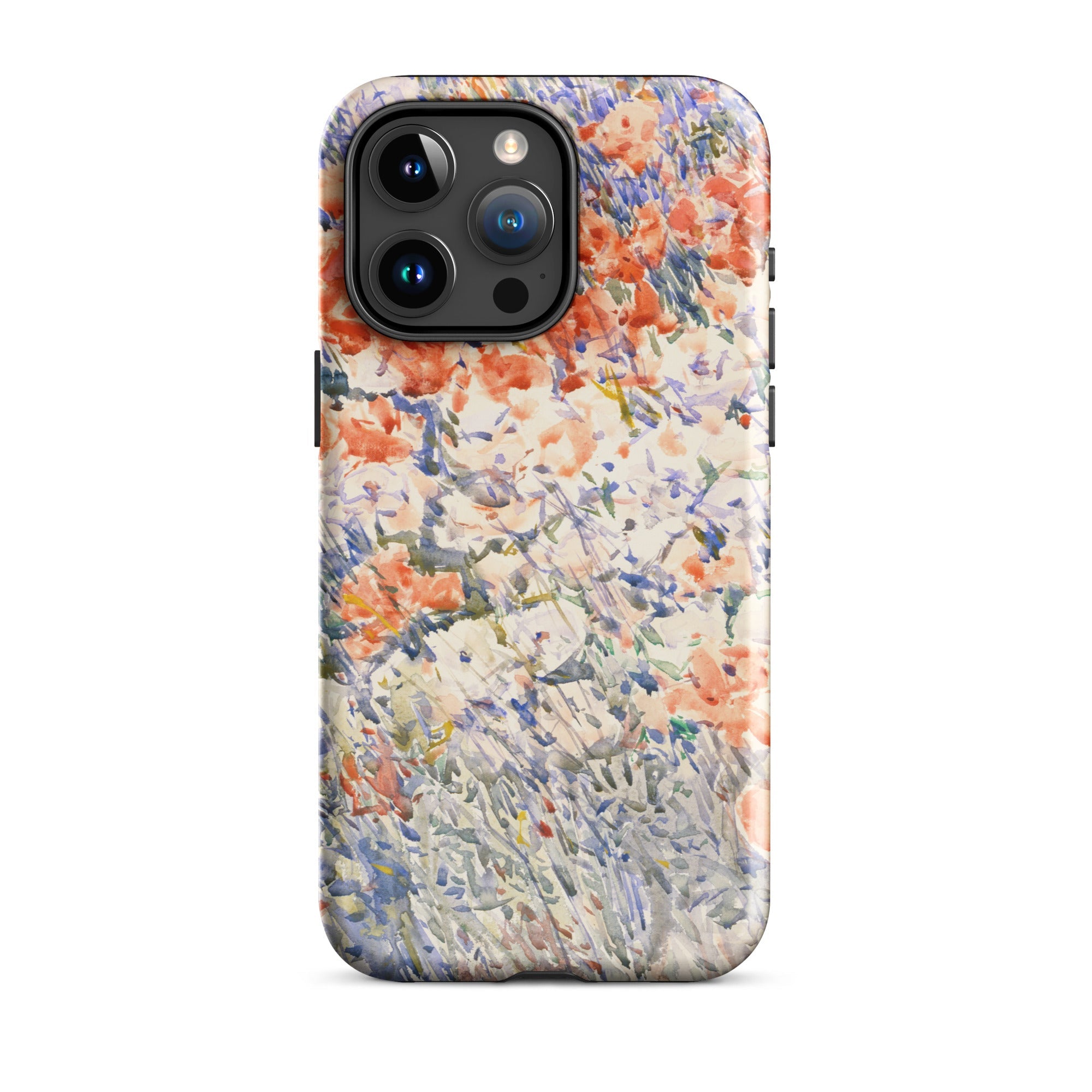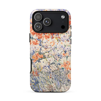 Celia Thaxters Isles of Shoals Garten lieferte das Motiv; Hassams flüssiger Pinselstrich verlieh ihm seinen Atem. Ritterspornstängel erheben sich durch olivgrüne und schiefergrüne Wirrungen, lavendelfarbene Akzente sammeln sich dort, wo nasses Pigment nasses Papier fand. Kein Weg, keine Figur, kein Rahmen—die Komposition besteht auf botanischer Totalität. Gedruckt auf einer Handyhülle trägt diese Freilichtstudie den Duft des Atlantiks im August, jeder Farbton durchtränkt vom Licht New Hampshires.