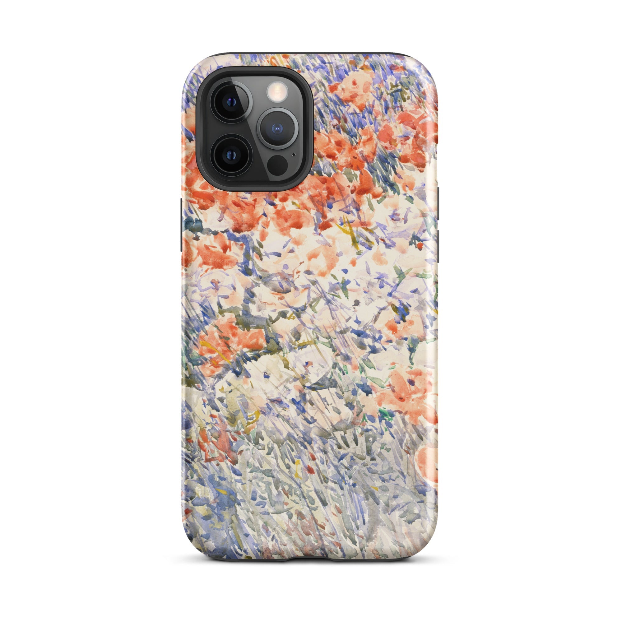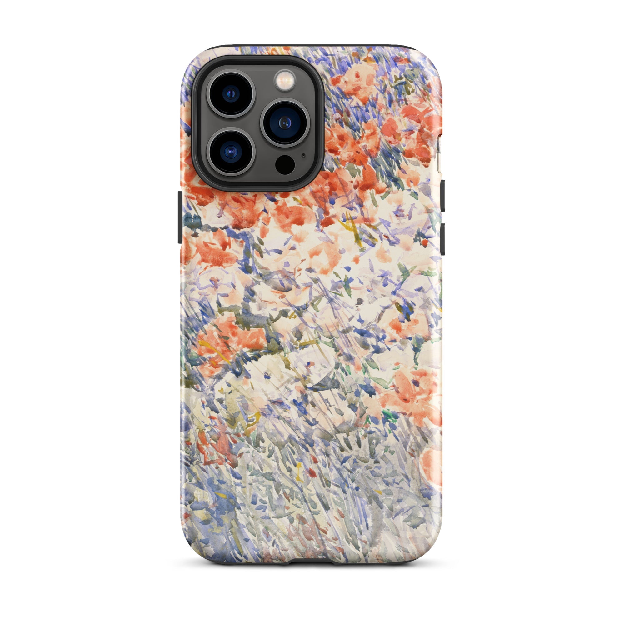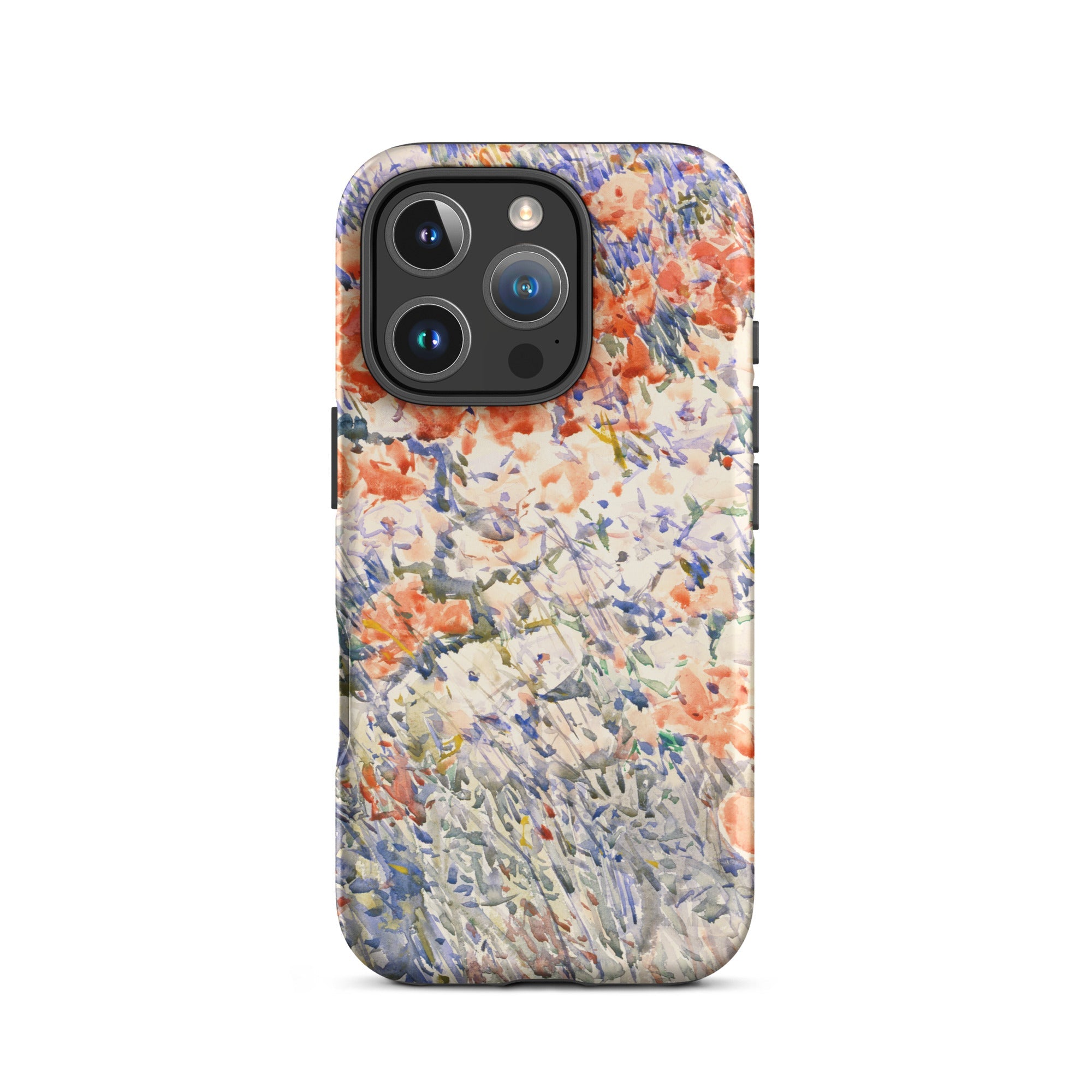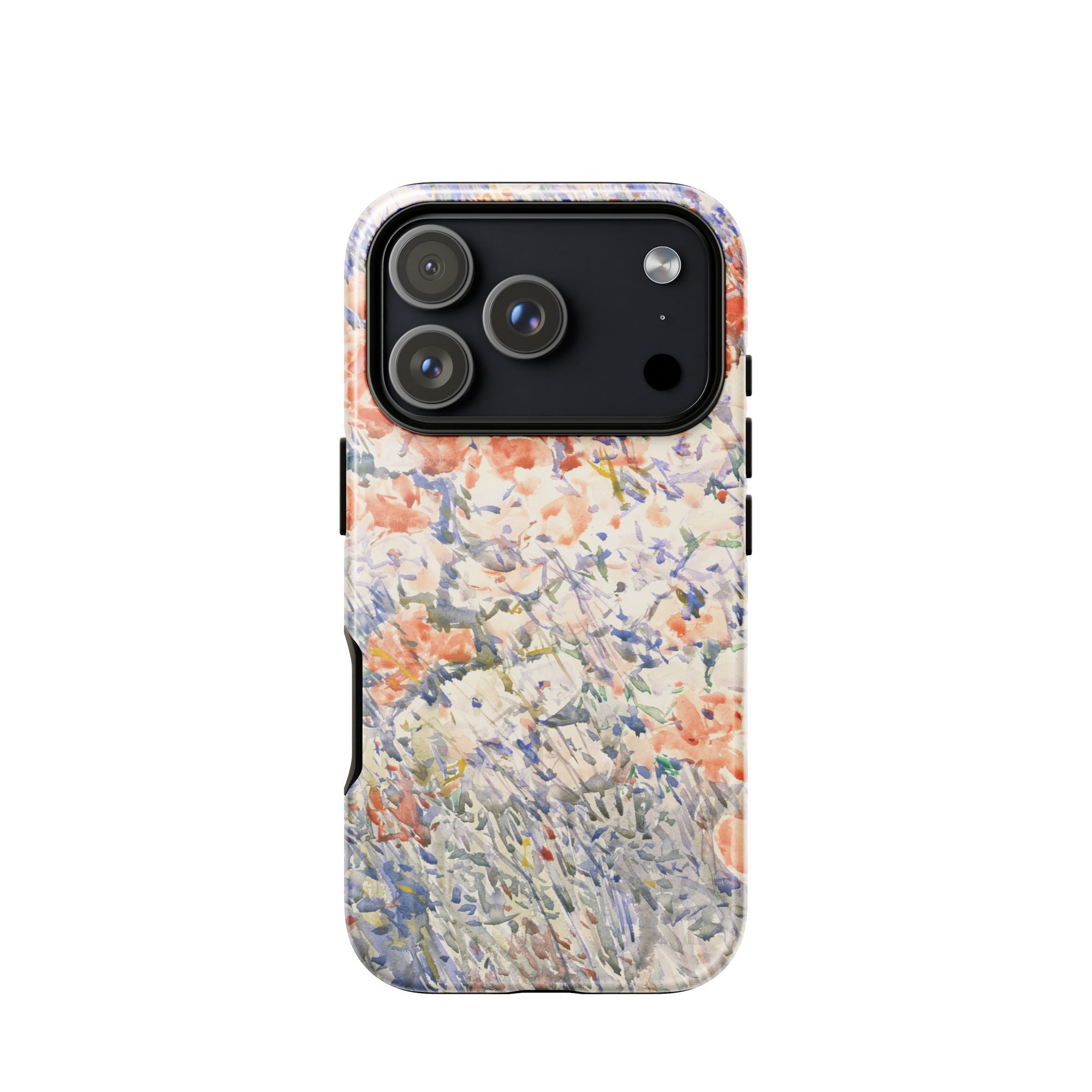 Celia Thaxters Isles of Shoals Garten lieferte das Motiv; Hassams flüssiger Pinselstrich verlieh ihm seinen Atem. Ritterspornstängel erheben sich durch olivgrüne und schiefergrüne Wirrungen, lavendelfarbene Akzente sammeln sich dort, wo nasses Pigment nasses Papier fand. Kein Weg, keine Figur, kein Rahmen—die Komposition besteht auf botanischer Totalität. Gedruckt auf einer Handyhülle trägt diese Freilichtstudie den Duft des Atlantiks im August, jeder Farbton durchtränkt vom Licht New Hampshires.