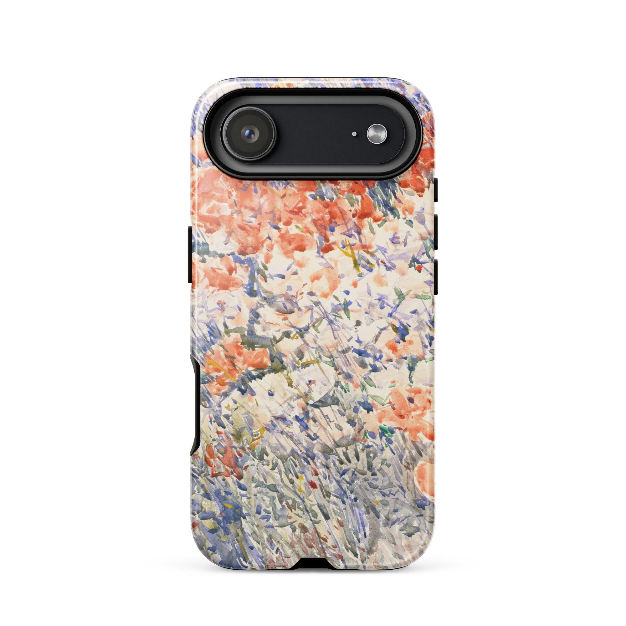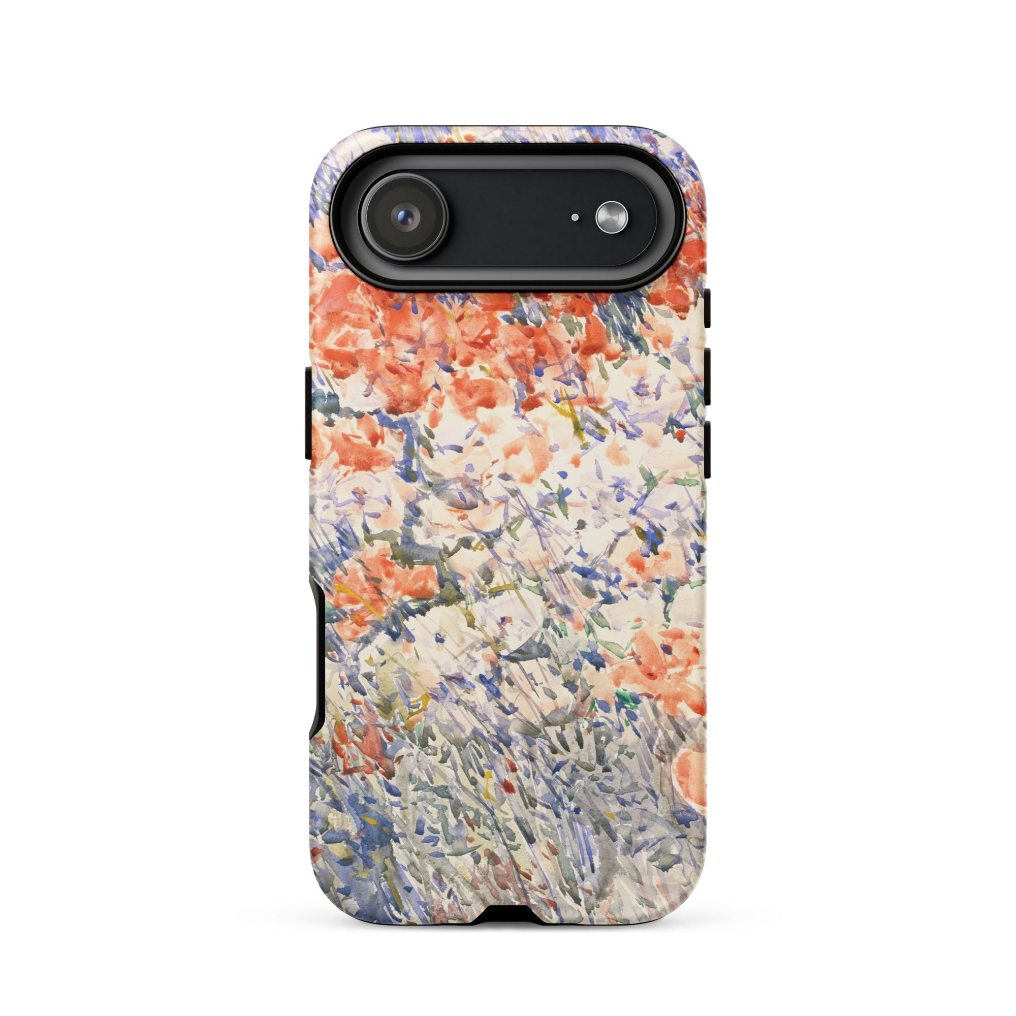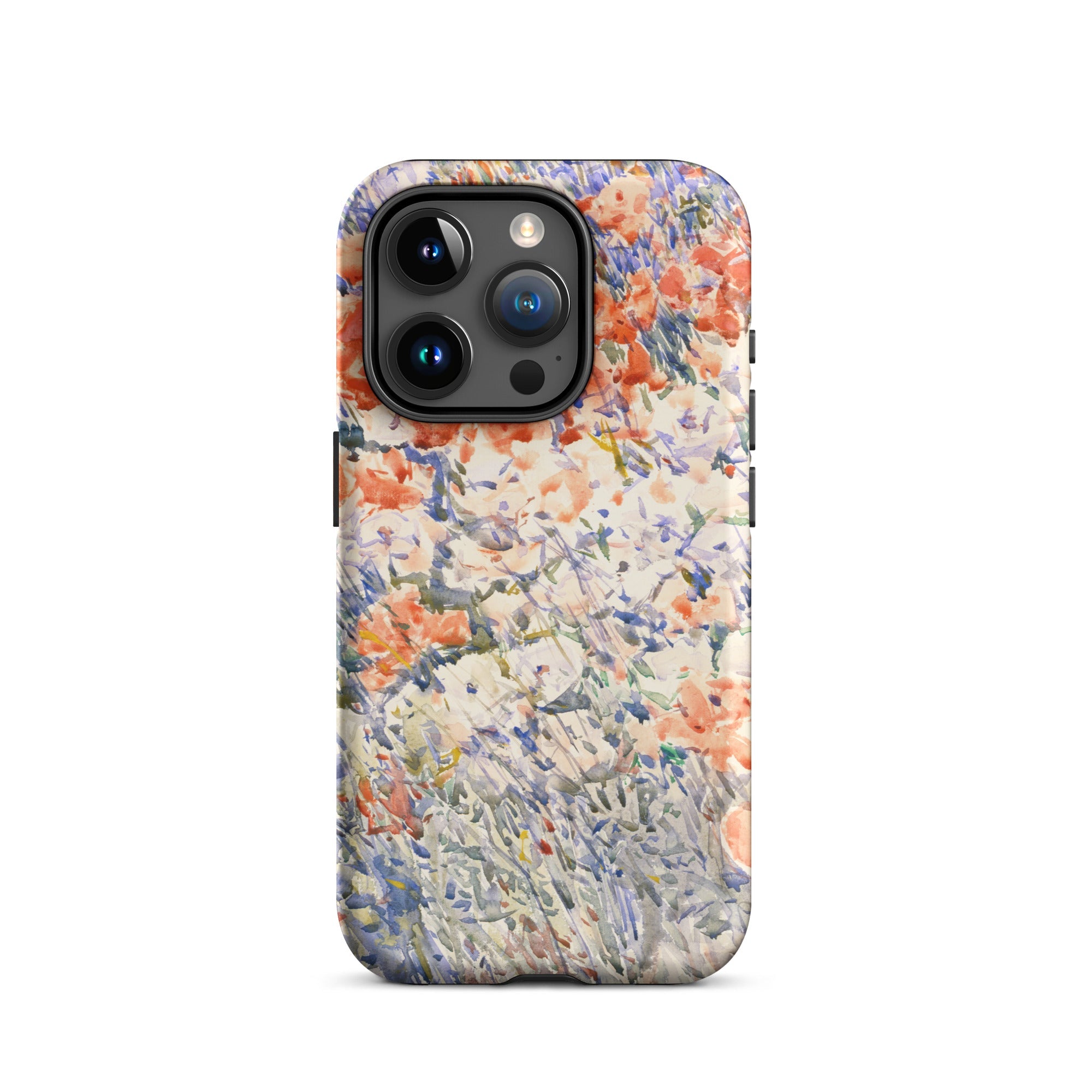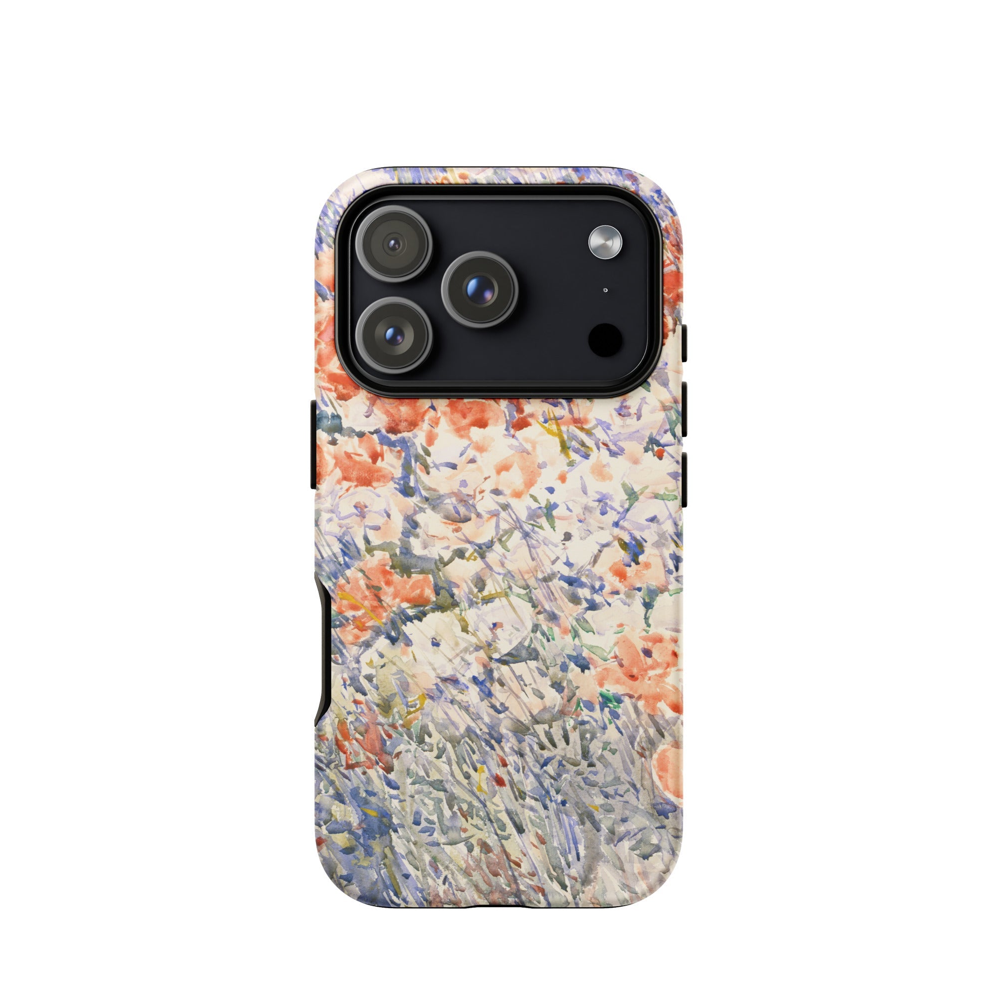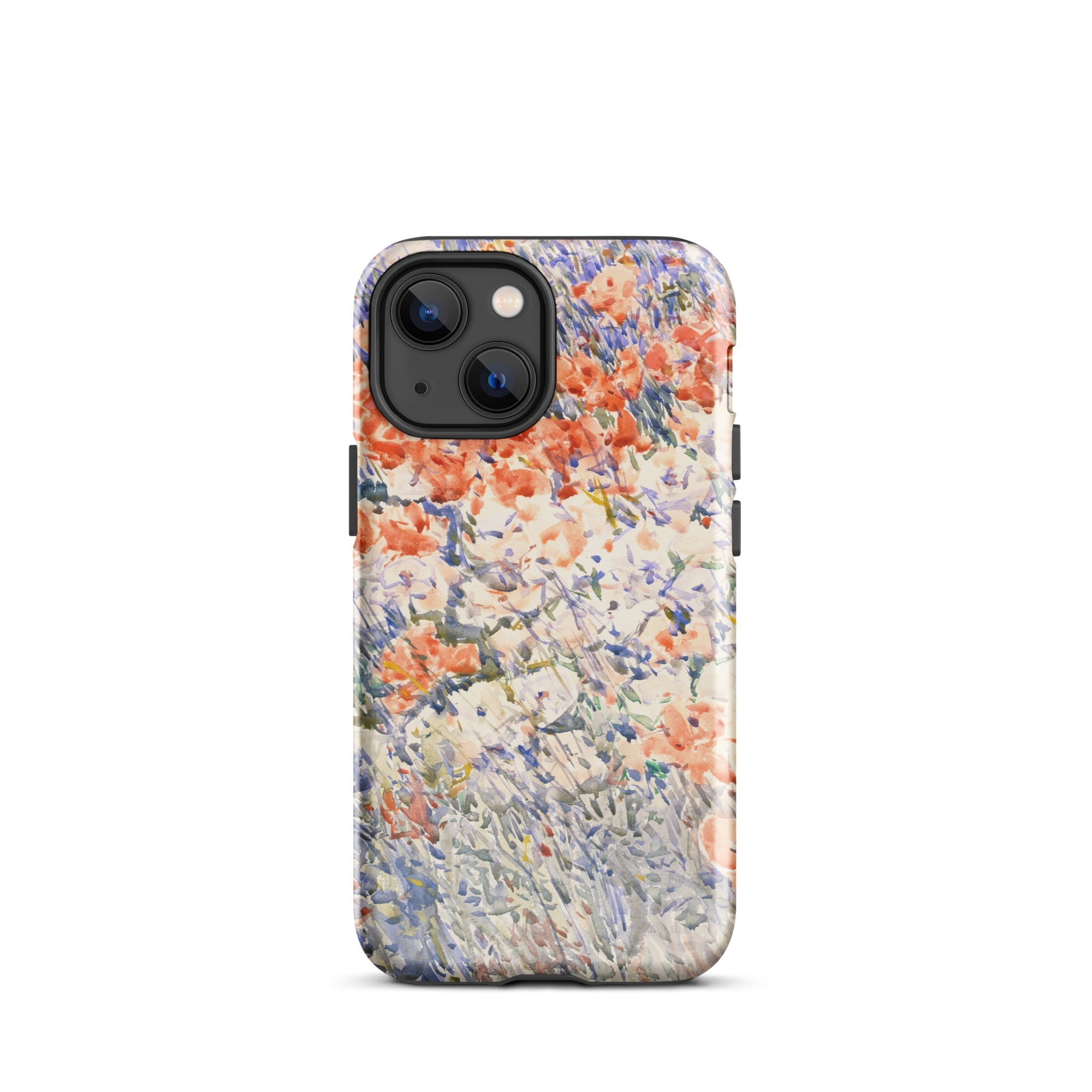 Celia Thaxters Isles of Shoals Garten lieferte das Motiv; Hassams flüssiger Pinselstrich verlieh ihm seinen Atem. Ritterspornstängel erheben sich durch olivgrüne und schiefergrüne Wirrungen, lavendelfarbene Akzente sammeln sich dort, wo nasses Pigment nasses Papier fand. Kein Weg, keine Figur, kein Rahmen—die Komposition besteht auf botanischer Totalität. Gedruckt auf einer Handyhülle trägt diese Freilichtstudie den Duft des Atlantiks im August, jeder Farbton durchtränkt vom Licht New Hampshires.