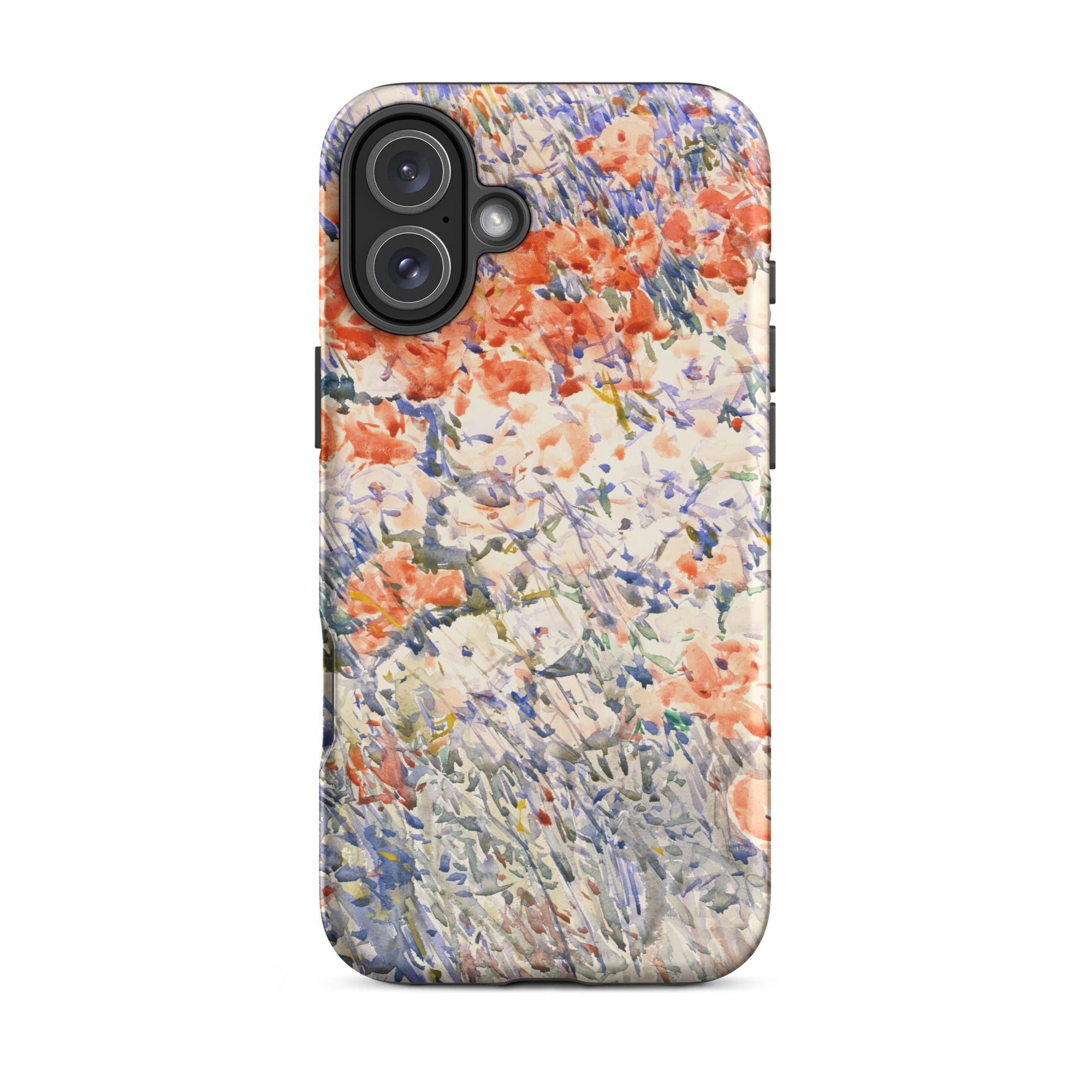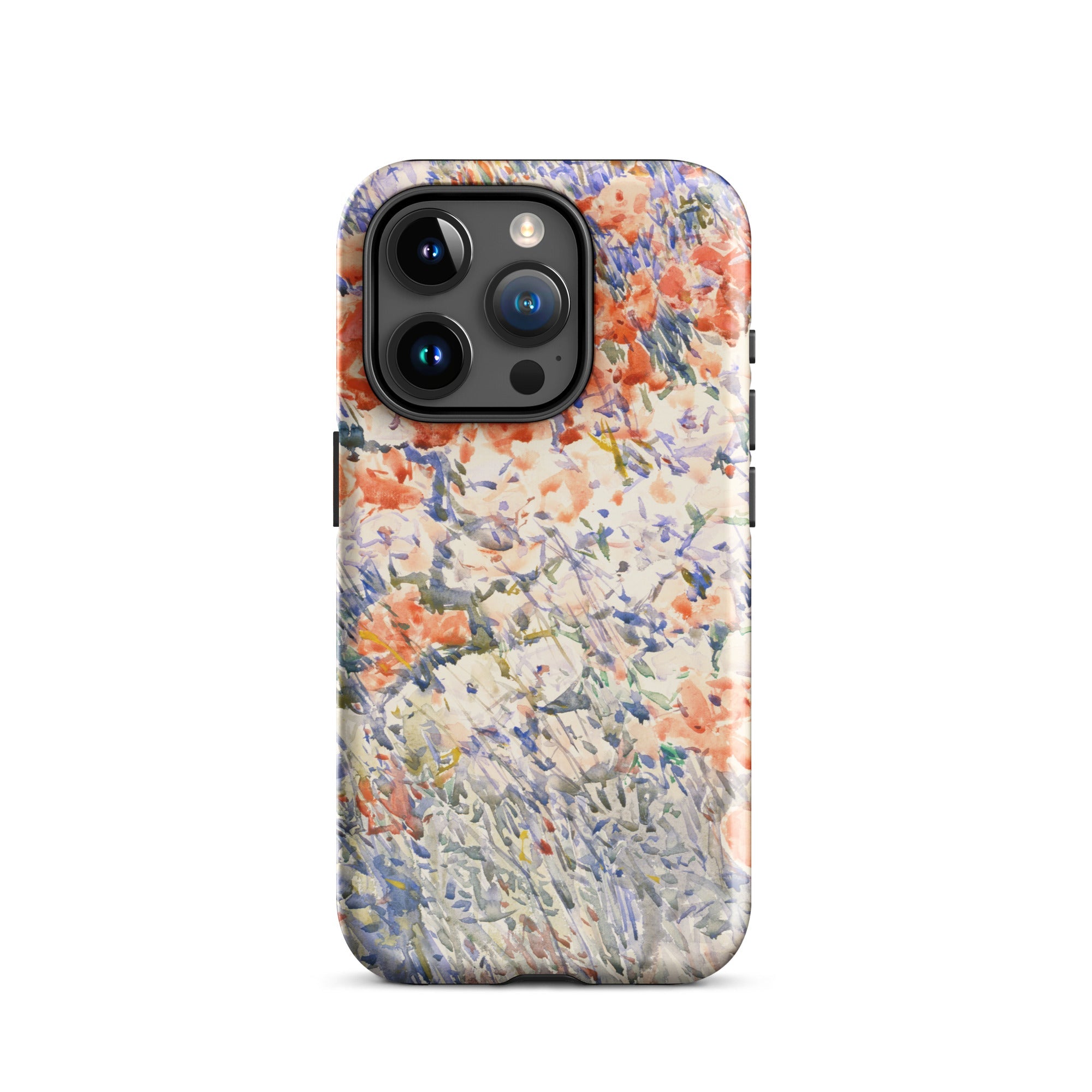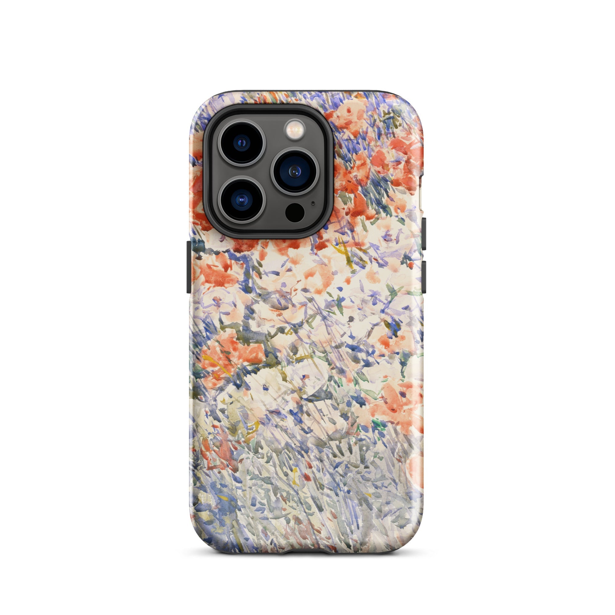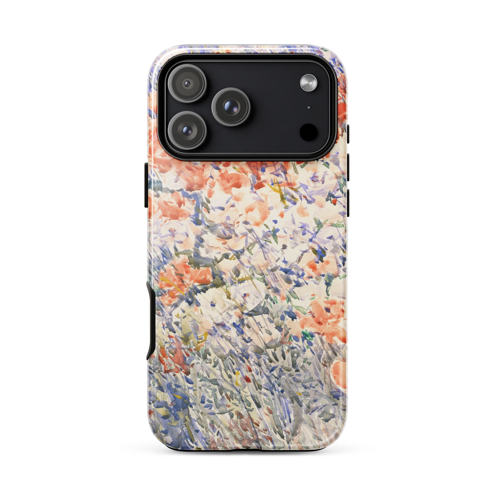 Celia Thaxters Isles of Shoals Garten lieferte das Motiv; Hassams flüssiger Pinselstrich verlieh ihm seinen Atem. Ritterspornstängel erheben sich durch olivgrüne und schiefergrüne Wirrungen, lavendelfarbene Akzente sammeln sich dort, wo nasses Pigment nasses Papier fand. Kein Weg, keine Figur, kein Rahmen—die Komposition besteht auf botanischer Totalität. Gedruckt auf einer Handyhülle trägt diese Freilichtstudie den Duft des Atlantiks im August, jeder Farbton durchtränkt vom Licht New Hampshires.