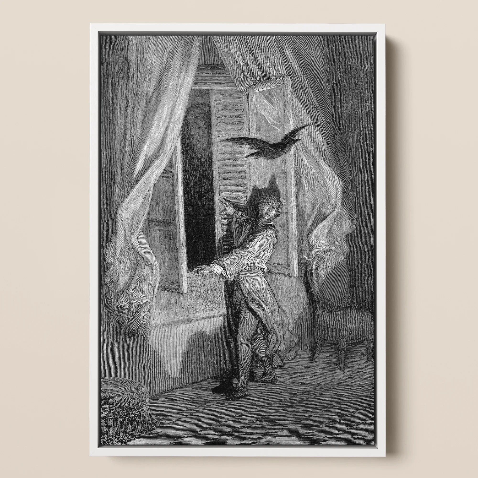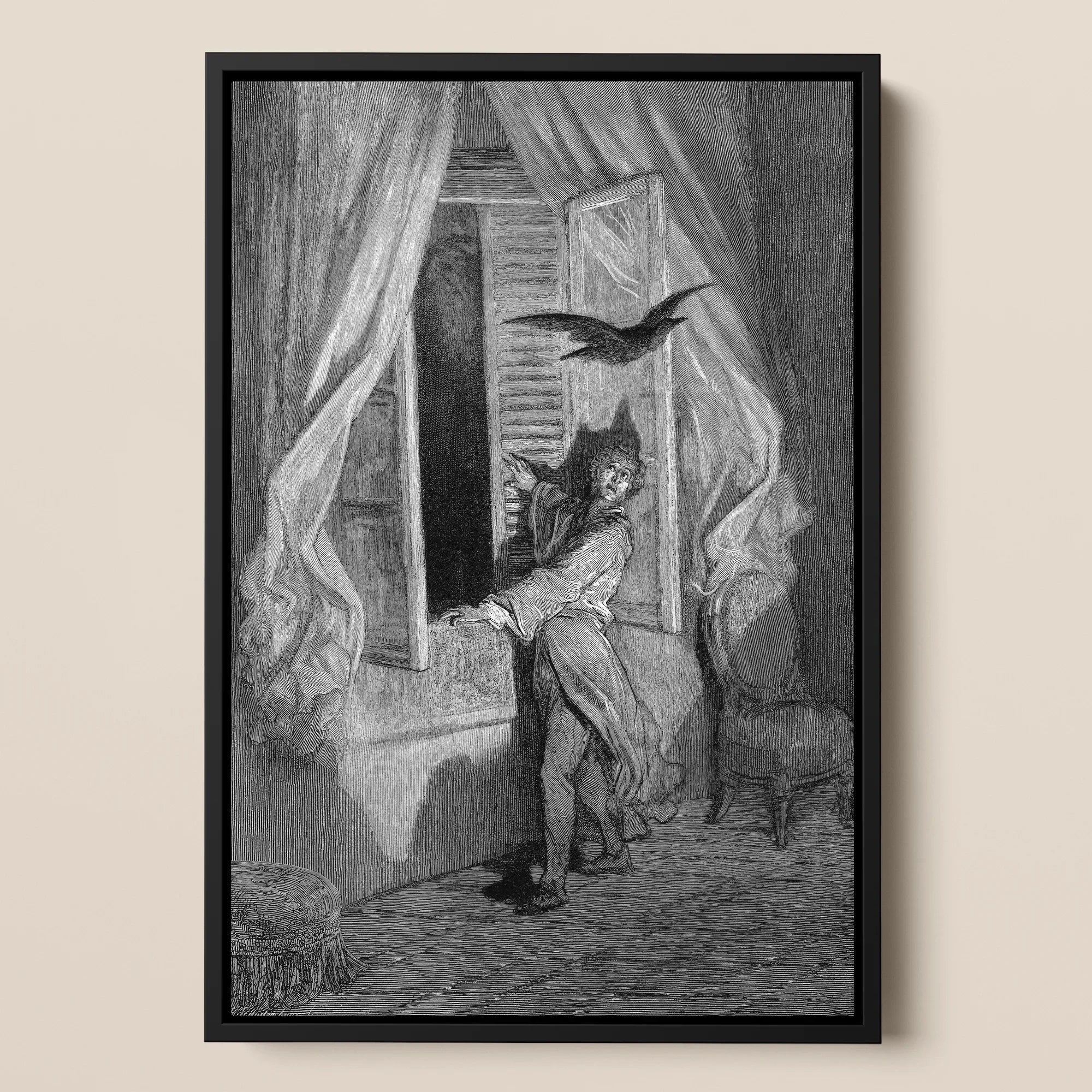 In Dorés Gravur verhält sich die Nacht wie ein Gedanke: rekursiv, unerbittlich, lebendig. Der Gelehrte lehnt sich vor, das Gesicht vor Erschöpfung gezeichnet, die Augen fixieren den imperialen Vogel, der auf der Büste erstarrt ist. Um sie herum schwellen die Vorhänge, als ob die Wände Trauer atmen.