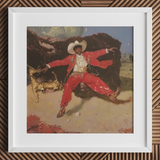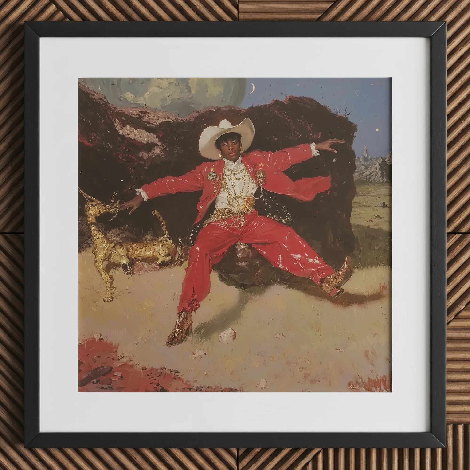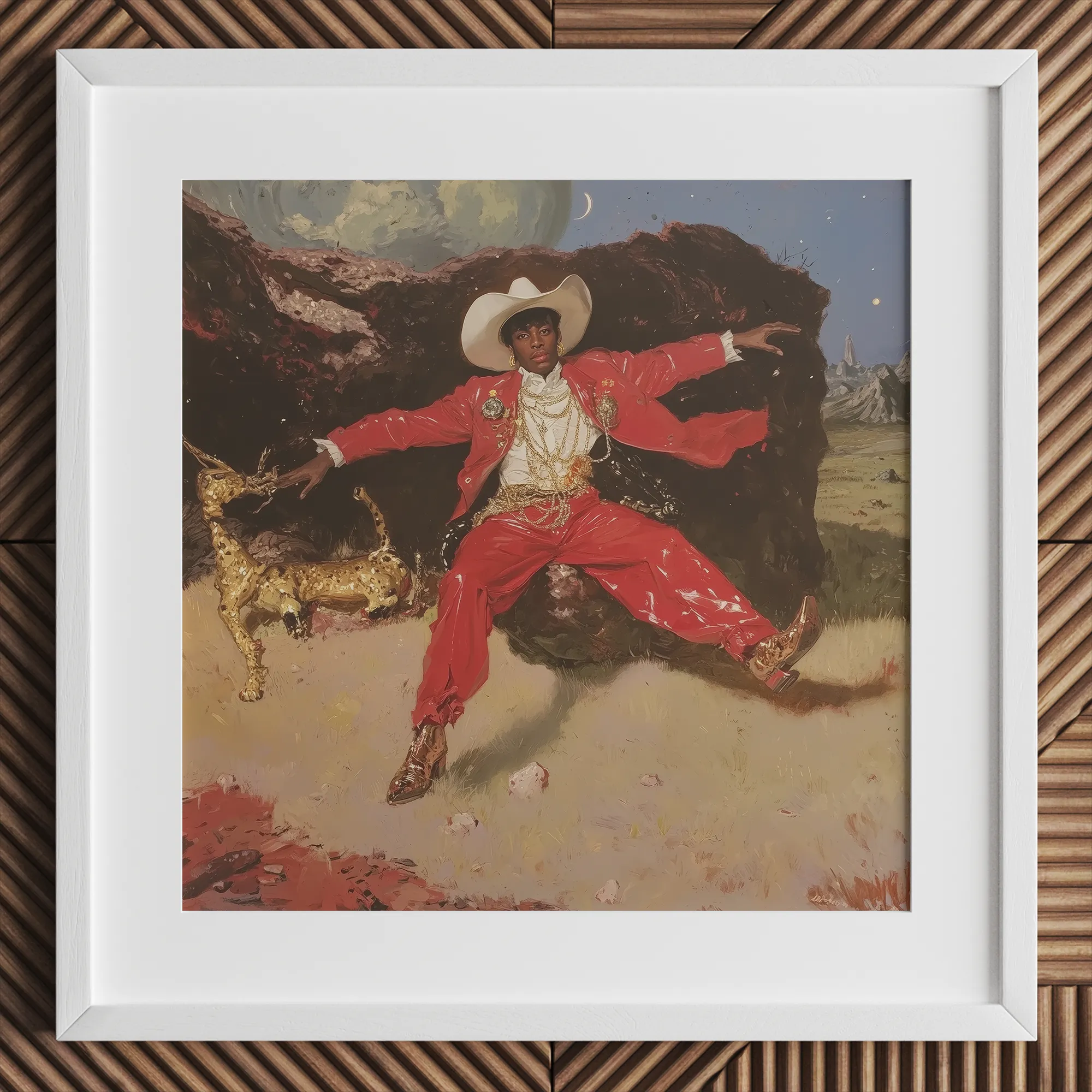 Ein schwarzer Cowboy inszeniert ein Modeporträt in einem roten Satanzug, der weiße Stetson genau so gekippt, Goldschmuck tropft wie Hitze. Die Pose landet auf einem umbrafarbenen Felsen mit Laufsteg-Schwung und Outlaw-Energie. Ein vergoldeter Windhund schnüffelt an seiner Hand, teils Charme, teils Wächter.