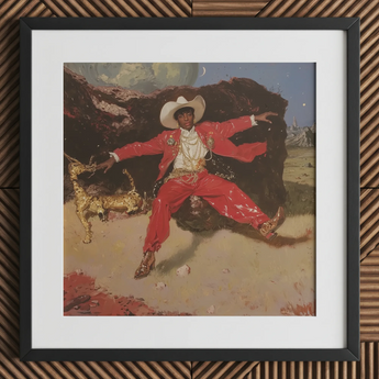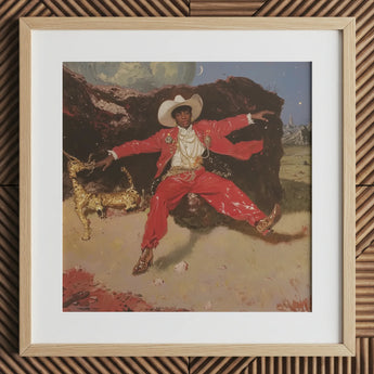Dies ist der queere Westen, neu geschnitten für heute, afro-diasporischer Stil, der mit dem filmischen Western-Mythos vernäht ist. Rote lackierte Hosen weiten sich, spitze Schuhe funkeln, ockerfarbener Staub hebt sich. Ein High-Fashion-Cowboy tritt vor, und die Nacht öffnet sich seinem Schwung.