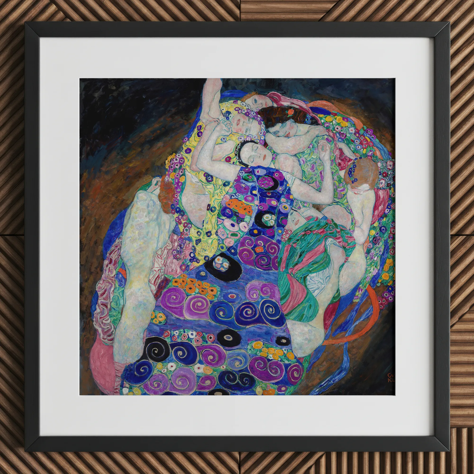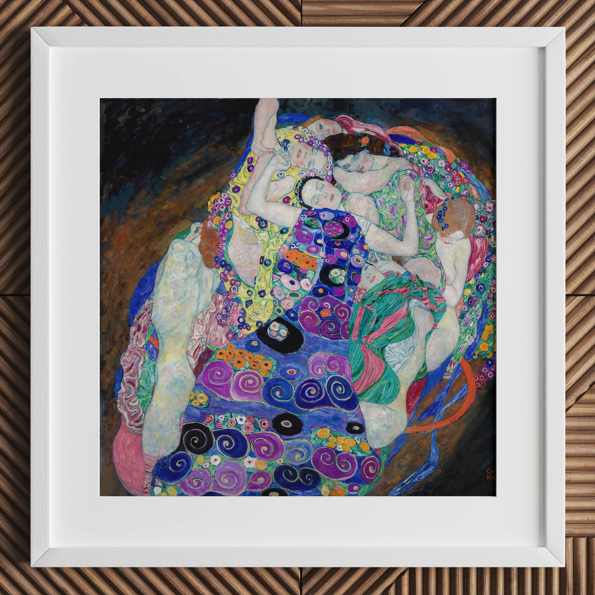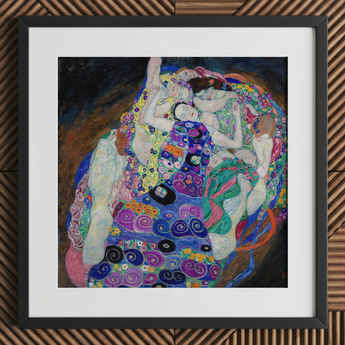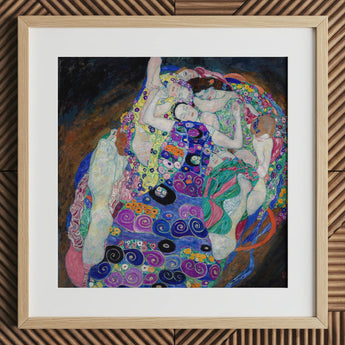 Tauchen Sie in Klimts kaleidoskopischer Reich mit "The Virgin" ein Kunstdruck. Sie werden auf einen wirbelnden Wirbel aus weiblichen Formen stoßen, der in einen hypnotischen Tanz aus Farbe und Muster verbunden ist.