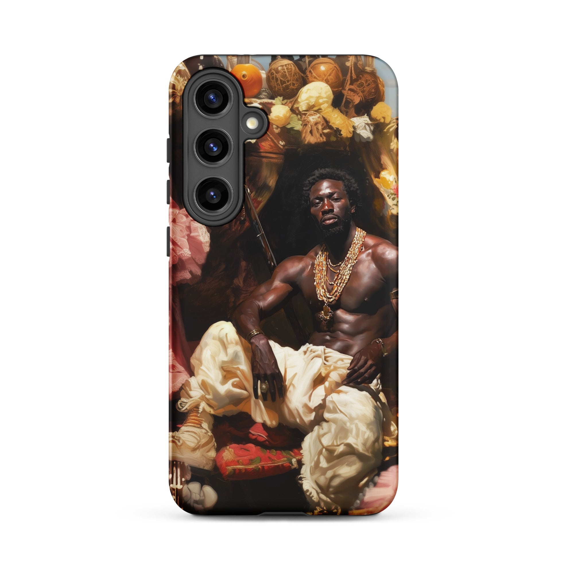 Seine Hand ruht auf dem Griff unsichtbaren Stahls, eine Erinnerung daran, dass Schönheit ein Akt der Eroberung sein kann. Diese Samsung-Hülle hüllt Ihr Gerät in die Prahlerei der schwarzen queeren Souveränität, ein Porträt, in dem jedes Detail mit dem Gewicht von Schätzen leuchtet.
