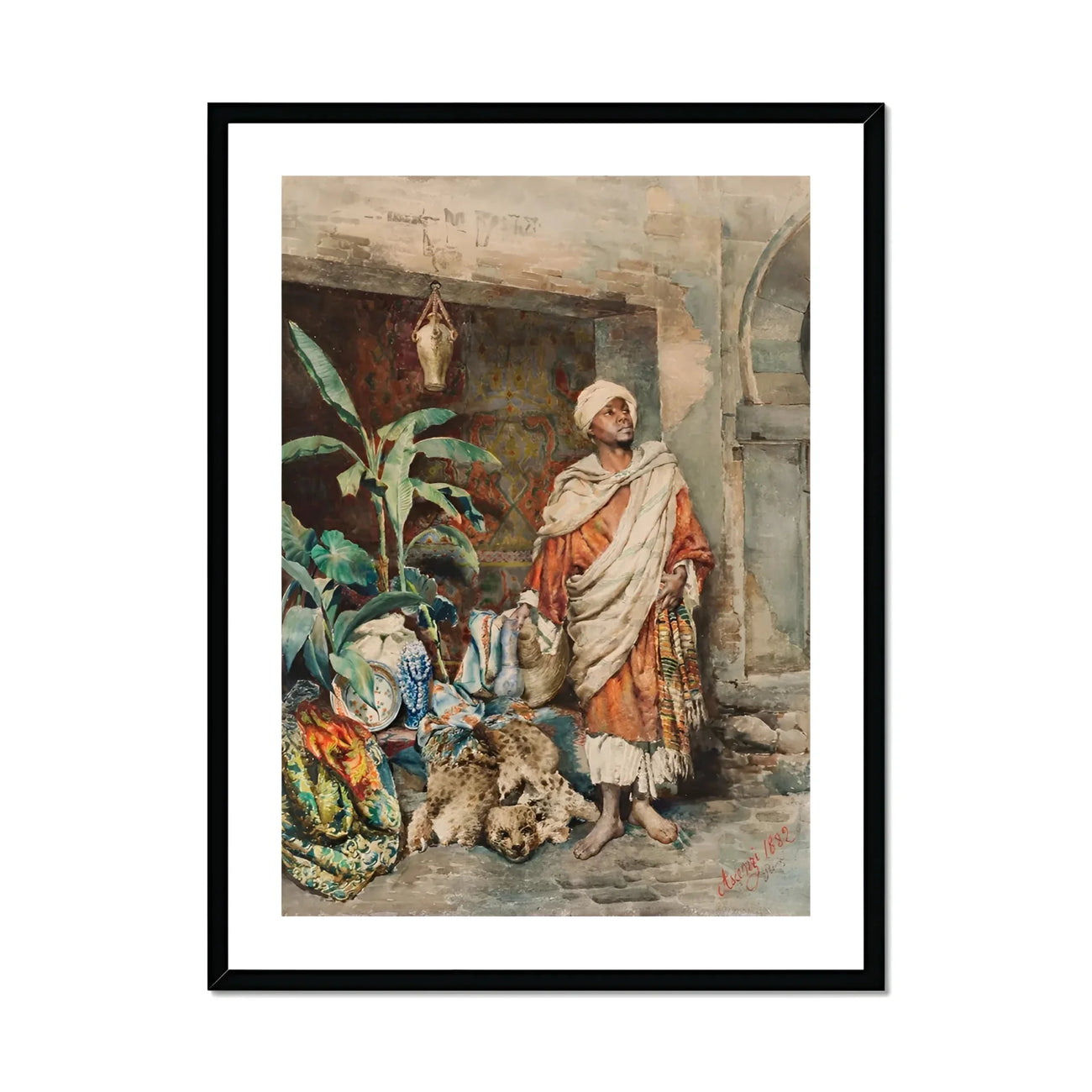 Gewebte Waren, getränkt in Karminrot und Jade, fallen neben ihm herab. Ein Wandteppich aus Handel und Blick. Eine Stille, angespannt mit ungesagtem Gewicht. Die hängende Urne, der maurische Bogen, der abgenutzte Ziegel, der Verfall murmelt - jeder ein Register in einer visuellen Ökonomie von Imperium, Besitz, Stolz. Seine Präsenz stabilisiert die Szene: eine Figur, die zugleich Händler und Denkmal ist, gekleidet nicht nur in Stoff, sondern in den Jahrhunderten, die er trägt.