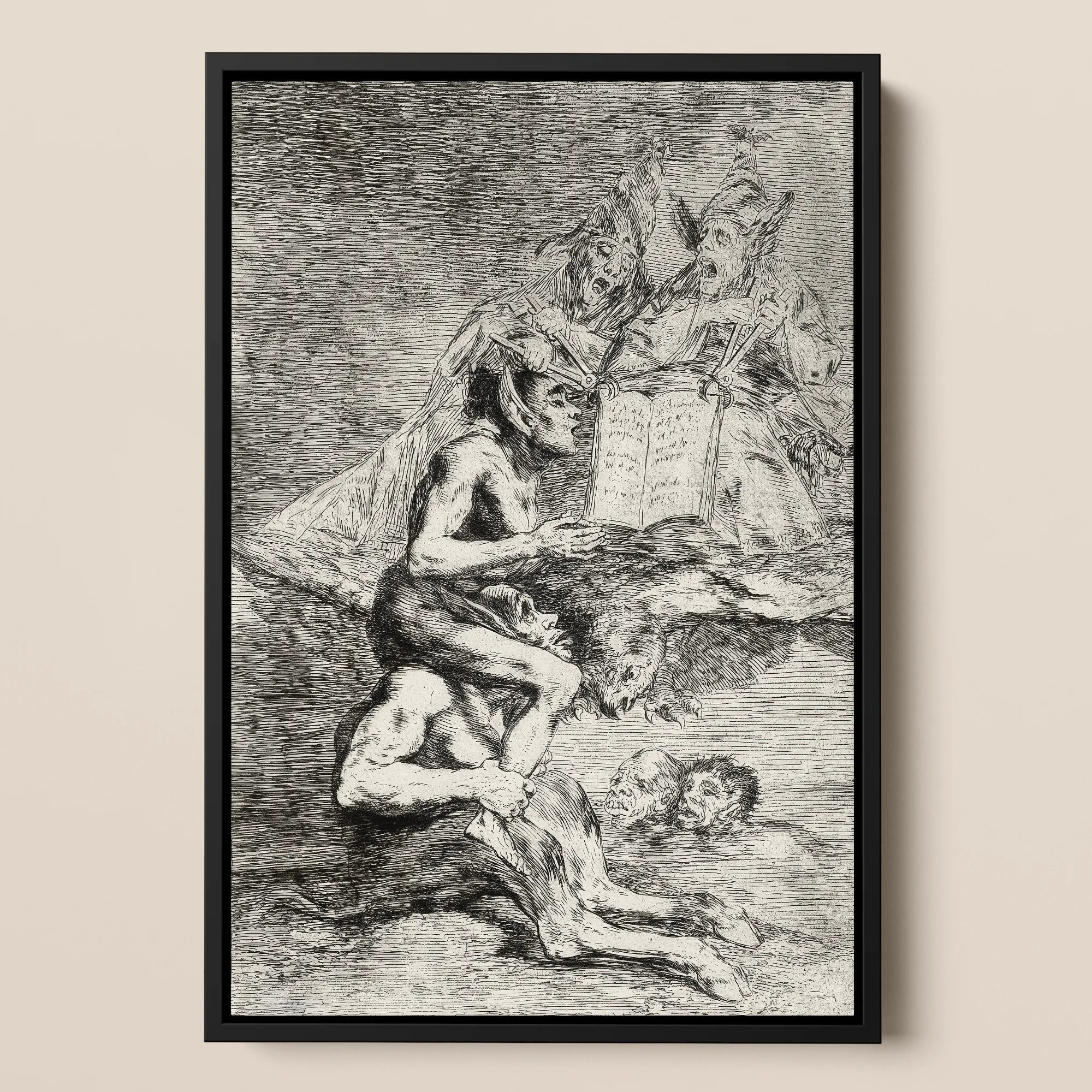 Eine nackte Hexe auf den Schultern eines Monsters - Francisco Goya Gerahmte Leinwand