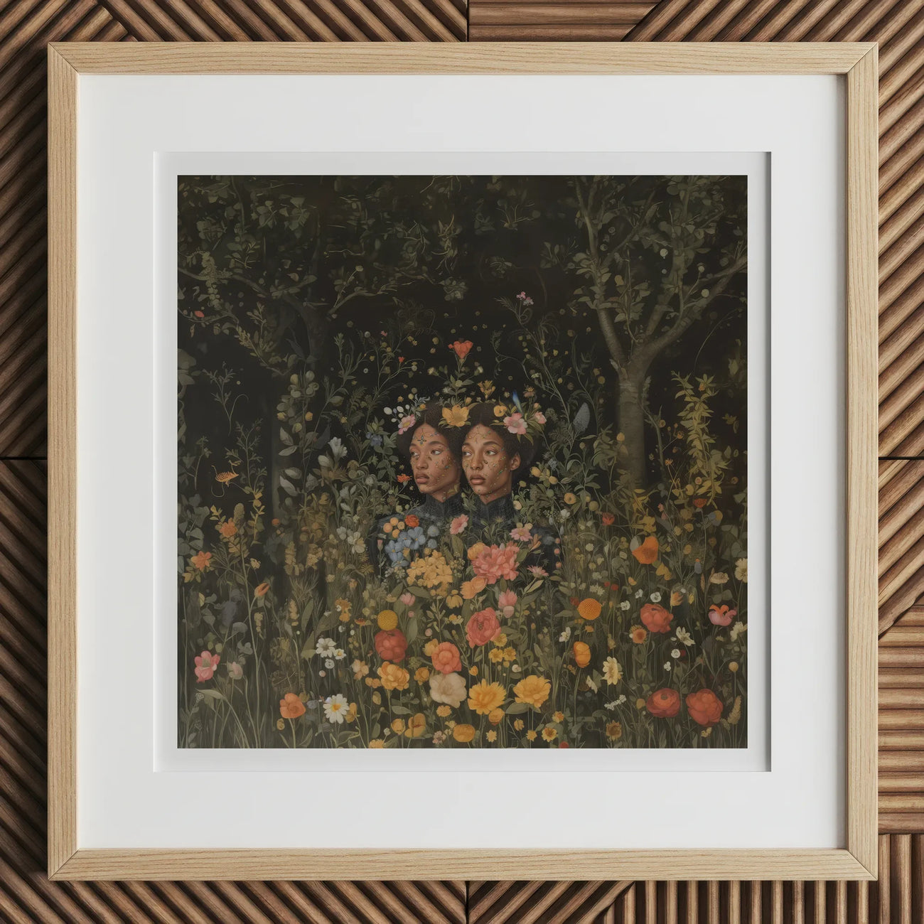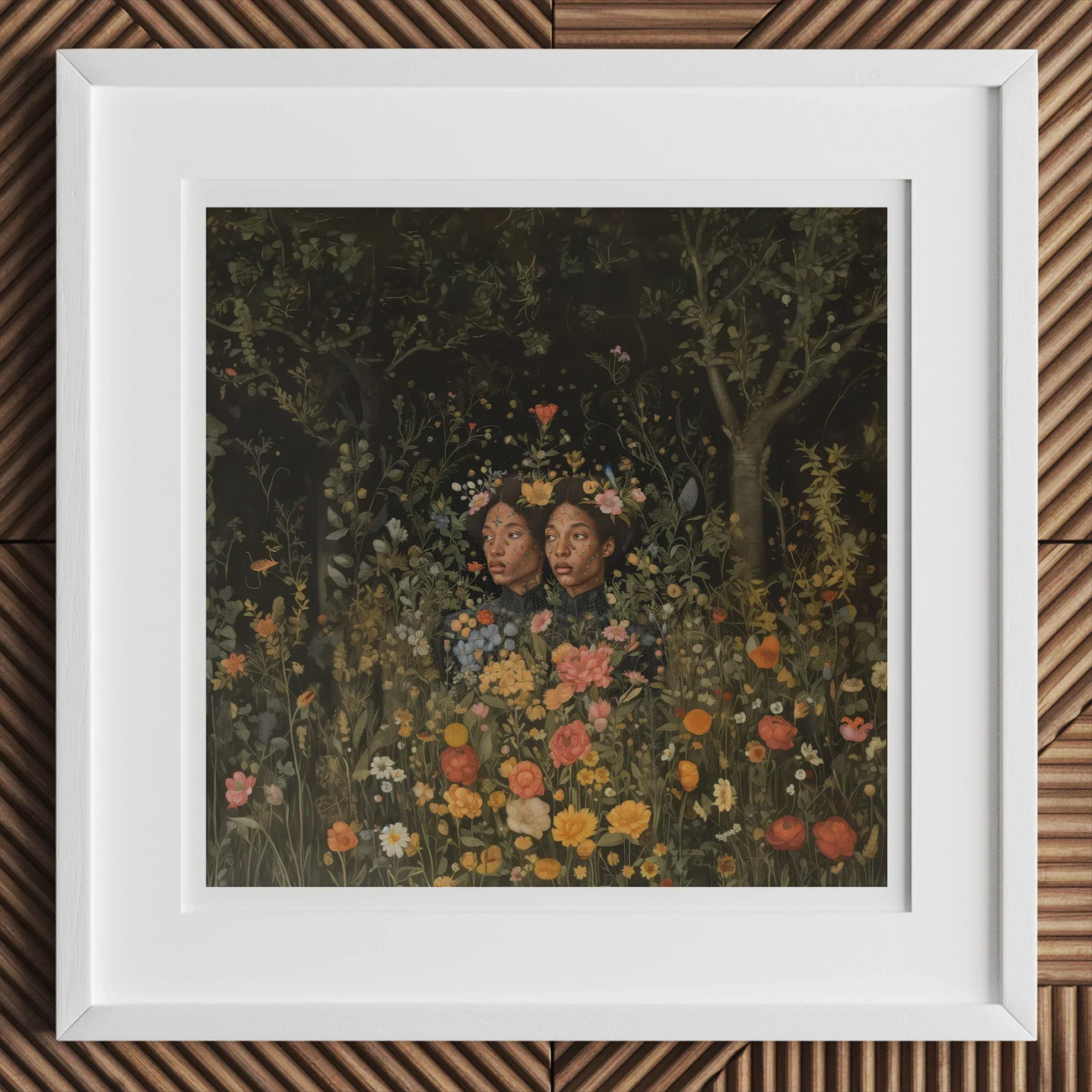 Zwei gespiegelte Seelen erheben sich aus einem Garten des stillen Feuers—Schwarz, transgender, leuchtend. Ihre Gesichter, mit zarten Blumen verwoben, lösen sich in die Umarmung der Natur auf, als hätte die Zeit selbst sie ins Dasein geflüstert. Mitternachtsschatten wiegen ihre Formen, während goldene Blütenblätter wie Sternbilder über ihre Haut klettern und eine heilige Abstammungslinie der Widerstandsfähigkeit und Wiedergeburt nachzeichnen.
