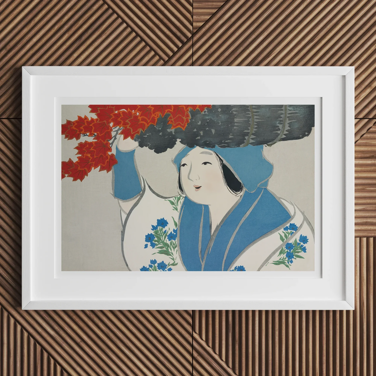 Befragen Sie Ihre Augen auf die cerulean-krobierte Gestalt, ihre Gentianed Kimono Eine Leinwand der Eleganz. Staunen Sie die Tiefe der Wärme und das Gefühl, dass wir in ihrem ruhigen Gesicht sehen. Ein Beweis für Sekkas minimalistisches Genie. Der scharlachrote Ahorn verlässt in lebhaftem Kontrast über ihrem Tanz, während das inky graue Schiff, das sie trägt, Bände über den hellen Tag vor sich spricht - mit purpurroten Schätzen beladen.