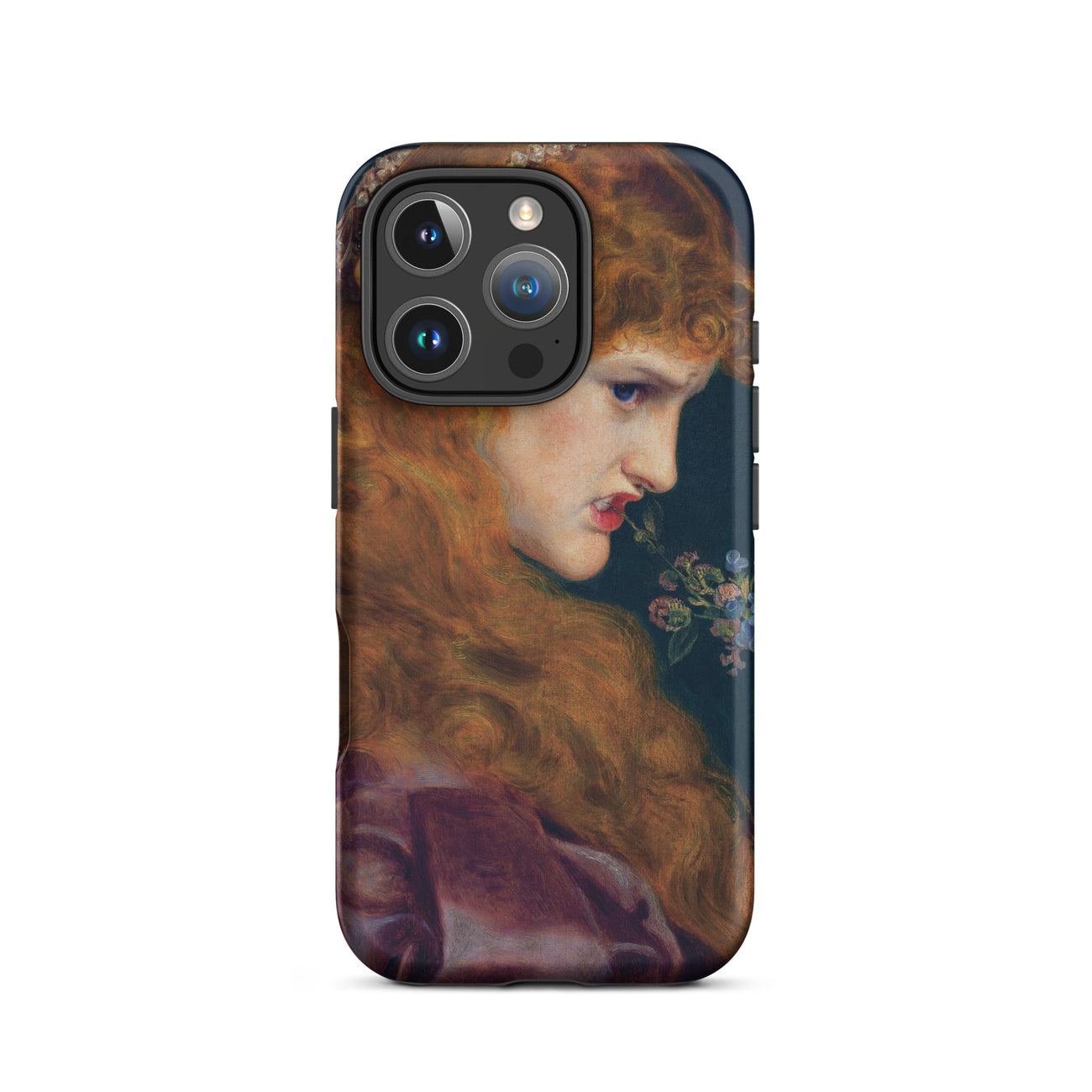 Auf diesem Frederick Sandys iPhone-Hülle blüht Love's Shadow wie eine Giftblume: mythenumwoben, samtig-lippig, unbußfertig. Rotes-goldenes Haar fließt wie ein Lauffeuer über reiches, purpurrotes Samt, umrahmt ein Profil, das aus leuchtenden Hauttönen und stiller Trotz geschnitzt ist. Ein Zweig von Veilchen und Flieder, zart in ihrem Griff, verrät die Gefahr: Circes Blick in einer Mädchensmaske, Lamias Hunger, der nach Frühling duftet.