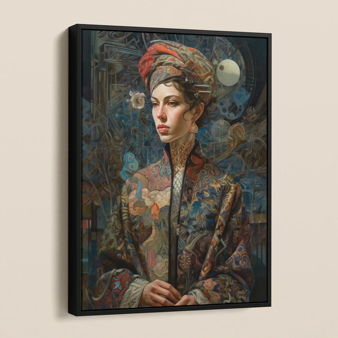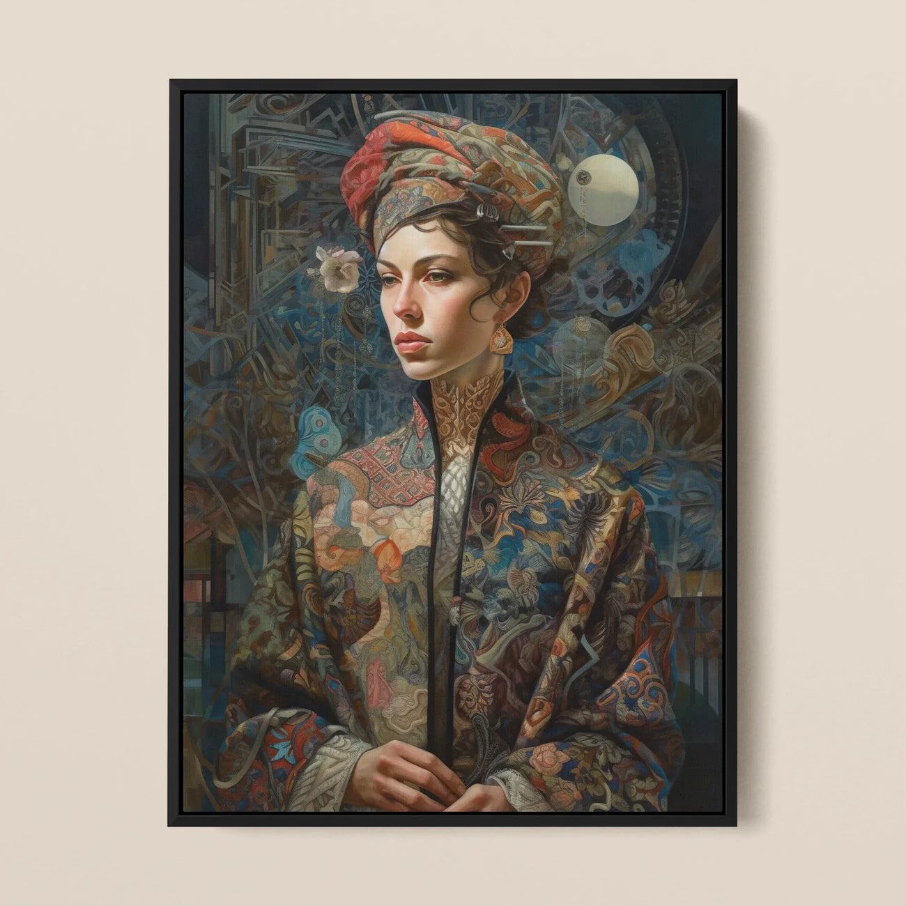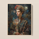 Ihre Gewänder—gewebt mit vergoldeter Filigranarbeit und mythischen Bestien—sind nicht bloß Stoff, sondern eine Karte des Ahnen-Gedächtnisses. Die Sigillen der altnordischen Mythologie schlängeln sich durch bestickte Fäden, deren Bedeutung verschleiert ist und darauf wartet, enthüllt zu werden. Zahnräder glühen im Hintergrund, die Überreste einer verlorenen Zivilisation oder die Blaupausen eines Zeitalters, das noch kommen wird. Hier kollidieren Fantasie und Folklore, ein ätherisches Steampunk-Wandkunst-Meisterwerk, das nicht einfach nur schmückt—es fesselt.