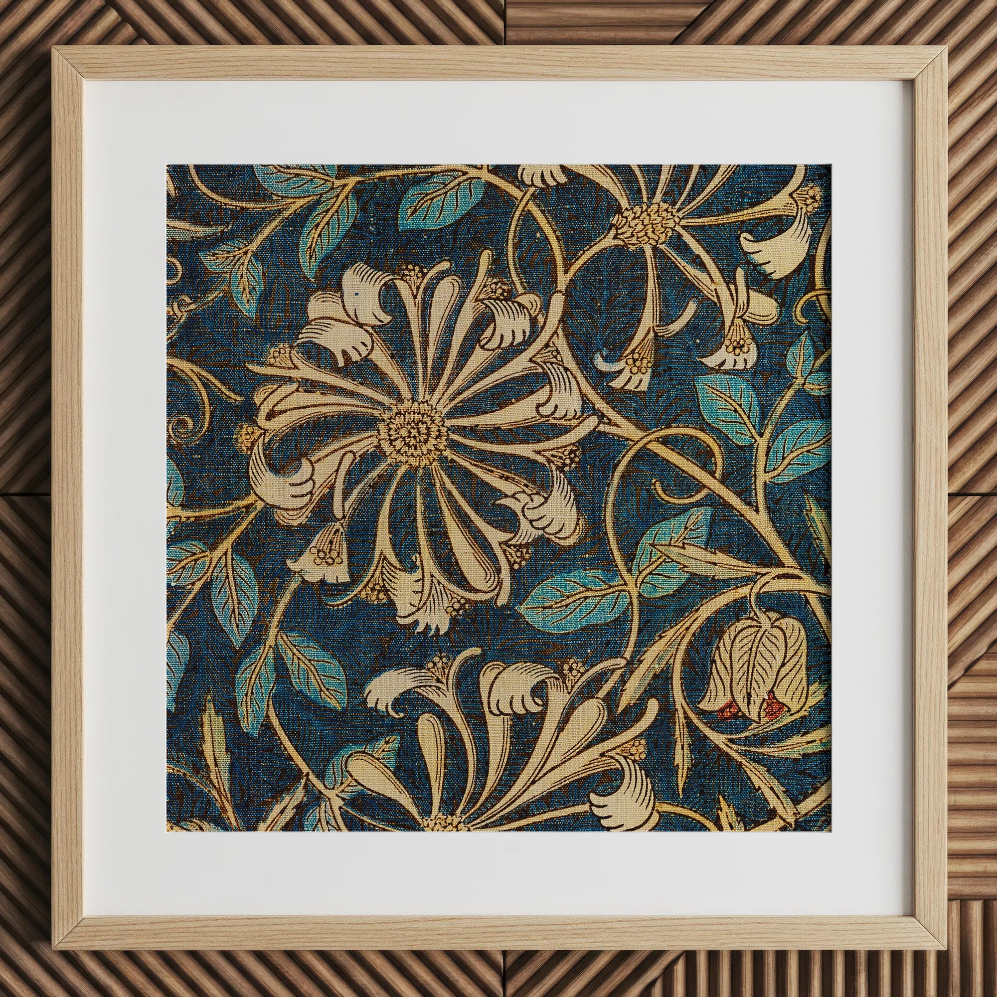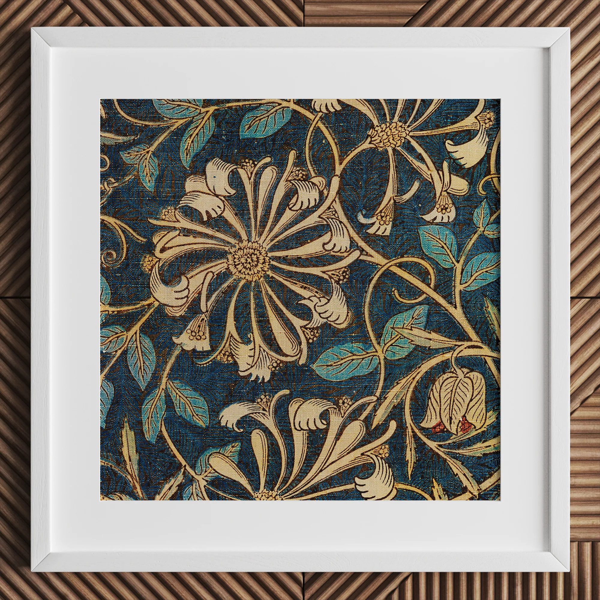 Treten Sie in eine Welt der viktorianischen Eleganz mit diesem Geißblattmuster Kunstdruck. Sie werden vom rhythmischen Tanz von goldenen Blüten gegen eine Tiefe begeistert sein Marine Hintergrund.