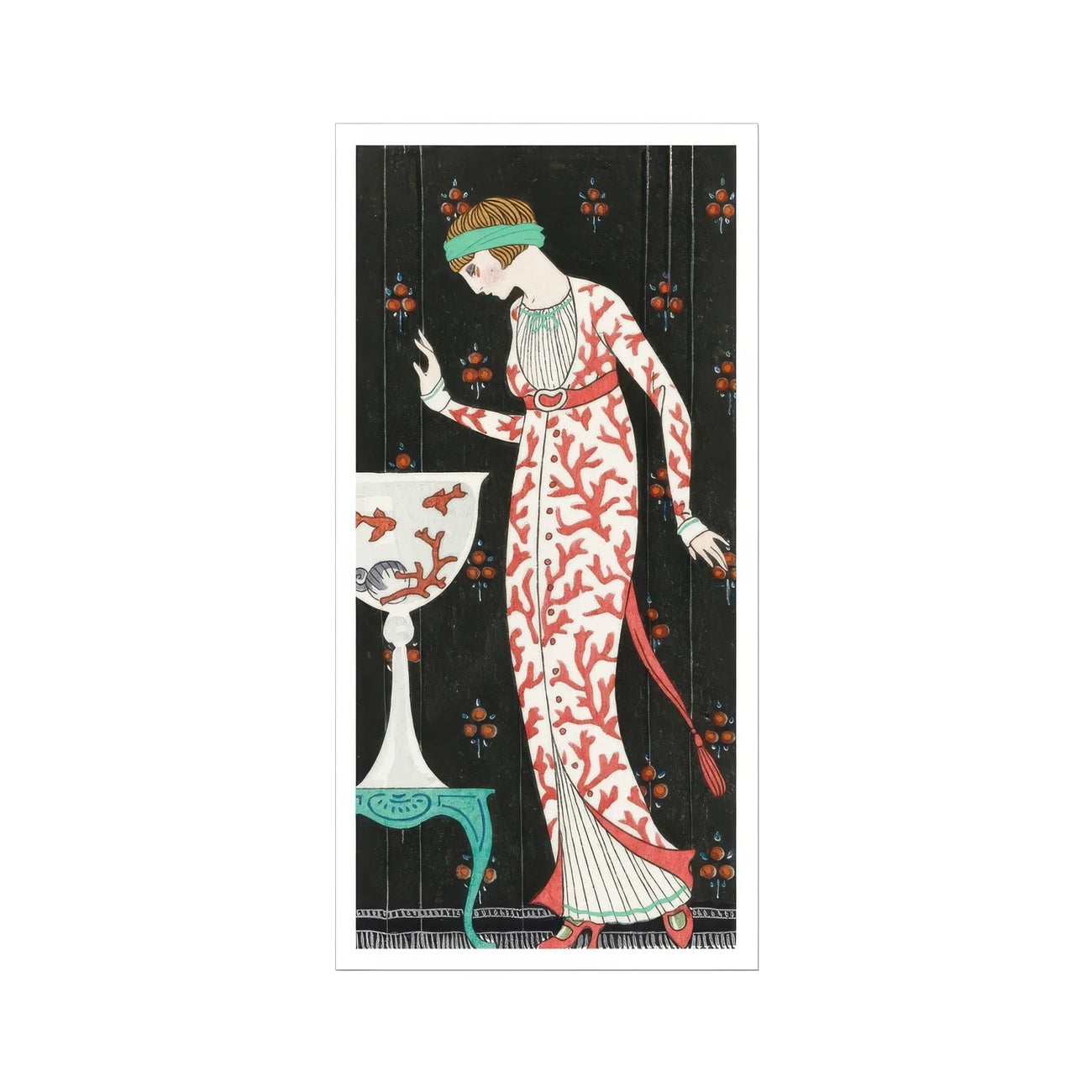Dieser hochauflösende Kunstdruck versetzt Sie in die Blütezeit der Pariser Haute Couture, wo avantgardistisches Design auf zeitlose Raffinesse trifft. Die filigranen Details – vom verspielten Touch der Goldfischschale bis zum aquilinen Profil des Modells – zeigen Barbiers unvergleichliches Talent, Modeillustration mit bildender Kunst zu verbinden.