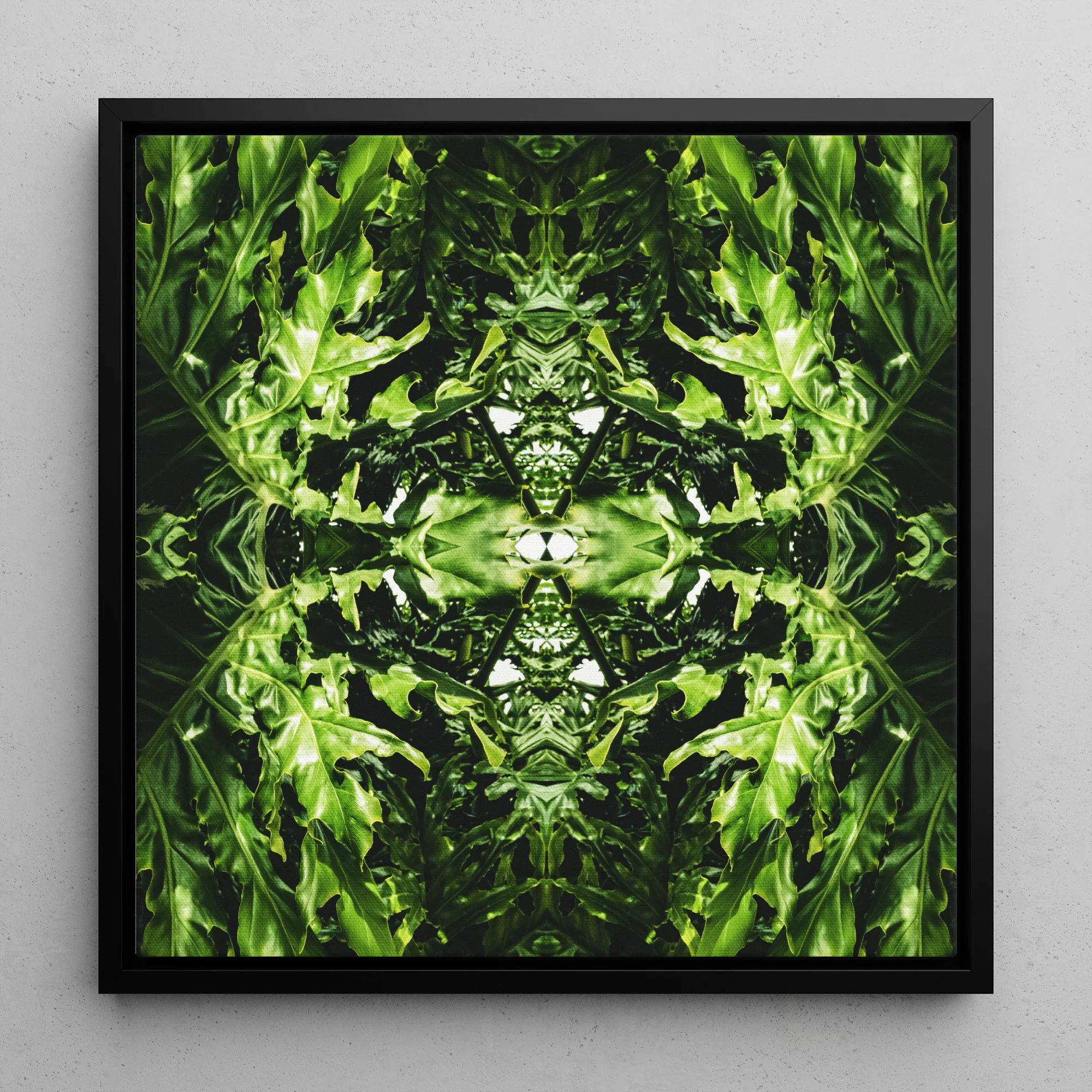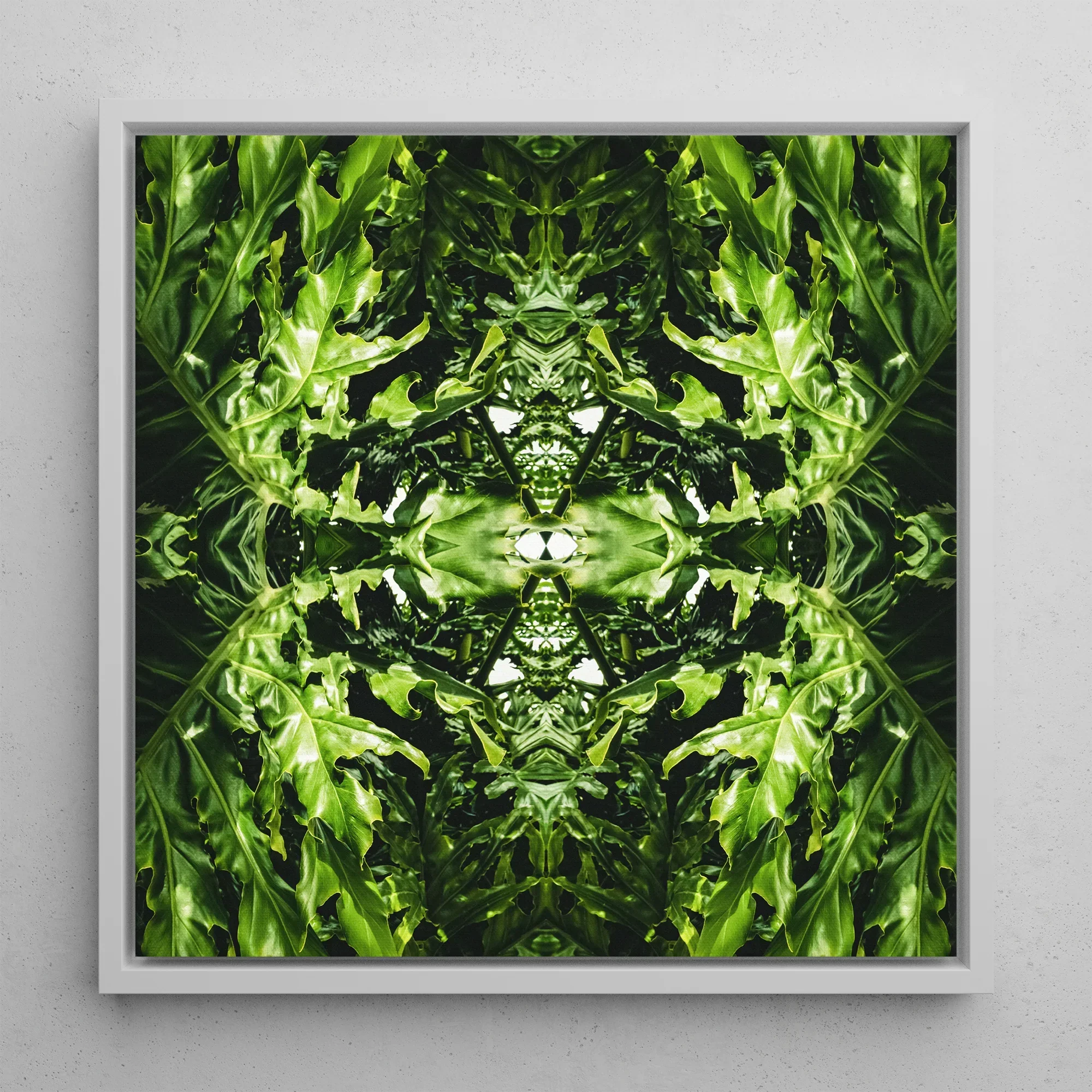 Betrachten Sie eine schwebende gerahmte Leinwand, die Ihre Wand in eine lebendige, atmende botanische Matrix verwandelt. Dieses hypnotische Kunstwerk beschwört einen Wirbel herauf, in dem gespiegelte Blätter in perfekter Symmetrie tanzen, ihre smaragdgrünen Ränder durch den Schleier der Realität schneiden.