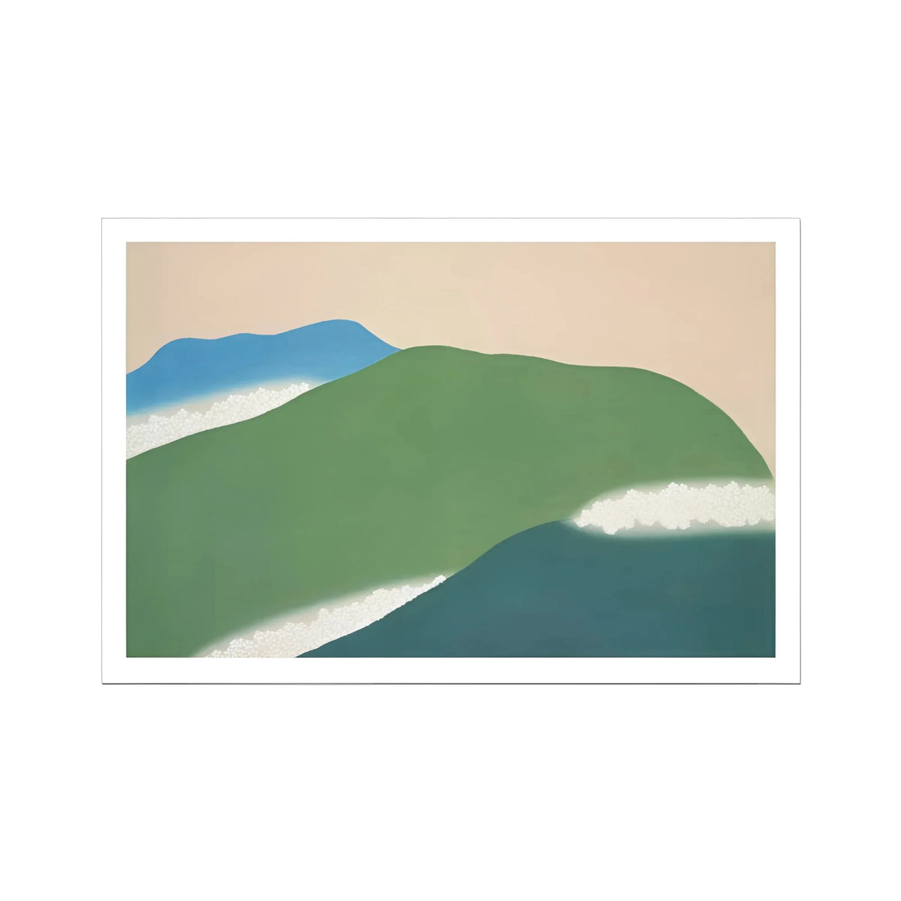 Der Horizont gibt seine Konturen einem Hauch von Pigment preis: Celadon, das in Malachit übergeht und sich in fernes Blau auflöst. In Green Mountains destilliert Kamisaka Sekka die Erde in eine Wellenform. Es gibt keine Bäume, keine Schatten, keine Spur von Besiedlung—nur die Kurve der Erhebung als sichtbare Erinnerung. Blasser Schaum verziert die Falten wie leiser Atem über Seide und deutet auf Wolken, Nebel oder das unübersetzbare Zittern der frühen Morgenluft auf dem Bergrücken hin.