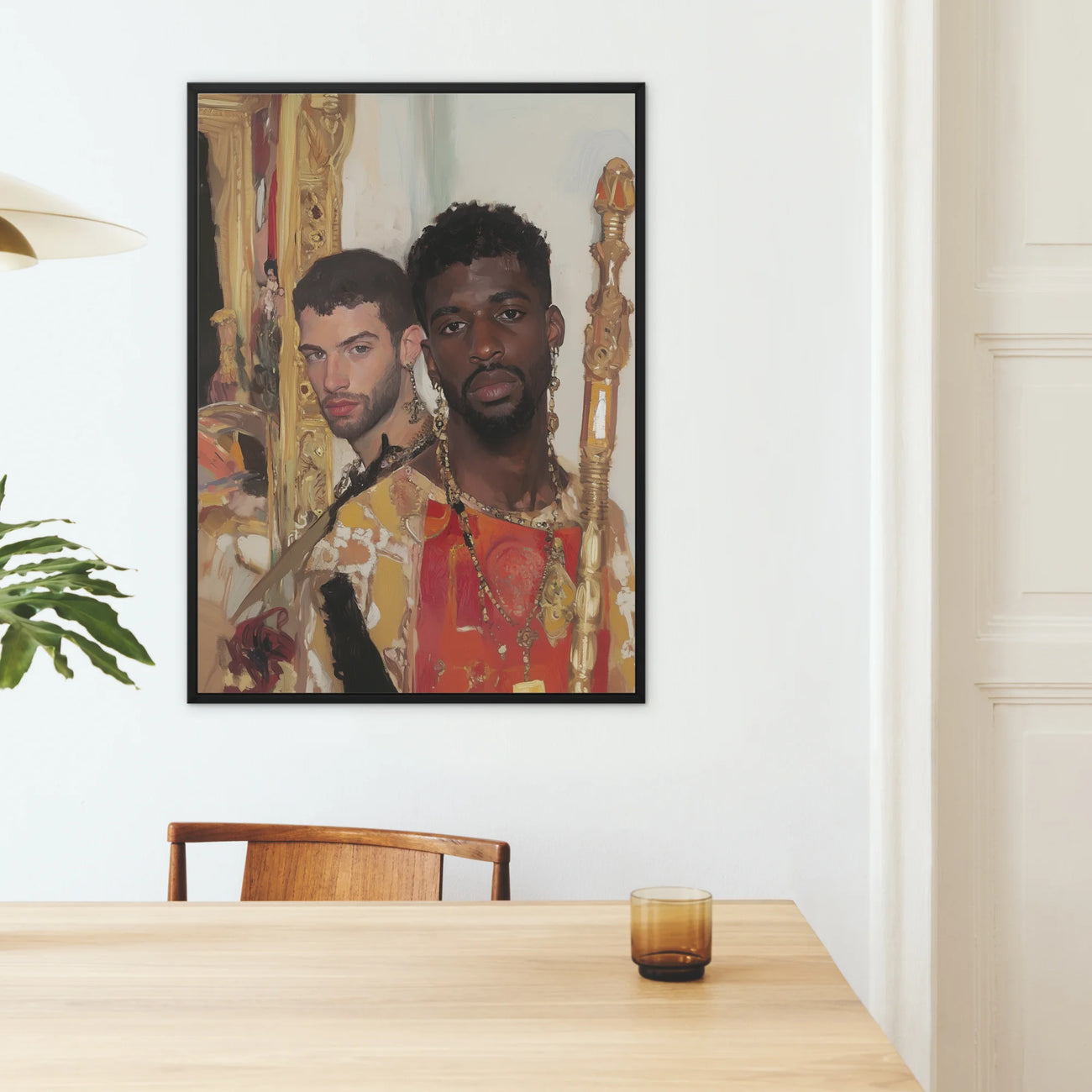 Die vergoldete Welt verschlingt die Zeit selbst. Barocke Opulenz fließt in zeitgenössische Sinnlichkeit, jeder Pinselstrich eine Kollision von Vergangenheit und Gegenwart. Ist dies ein Renaissance-Stil schwules Porträt oder etwas Älteres, Tieferes. Die Textur—dick, malerisch, unbußfertig—fühlt sich an wie die Berührung der Geschichte, die sich nah herandrängt und flüstert: Liebe ist das einzige Imperium, das niemals fällt.