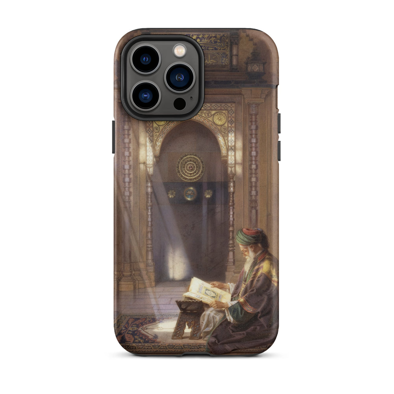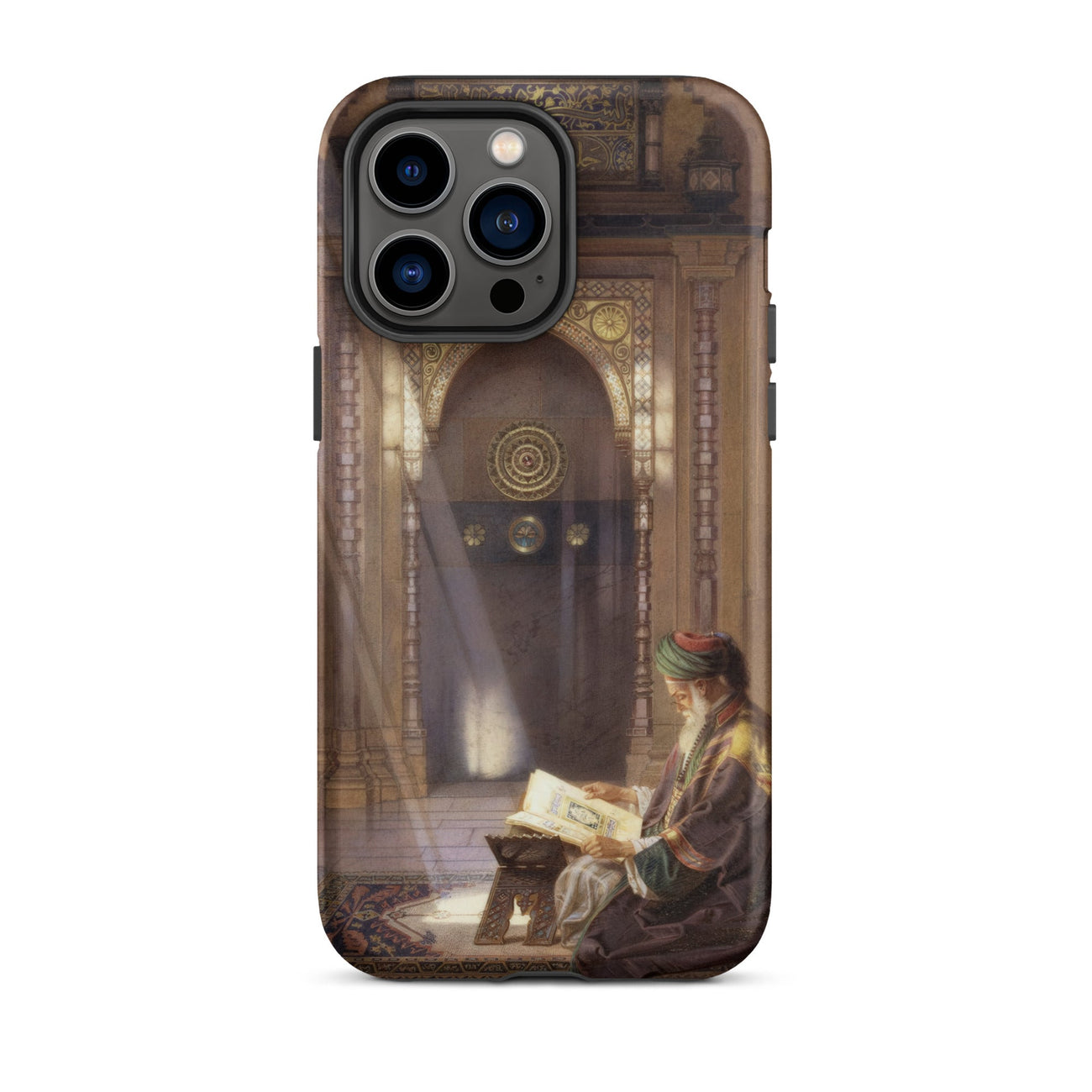 Unter gewölbten Bögen, die den Atem der Jahrhunderte murmeln, ergießt sich das Licht wie rezitierte Verse—diagonal, bedacht, göttlich. Diese Carl Friedrich Heinrich Werner iPhone-Hülle fängt einen Moment ein, der weder gestellt noch passiv ist: Ein Gelehrter sitzt, der Umhang wie Tinte über den Stein gegossen, die Schriftrolle entfaltet sich vor ihm, als wäre sie von innen beleuchtet. Die Moschee erhebt sich um ihn herum—nicht als Kulisse, sondern als Heiligtum—ihre islamische Architektur pulsiert mit heiligem Rhythmus: Muqarnas wie gebündelte Sterne, tessellierte Bögen, die die Namen Gottes in Geometrie flüstern.