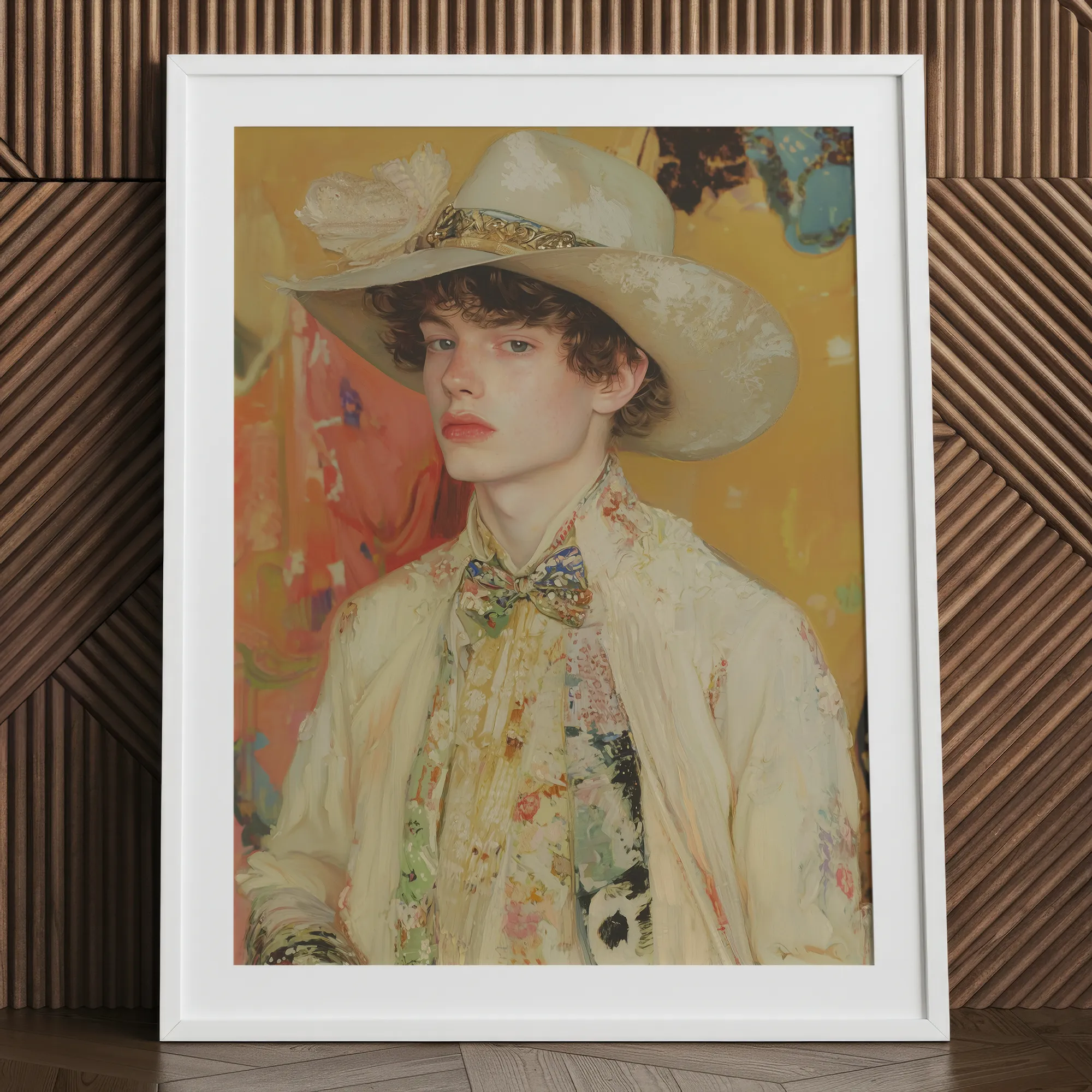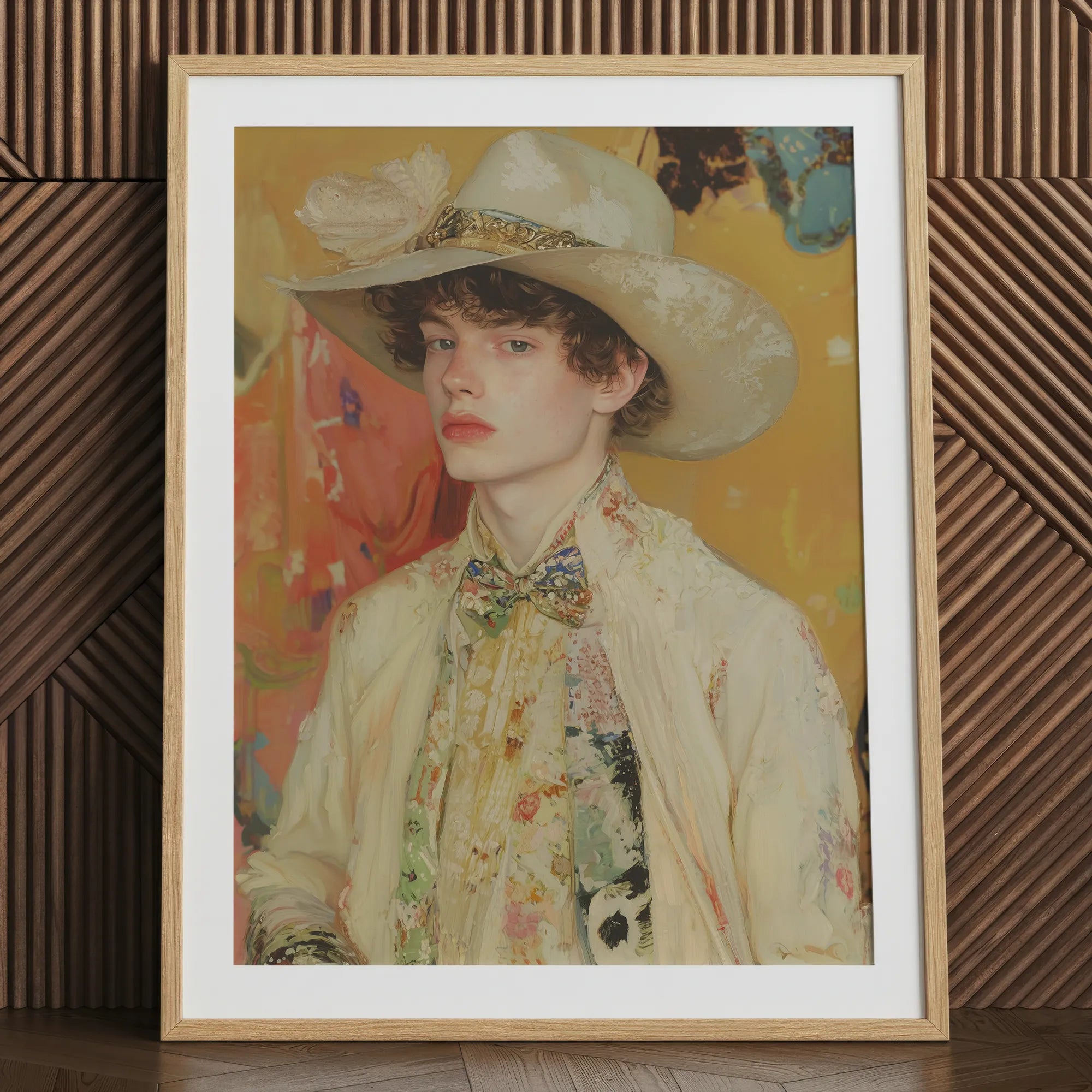 Jacob ist nicht an die Zeit gebunden. Er steht dort, wo sich die Geschichte faltet, wo der Wilde Westen mit den vergoldeten Salons der dekadentesten Epochen der Couture kollidiert. Seine Präsenz ist leise, aber unbestreitbar - sanfte Rebellion, gehüllt in Seide und Staub, ein schwuler Cowboy, aus Licht und Opulenz geschnitzt.