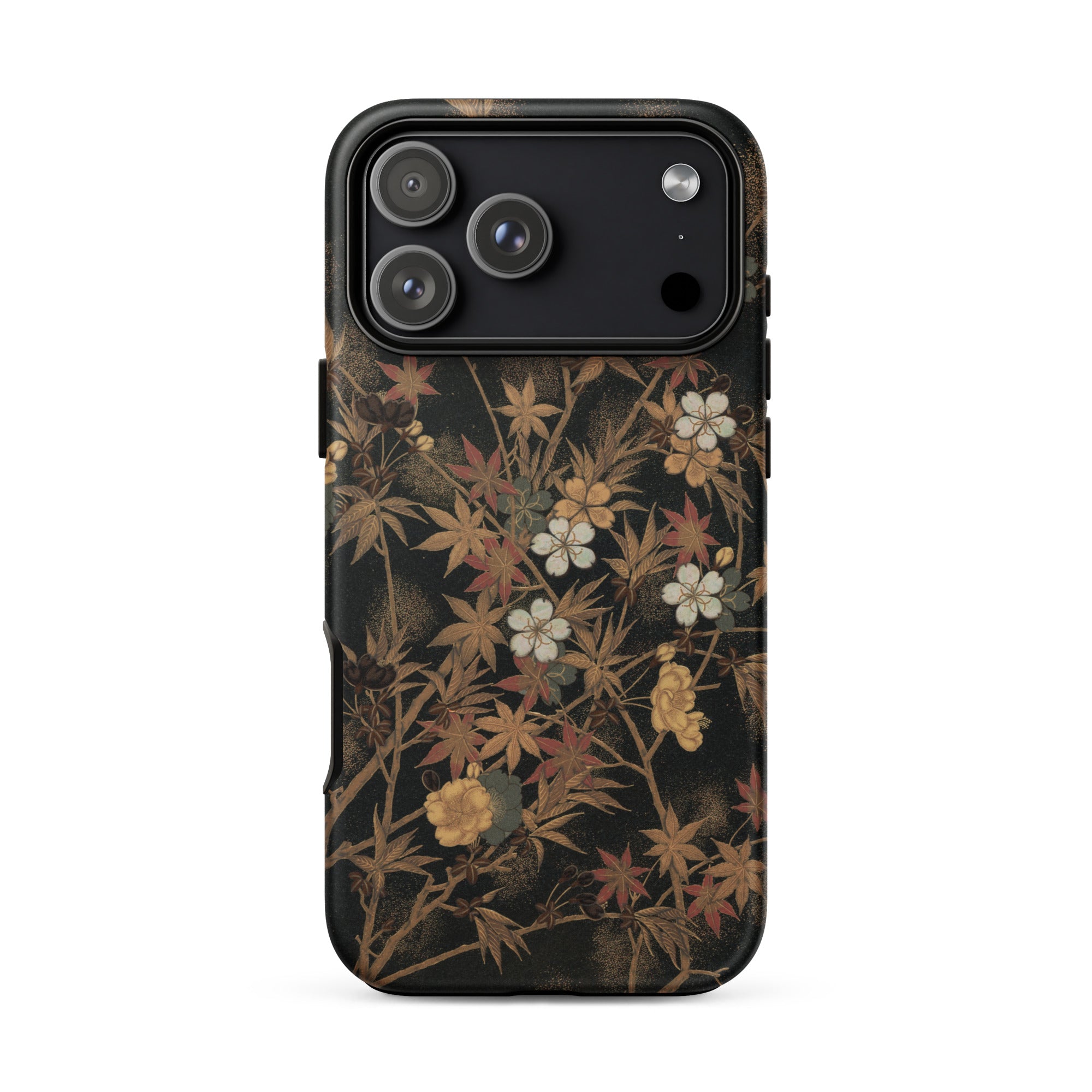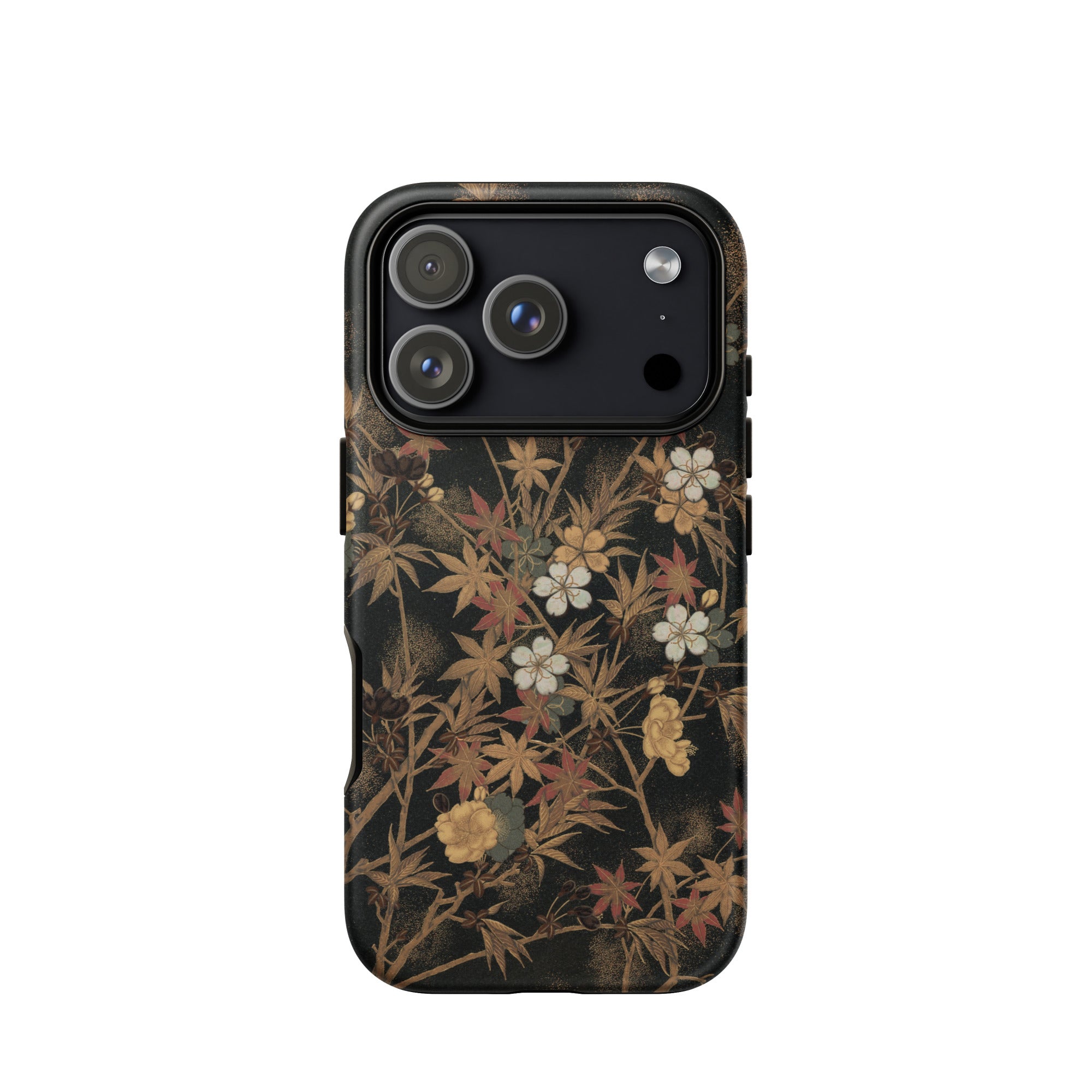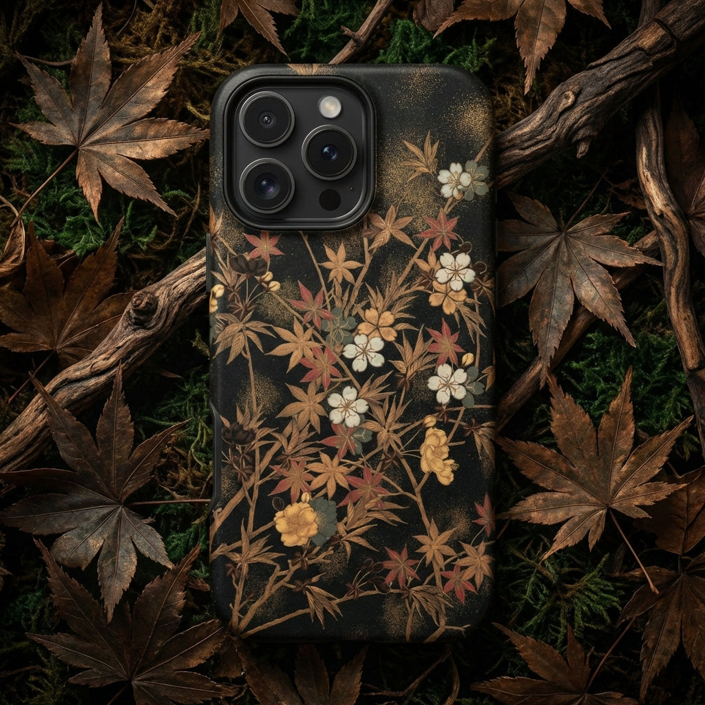 Diese atemberaubende iPhone-Hülle zeigt George Ashdown Audsleys Japanese Autumn Flowers, eine strahlende Ode an den Japonismus des 19. Jahrhunderts. Vor einem tiefschwarzen Hintergrund verweben sich zarte weiße Blüten und goldgelbe Blüten mit karminroten Ahornblättern (momiji) und rufen die vergängliche Schönheit des Herbstes hervor. Die vergoldeten Zweige, umrahmt von einem sanften goldenen Punktmuster, spiegeln das ätherische Schimmern der maki-e-Lackarbeiten wider und fangen das Zusammenspiel von Licht und Schatten ein.
